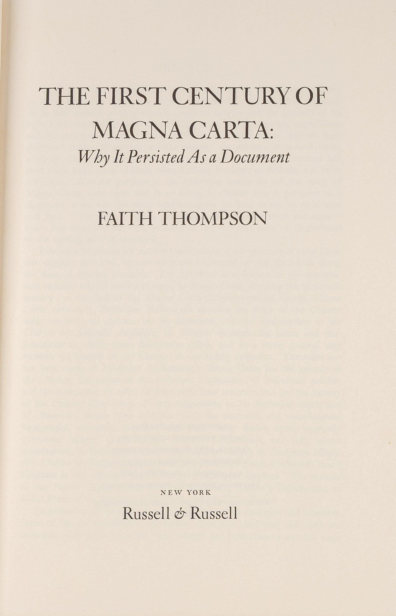 1967. Thompson, Faith. The First Century of Magna Carta: Why it Persisted as a Document.New York, Russell & Russell. 1967, 1925. ix, 123 pp. Original crimson cloth with gilt stamped spine. Ex-library with bookplate of Wilfrid Sidney Jessop to front pastedown. Color offset to endpapers, else near fine. $85.