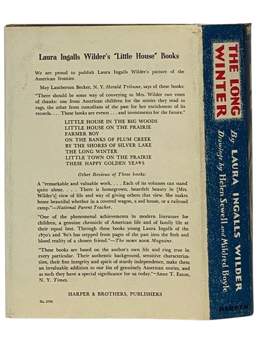 New York and London: Harper & Brothers, 1940. First Edition. Hard Cover. Good/Very Good. 0x0x0. Sewell, Helen; Boyle, Mildred. First edition with I-P code, in supplied original jacket. Front joint loosening, edges rubbed, ink name and address on frontispiece recto. 1940 Hard Cover. vii, 325 pp. Color frontispiece and black-and-white illustrations from drawings by Helen Sewell and Mildred Boyle. The fledgling town of De Smet in the Dakota Territory is hit hard by the brutal winter of 1880-1881. Laura, Pa, Ma, Mary, Carrie, and little Grace face the winter as best they can, but soon, blizzards have covered the town in snow that piles up to the rooftops, cutting the town off from supplies and trade. Food stores begin to run dangerously low. To save the town from starvation, young Almanzo Wilder and a friend brave the conditions, set off across the prairie in search of wheat, and return victorious. The town is saved, and the townspeople share in an unusual, but joyful, Christmas celebration.