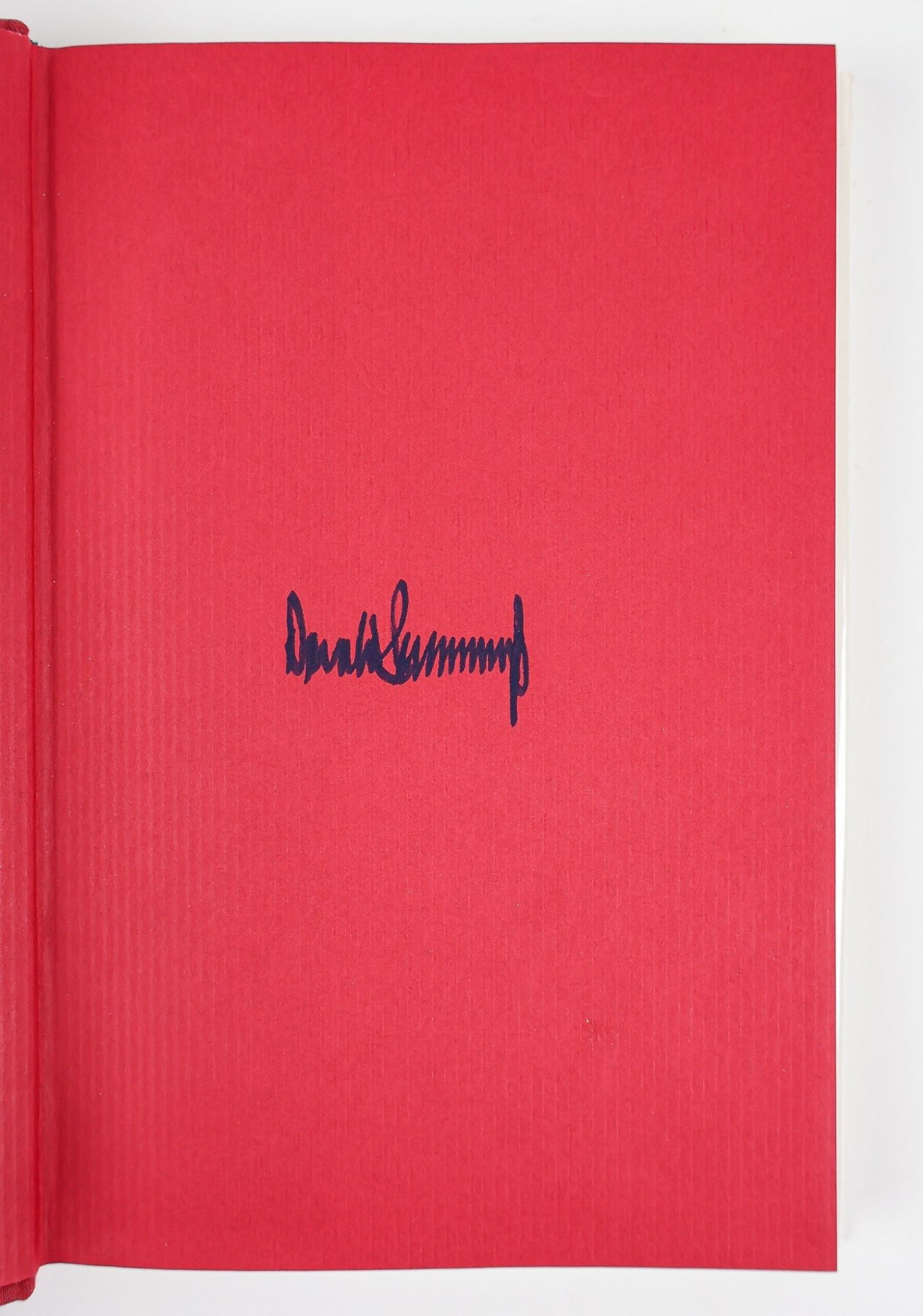 New York: Random House, 1990. First Edition, First Printing. Hardcover. Octavo, xiv, 236 pages, plus [16] pages of captioned photographs. In Very Good plus condition. In red cloth quarter binding with white paper boards; dust jacket white with red titling, wrapped in a new archival mylar sleeve. Jacket shows very mild wear, with slight wrinkling at the base of the spine. Boards show similar very mild shelf wear, with light bumping to the tail. Text block clean. Signed flat in black marker by Donald Trump on front flyleaf. Shelved case 1 1/2. 1407500. Shelved Dupont Bookstore.