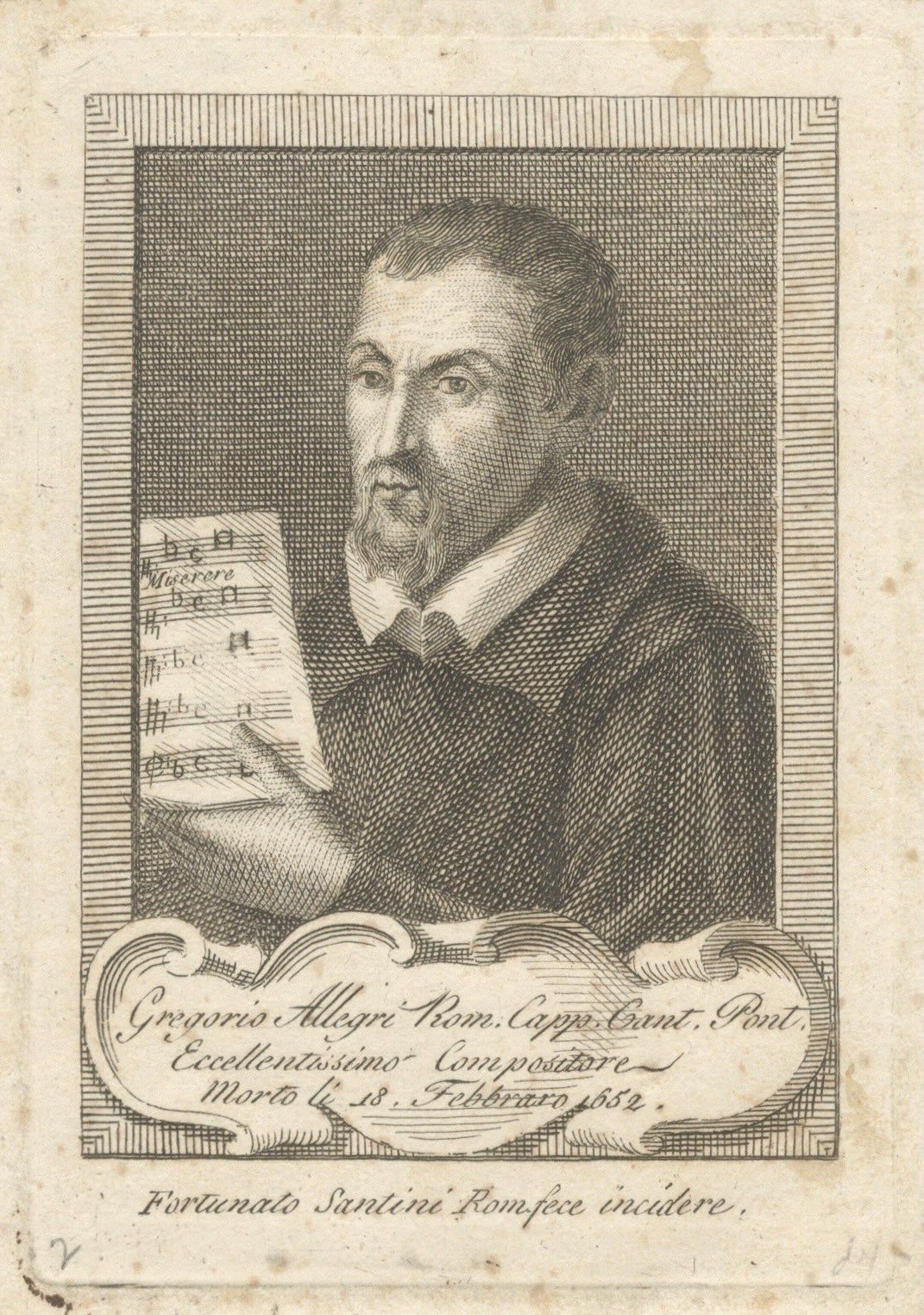 Image size to platemark 122 x 83; sheet size 131 x 93 mm. Long bust-length image of the composer holding a sheet of music of his noted "Miserere" with his left hand within a rectangular border with three lines of biographical text to cartouche below and "Fortunato Santini Rom. fece incidere" under image.