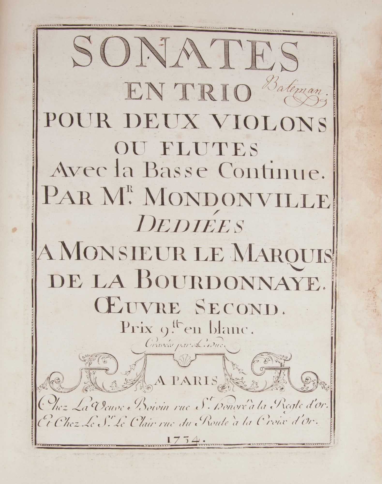 Sonates en Trio Pour Deux Violons ou Flutes Avec la Basse Continue ... Dediées a Monsieur le Marquis de la Bourdonnaye. Œuvre Second. Prix 9₶. en blanc. Gravées par L. Hue. Paris: Chez La Veuve Boivin rue St. Honoré à la Regle d'Or. Et Chez Le. Sr. Le Clair rue du Roule à la Croix d'Or, 1734.
