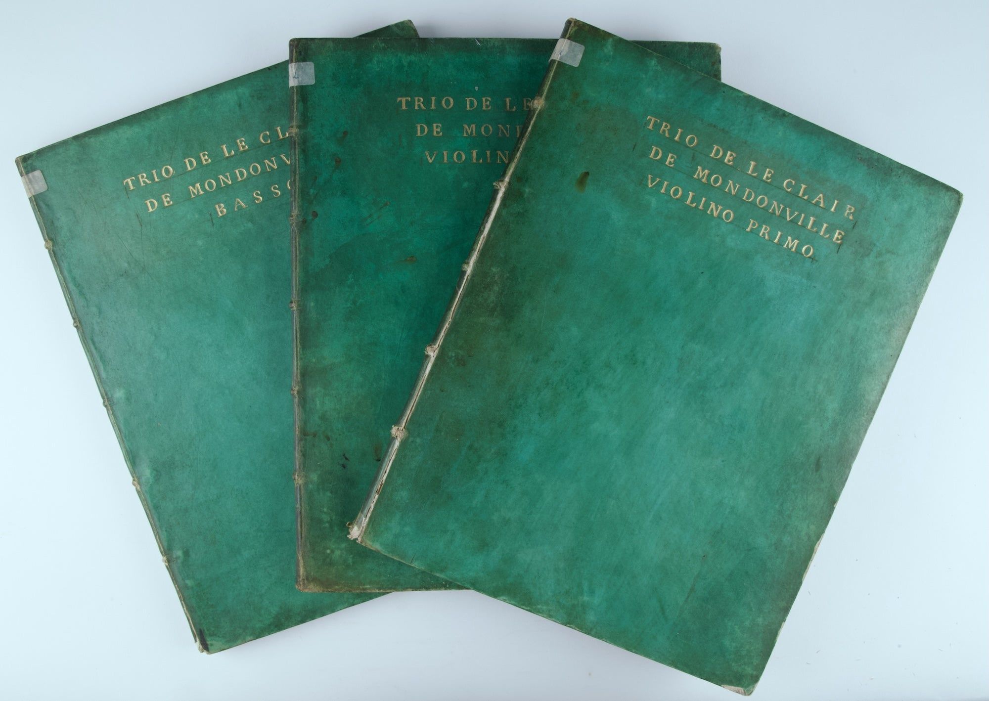 Arnold Dolmetsch (1858-1940), musician and pioneer in the Early Music revival, with his small inventory label to spines and with handstamp ("Dolmetsch Library") and shelfmark ("IID37,1) to foot of first page of music of all parts of Leclair and verso of title of all parts of Mondonville.
