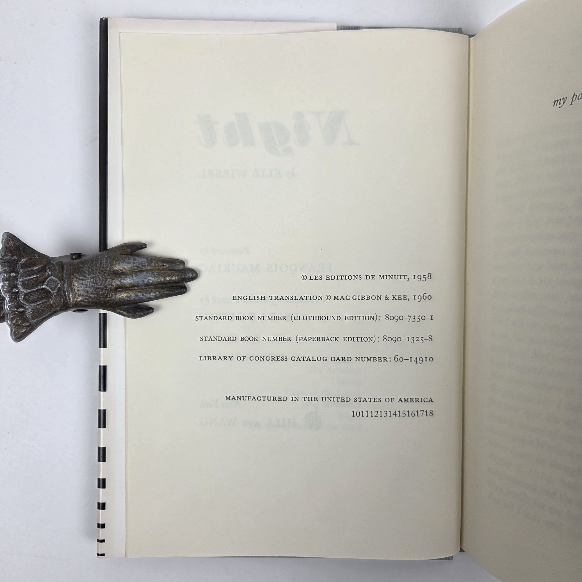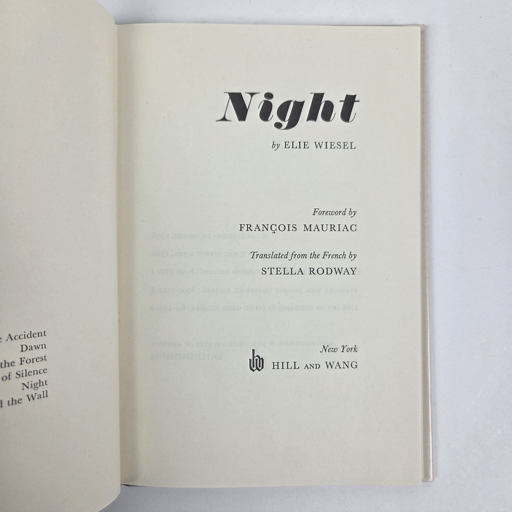 . The publication year of [1966] for this copy of Night has been determined based on the inclusion of Jews of Silence in the "By Elie Wiesel" section facing the title page, which itself was first published in 1966. The year listed on the copyright information page, 1960, is accurate to the first printing of this edition. 1407506. Special Collections.