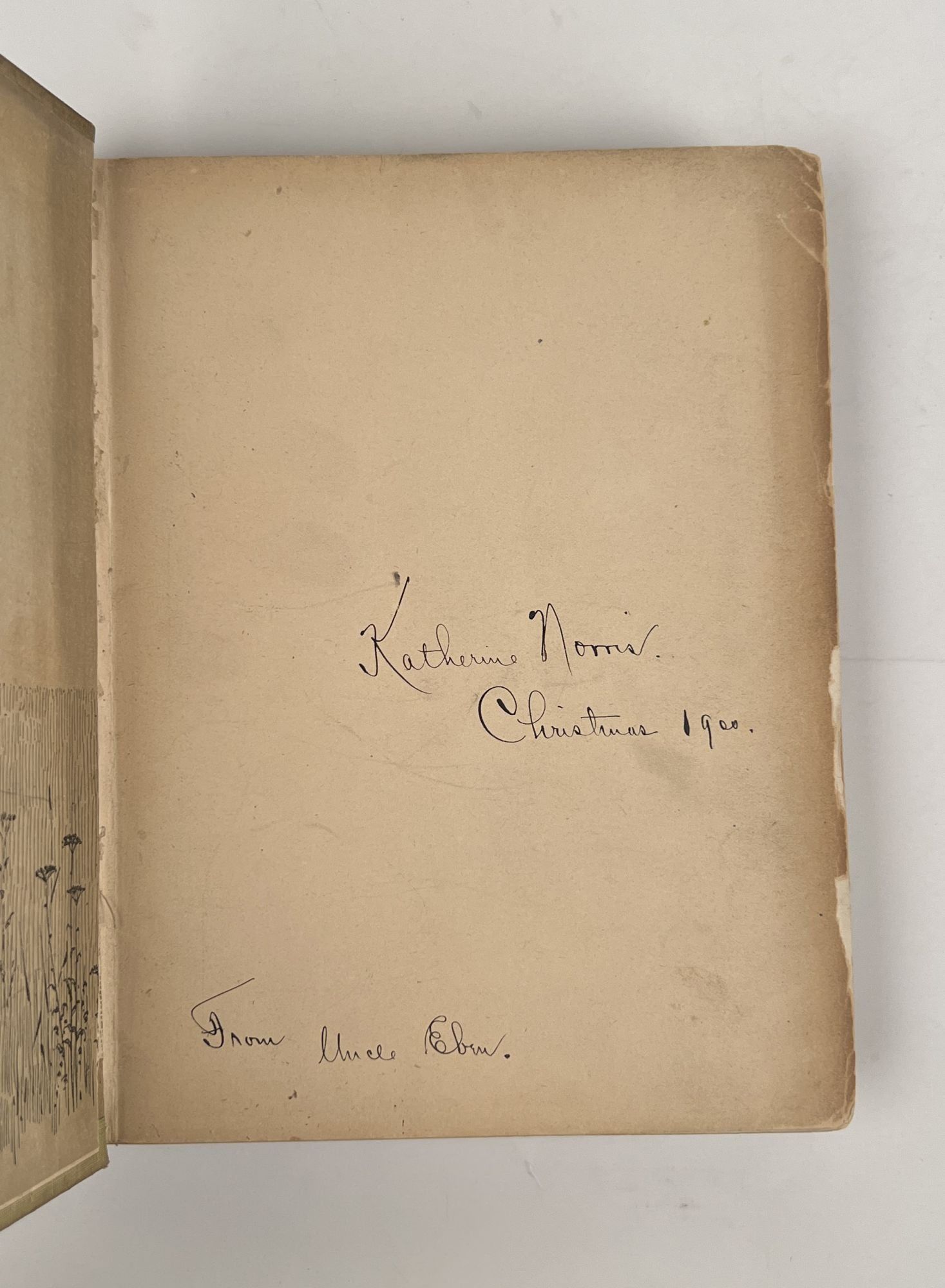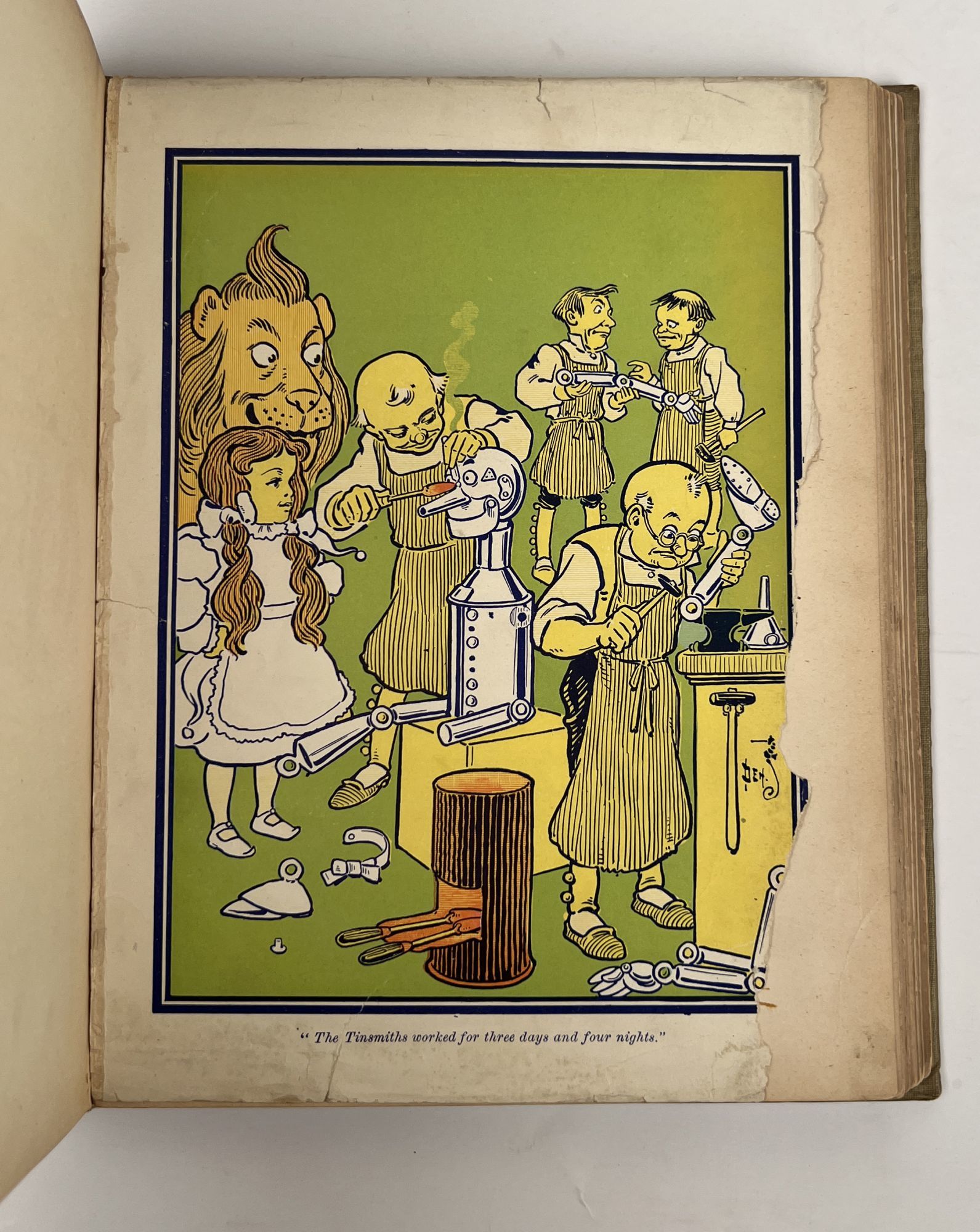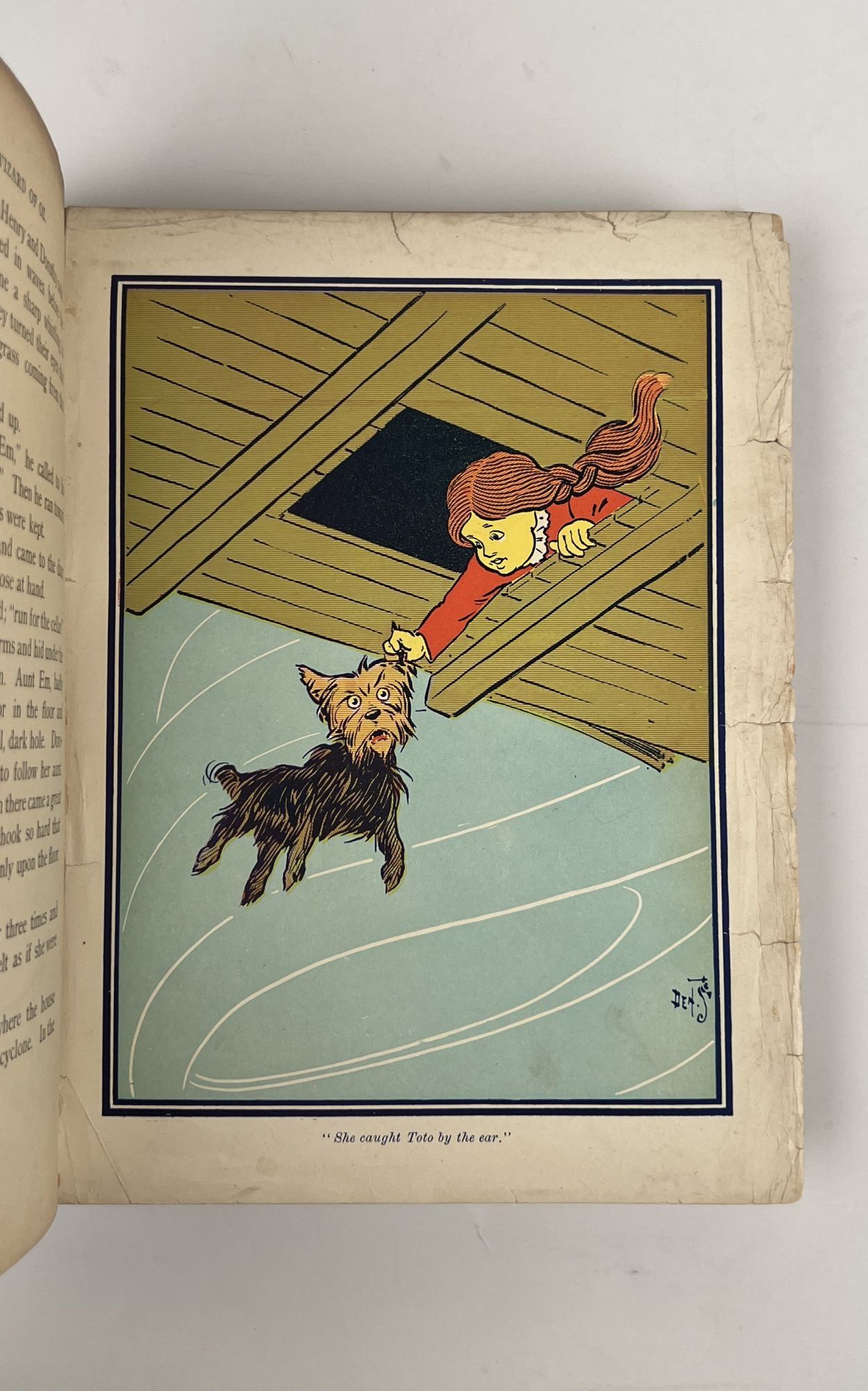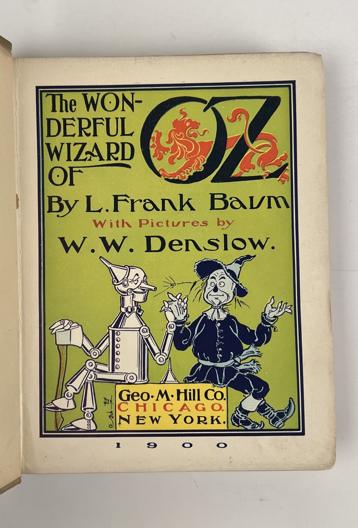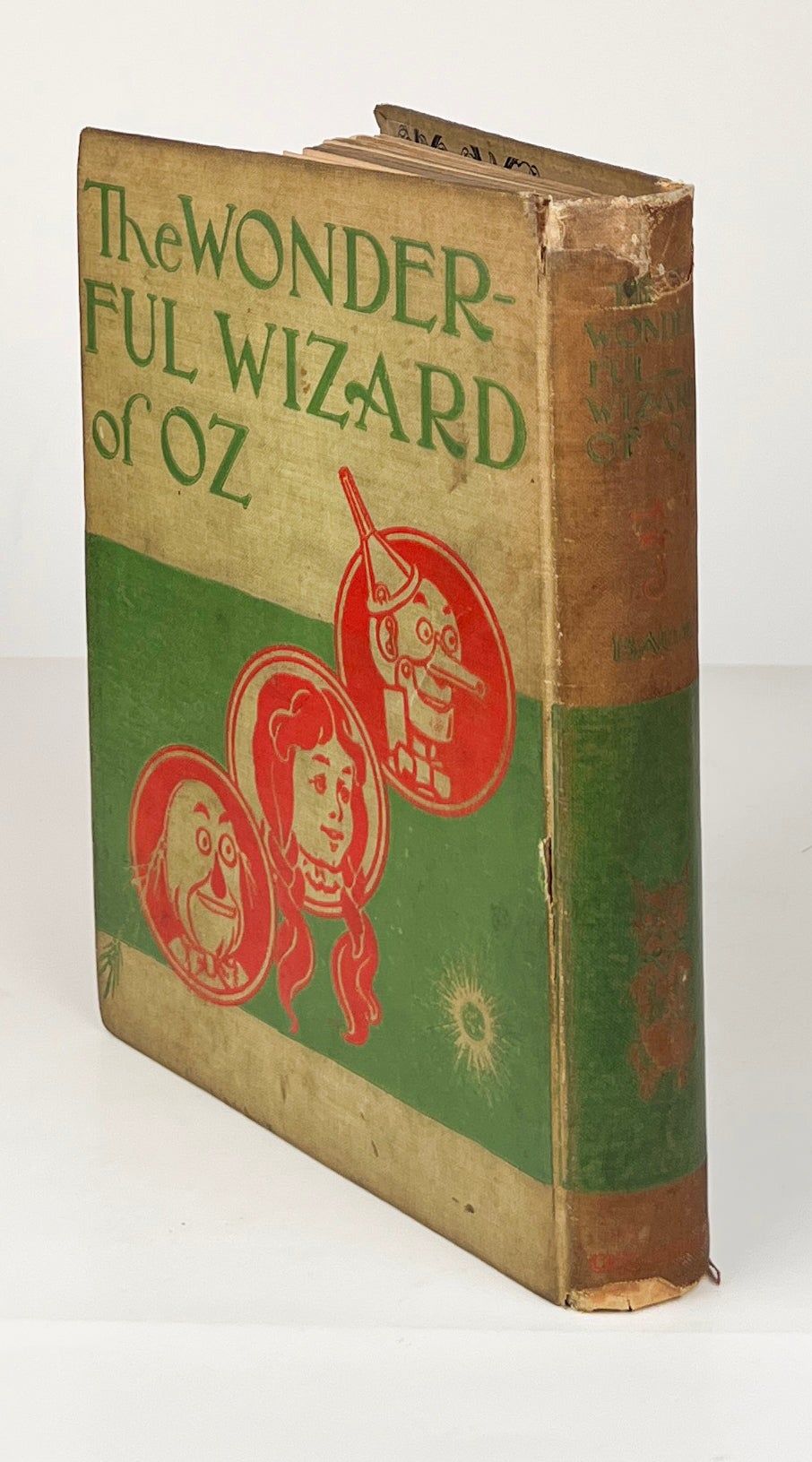 Chicago: Geo. M. Hill Co, 1900. First Edition. Hardcover. Good. Second State in the C binding. Thirteen-line colophon without a box, no box on p. 2, "low wail of" on p. 14, illustration on p. 34 without the two blots on the moon, "pieces" on p. 81, illustration on p. 92 without the pink shading. "While The Woodman" on p. 227, broken type on p. 100 and p. 186. Good. Light green cloth soiled, a chip at the foot of the spine, repair at the head, some bumps and fraying at the corners and edges. Square, hinges starting, gift inscription on the front endpaper, textblock mostly firm though the illustration opposite p. 159 is laid-in and missing an inch down the right side. A fairly nice early state copy of the first book in Baum's beloved children's series and the basis for the 1939 film starring Judy Garland.