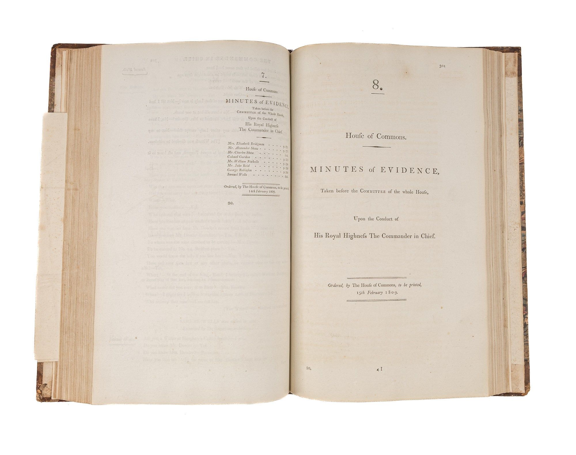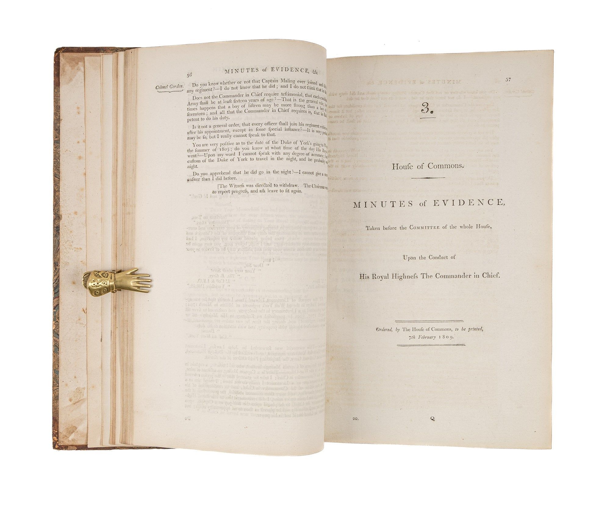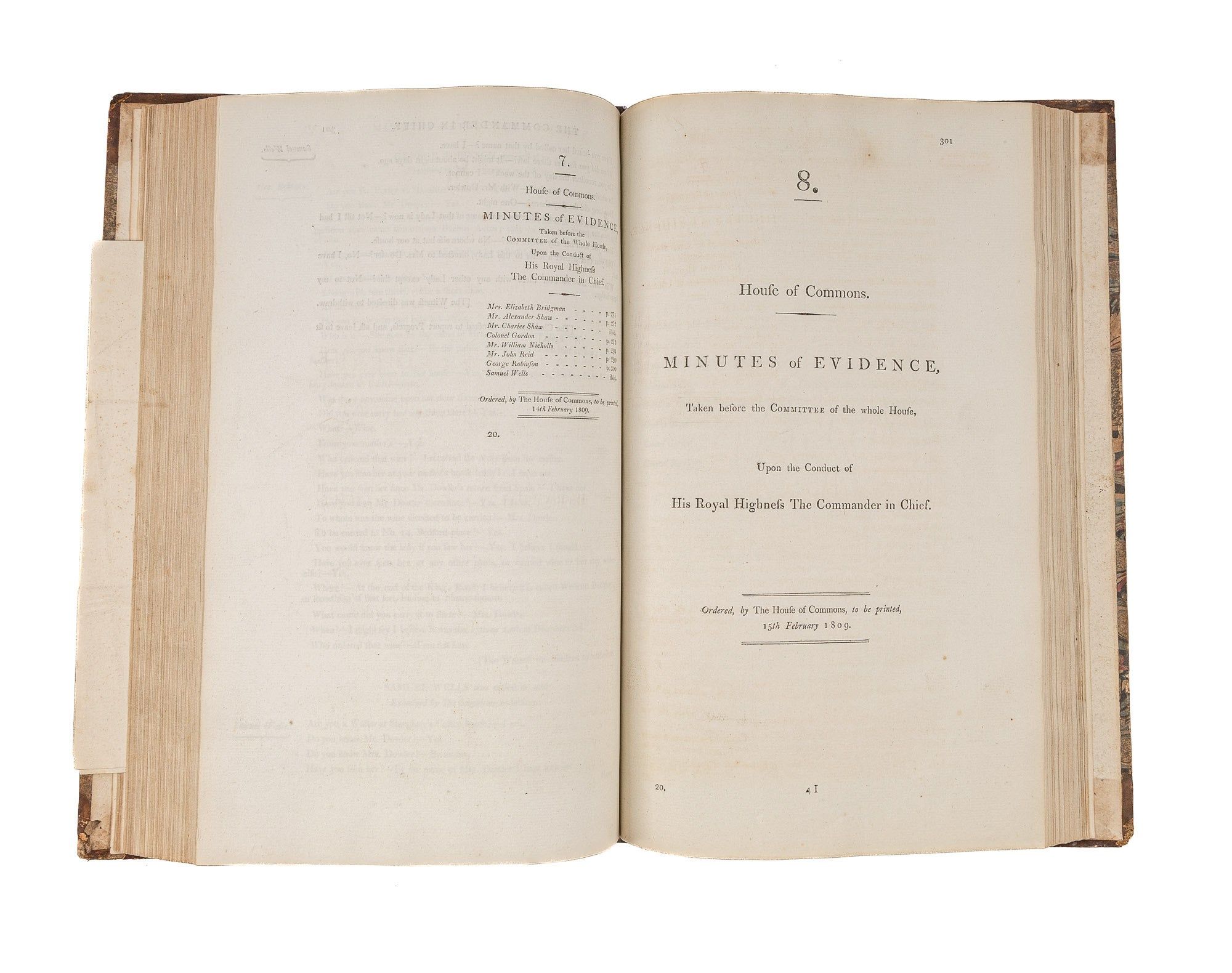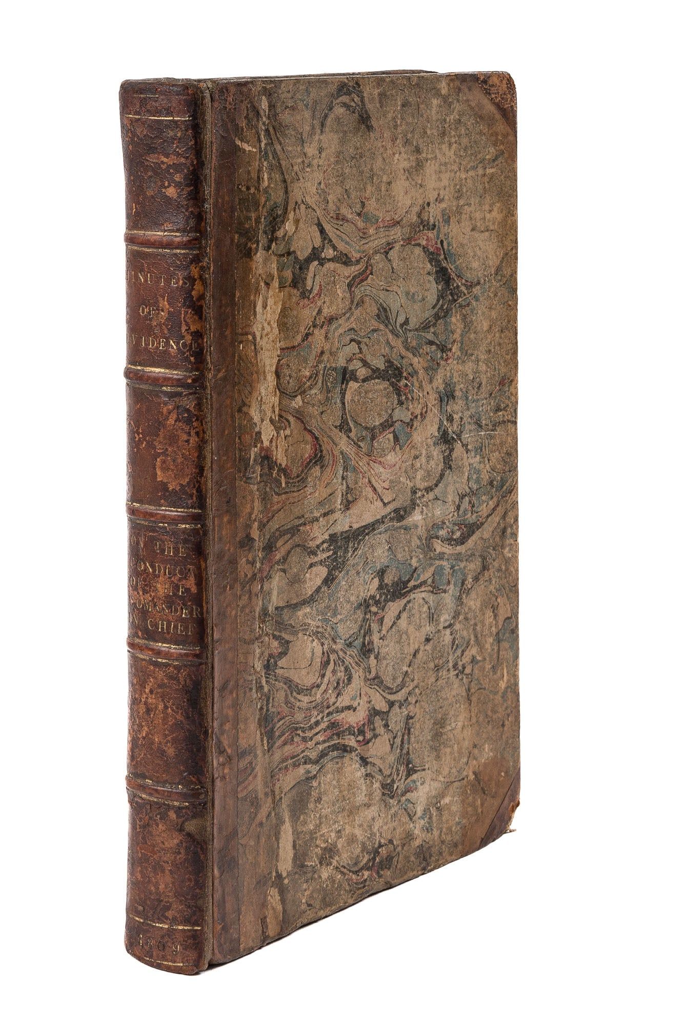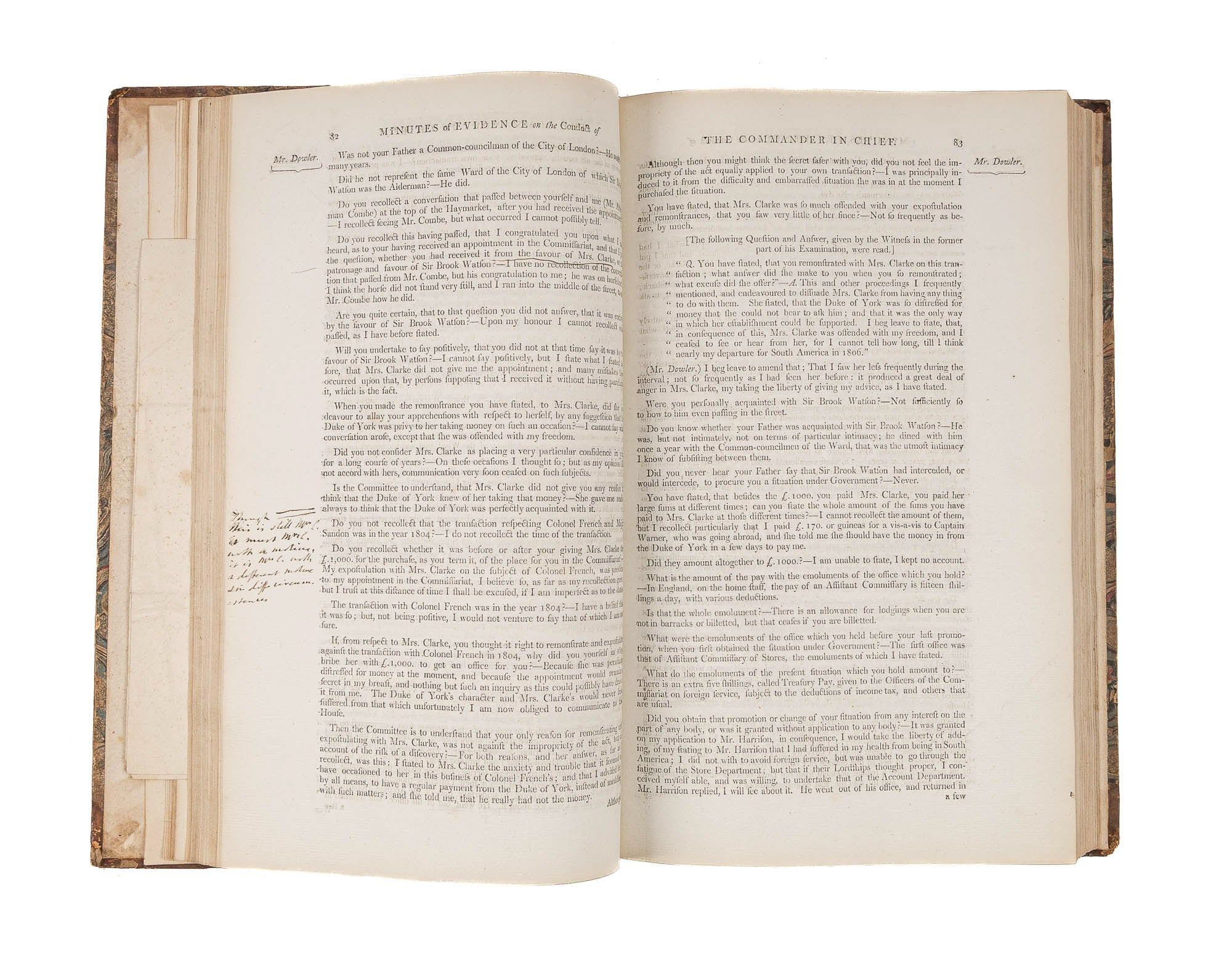 1809. An Inside Look at One of Georgian England's Great Scandals [House of Commons]. [Frederick Augustus, Prince, Duke of York and Albany (1763-1827)]. Minutes of Evidence, Taken Before the Committee of the Whole House, Upon the Conduct of His Royal Highness the Commander in Chief. [London]: Ordered, by The House of Commons, to be printed, 1809. [iv], 180, [2], 221-372, [2], 385-480 pp. Text in 12 parts, as issued, pagination irregular in places. Parts 5 and 9 lack appendices. Folio (12-3/4" x 8"; 32.3 x 20.4 cm). Contemporary three-quarter calf over marbled boards, rebacked retaining backstrip with gilt-edged raised bands and gilt titles, endpapers retained. Moderate rubbing, some wear to board edges and corners, which are bumped. Light toning to interior, negligible light foxing and soiling in a few places. Early owner signature of William Windham to head of front free endpaper, early underlining and annotations in the same hand to Parts 1-4 (last annotation on p. 118). An interesting and appealing volume. $1,250. * Only edition, issued by the House of Commons for internal use between February 1 and February 22, 1809. In 1806, it was discovered that Mary Anne Clarke, the mistress of Prince Frederick, Duke of York and Albany, commander-in-chief and the second son of King George III, was selling commissions for personal profit (presumably with Frederick's cooperation). Investigated by Parliament, Frederick was exonerated, but he resigned his post after a large minority voted against him. He was reinstated two years later. This set of Parliamentary papers contains the testimony provided by witnesses to the House of Commons investigating committee. Windham [1750-1810], a notable Whig politician, was a contemporary of Edmund Burke, Charles James Fox and Samuel Johnson, among other important statesmen and thinkers. He was renowned as an orator. Secretary at War from 1794-1801 and Secretary of State for War and the Colonies from 1806-1807, he clearly had an interest in military matters like the Duke of York scandal. Parliamentary papers like these were printed exclusively for the use of Members and are often scarce. OCLC locates 11 copies of this set, 1 in a North American law library (Georgetown). Hansard's Catalogue and Breviate of Parliamentary Papers, 1696-1834 189.