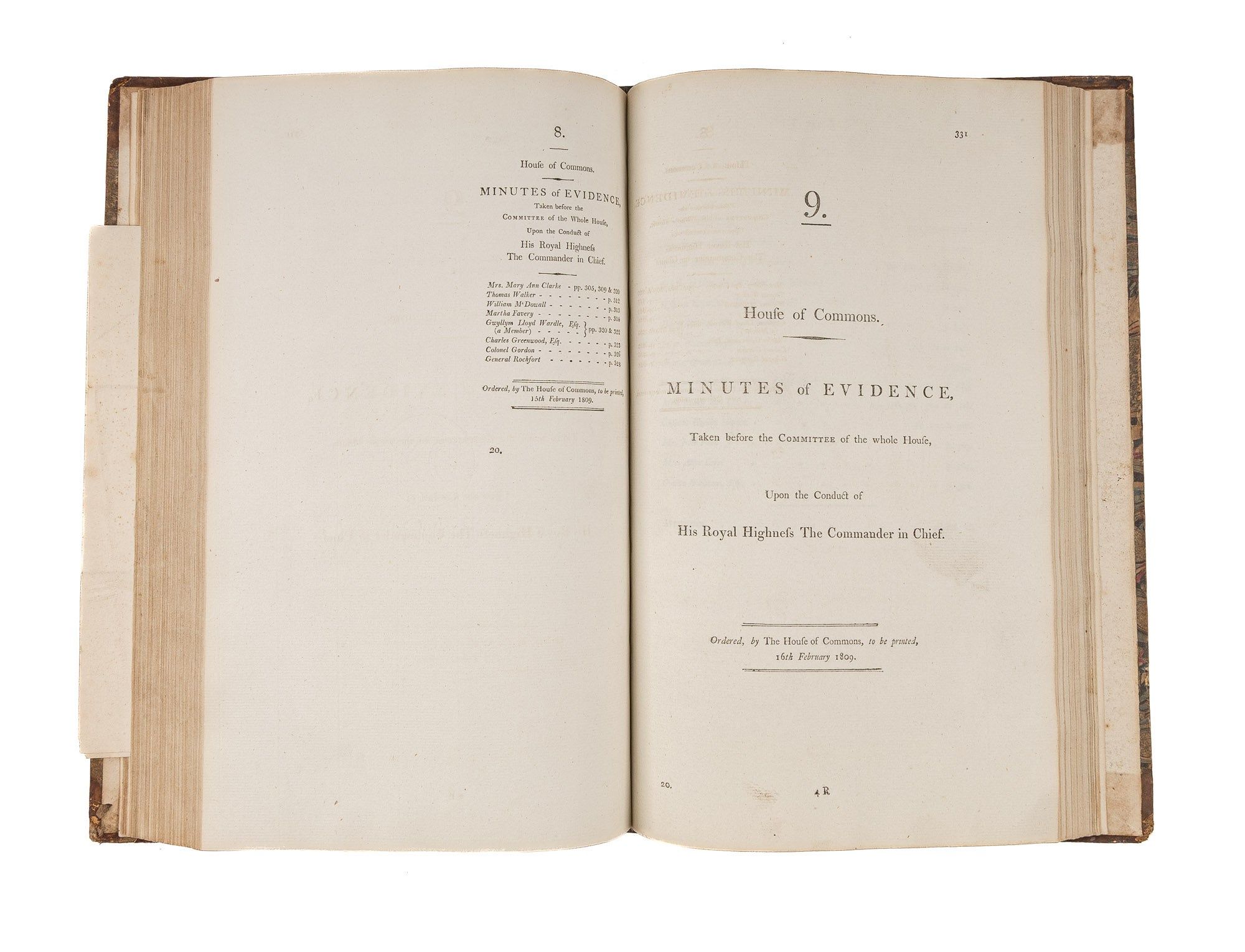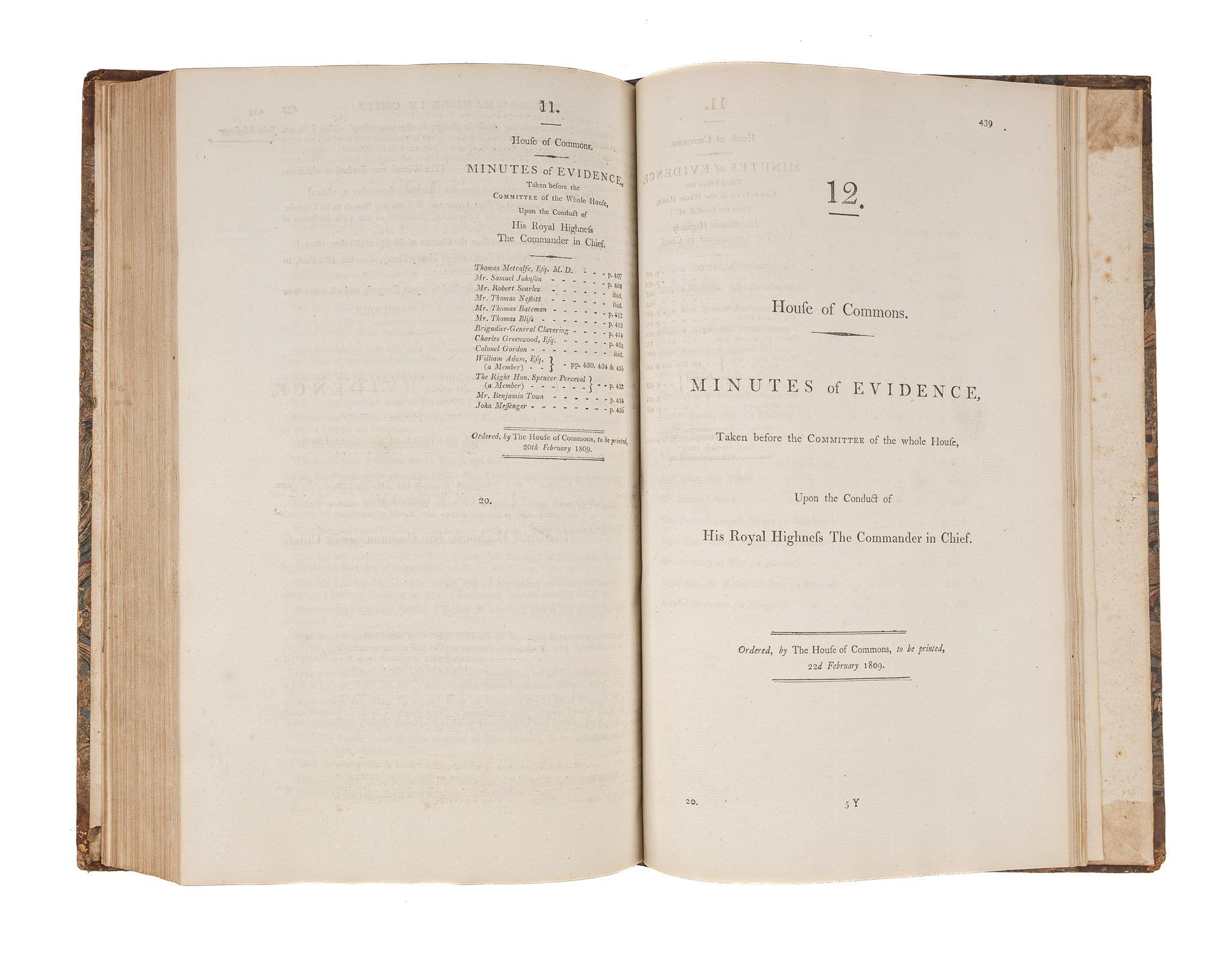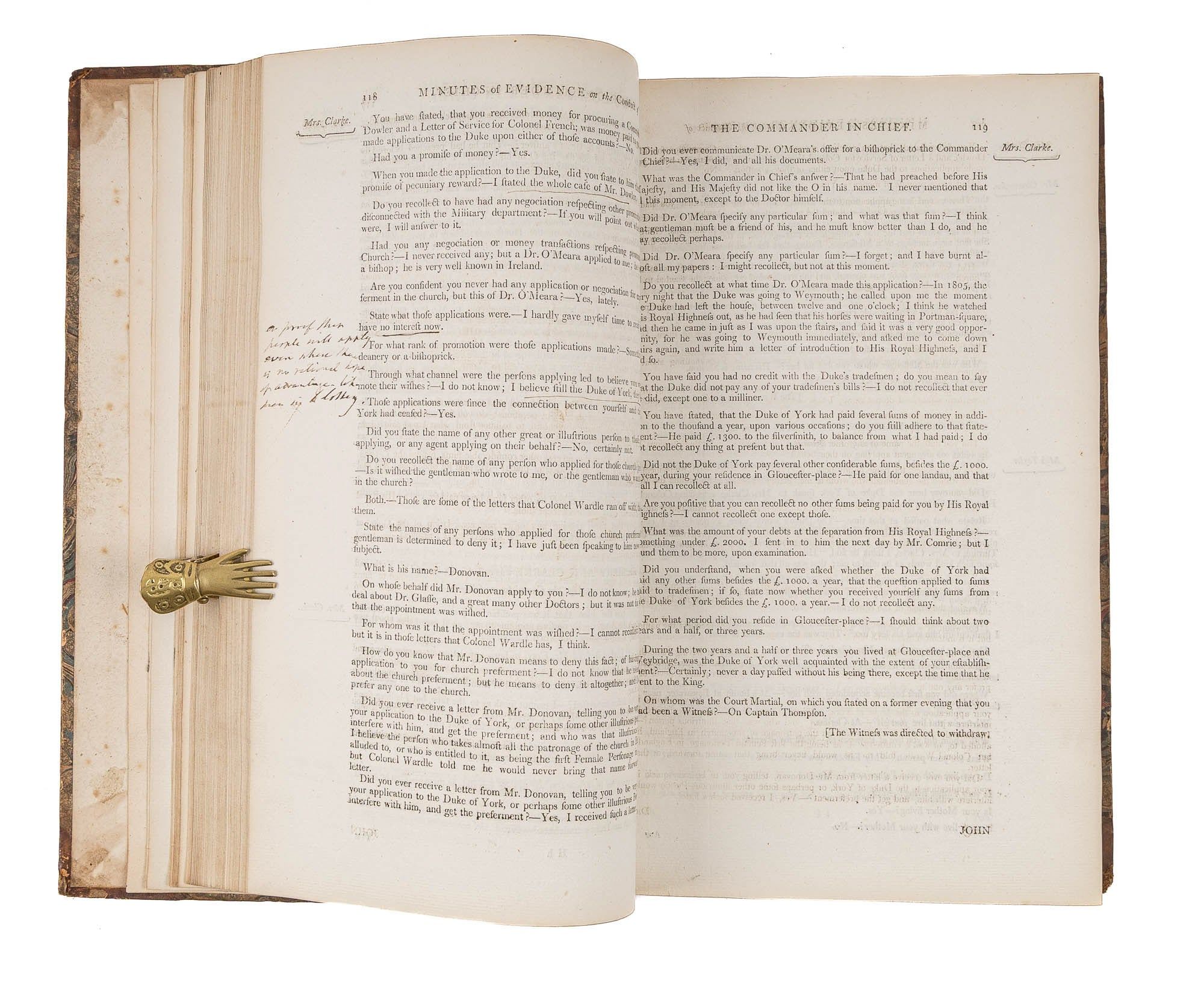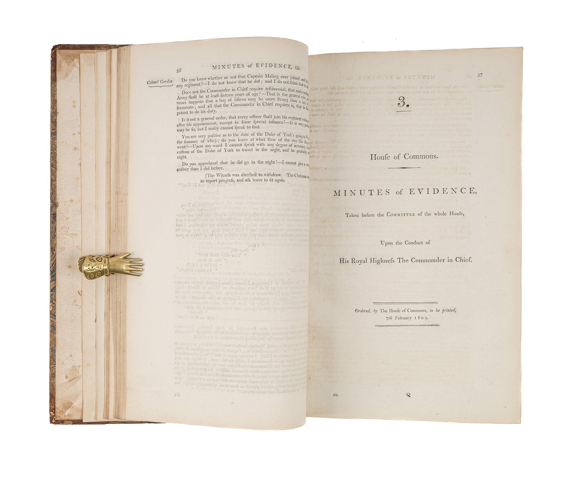1809. An Inside Look at One of Georgian England's Great Scandals [House of Commons]. [Frederick Augustus, Prince, Duke of York and Albany (1763-1827)]. Minutes of Evidence, Taken Before the Committee of the Whole House, Upon the Conduct of His Royal Highness the Commander in Chief. [London]: Ordered, by The House of Commons, to be printed, 1809. [iv], 180, [2], 221-372, [2], 385-480 pp. Text in 12 parts, as issued, pagination irregular in places. Parts 5 and 9 lack appendices. Folio (12-3/4" x 8"; 32.3 x 20.4 cm). Contemporary three-quarter calf over marbled boards, rebacked retaining backstrip with gilt-edged raised bands and gilt titles, endpapers retained. Moderate rubbing, some wear to board edges and corners, which are bumped. Light toning to interior, negligible light foxing and soiling in a few places. Early owner signature of William Windham to head of front free endpaper, early underlining and annotations in the same hand to Parts 1-4 (last annotation on p. 118). An interesting and appealing volume. $1,250. * Only edition, issued by the House of Commons for internal use between February 1 and February 22, 1809. In 1806, it was discovered that Mary Anne Clarke, the mistress of Prince Frederick, Duke of York and Albany, commander-in-chief and the second son of King George III, was selling commissions for personal profit (presumably with Frederick's cooperation). Investigated by Parliament, Frederick was exonerated, but he resigned his post after a large minority voted against him. He was reinstated two years later. This set of Parliamentary papers contains the testimony provided by witnesses to the House of Commons investigating committee. Windham [1750-1810], a notable Whig politician, was a contemporary of Edmund Burke, Charles James Fox and Samuel Johnson, among other important statesmen and thinkers. He was renowned as an orator. Secretary at War from 1794-1801 and Secretary of State for War and the Colonies from 1806-1807, he clearly had an interest in military matters like the Duke of York scandal. Parliamentary papers like these were printed exclusively for the use of Members and are often scarce. OCLC locates 11 copies of this set, 1 in a North American law library (Georgetown). Hansard's Catalogue and Breviate of Parliamentary Papers, 1696-1834 189.