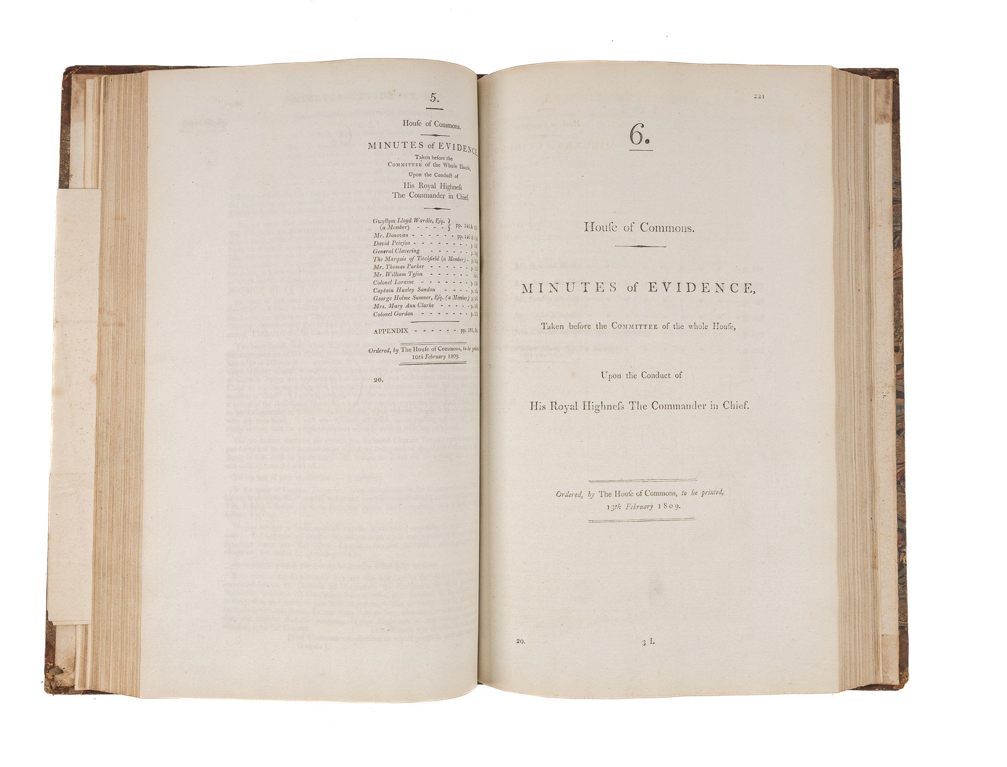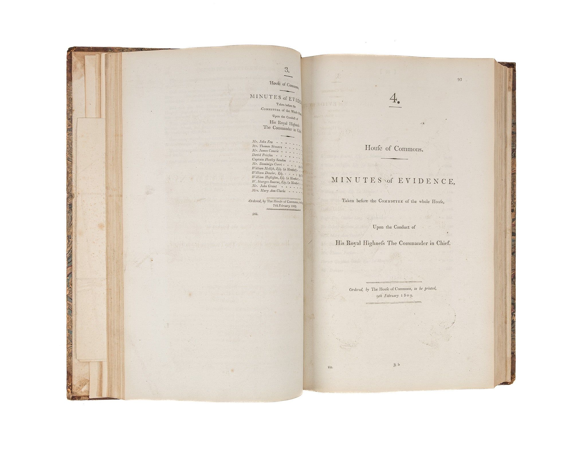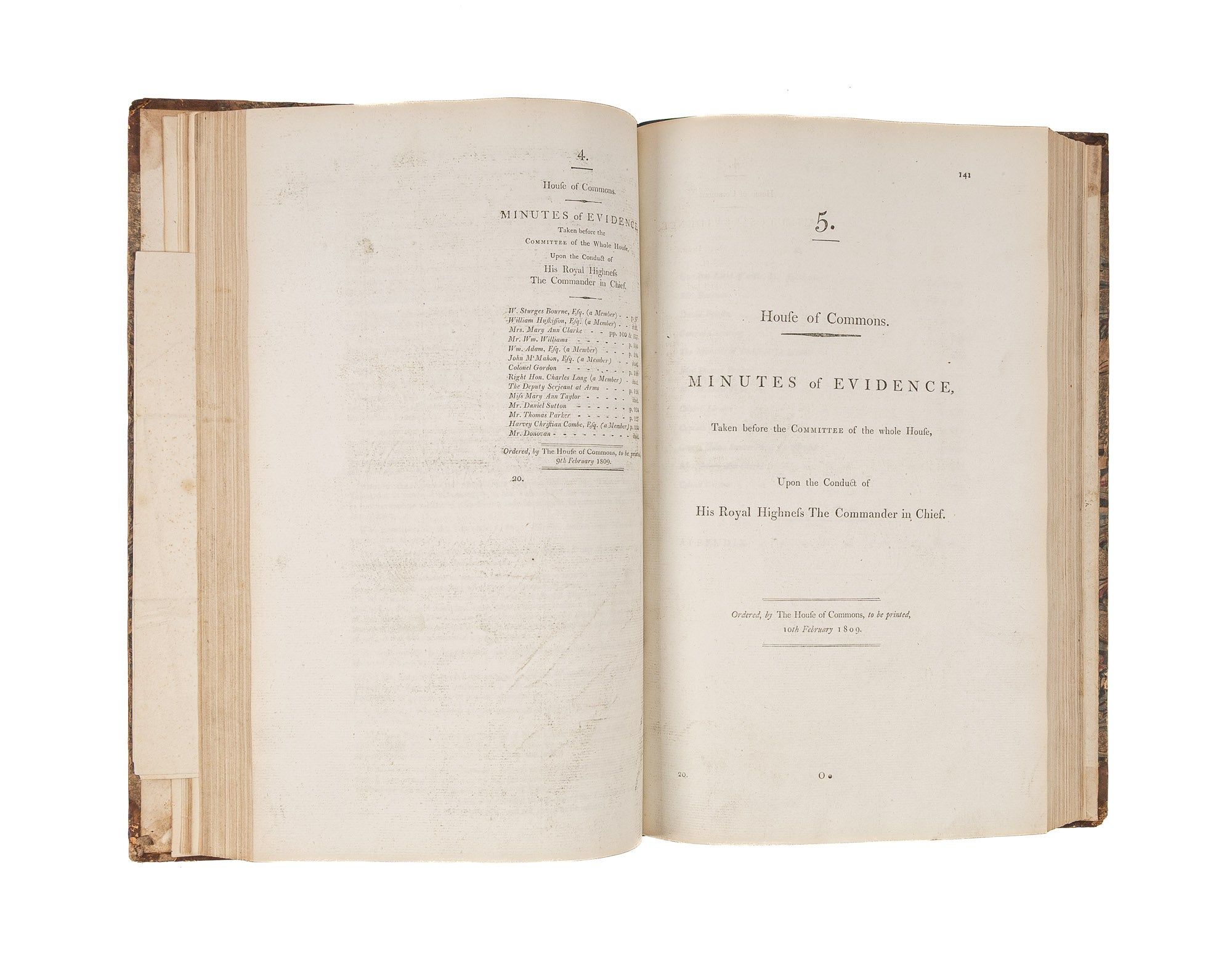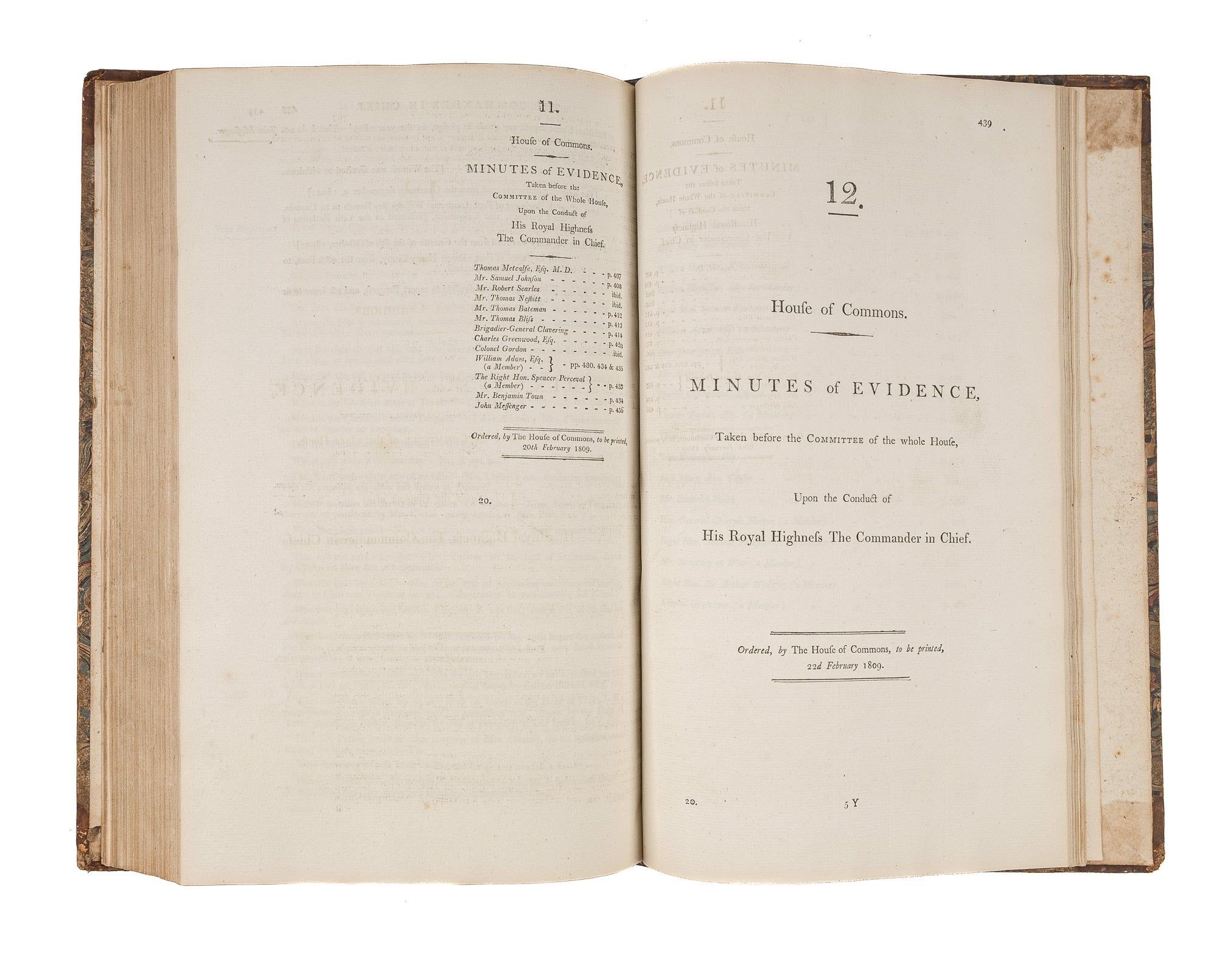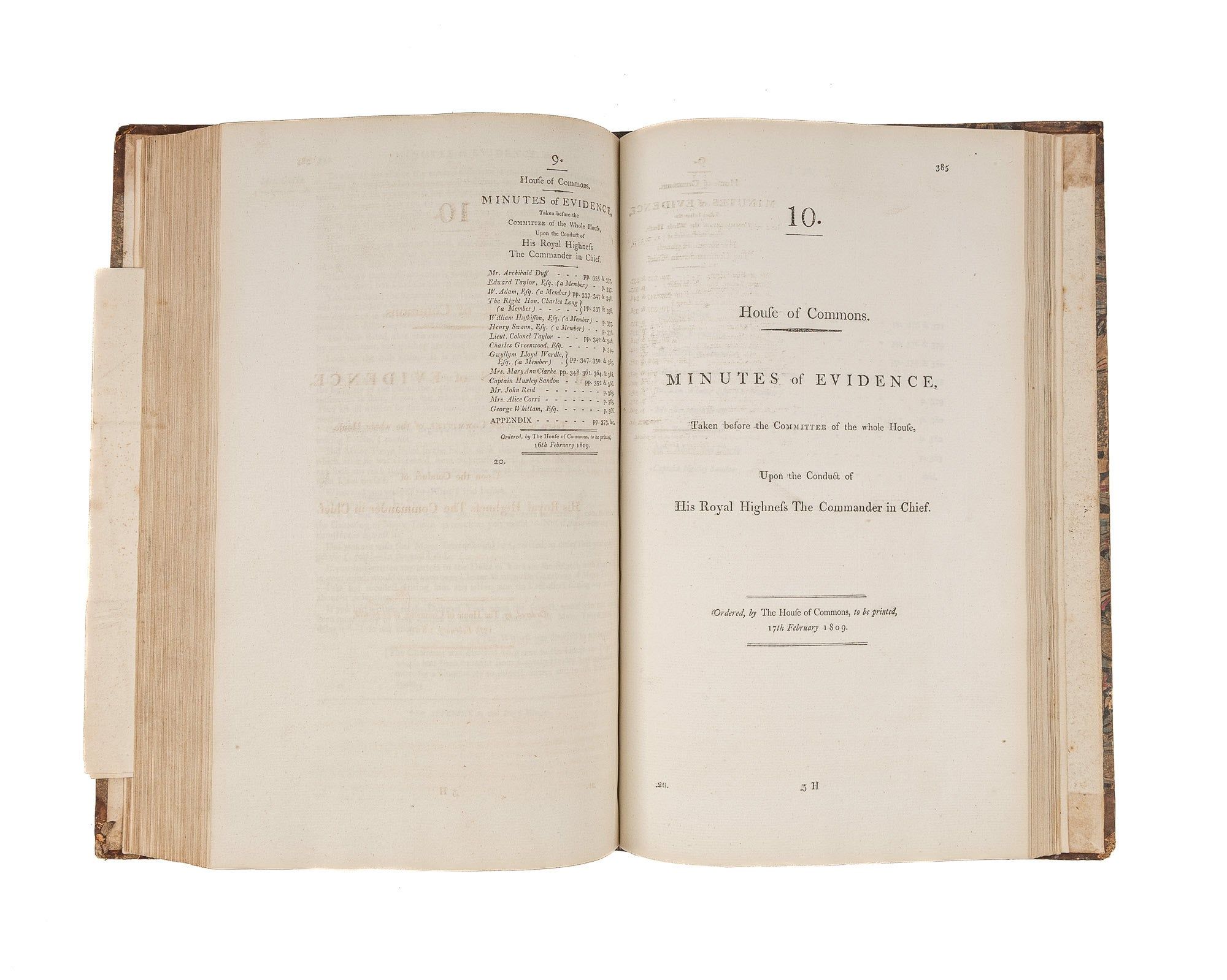 1809. An Inside Look at One of Georgian England's Great Scandals [House of Commons]. [Frederick Augustus, Prince, Duke of York and Albany (1763-1827)]. Minutes of Evidence, Taken Before the Committee of the Whole House, Upon the Conduct of His Royal Highness the Commander in Chief. [London]: Ordered, by The House of Commons, to be printed, 1809. [iv], 180, [2], 221-372, [2], 385-480 pp. Text in 12 parts, as issued, pagination irregular in places. Parts 5 and 9 lack appendices. Folio (12-3/4" x 8"; 32.3 x 20.4 cm). Contemporary three-quarter calf over marbled boards, rebacked retaining backstrip with gilt-edged raised bands and gilt titles, endpapers retained. Moderate rubbing, some wear to board edges and corners, which are bumped. Light toning to interior, negligible light foxing and soiling in a few places. Early owner signature of William Windham to head of front free endpaper, early underlining and annotations in the same hand to Parts 1-4 (last annotation on p. 118). An interesting and appealing volume. $1,250. * Only edition, issued by the House of Commons for internal use between February 1 and February 22, 1809. In 1806, it was discovered that Mary Anne Clarke, the mistress of Prince Frederick, Duke of York and Albany, commander-in-chief and the second son of King George III, was selling commissions for personal profit (presumably with Frederick's cooperation). Investigated by Parliament, Frederick was exonerated, but he resigned his post after a large minority voted against him. He was reinstated two years later. This set of Parliamentary papers contains the testimony provided by witnesses to the House of Commons investigating committee. Windham [1750-1810], a notable Whig politician, was a contemporary of Edmund Burke, Charles James Fox and Samuel Johnson, among other important statesmen and thinkers. He was renowned as an orator. Secretary at War from 1794-1801 and Secretary of State for War and the Colonies from 1806-1807, he clearly had an interest in military matters like the Duke of York scandal. Parliamentary papers like these were printed exclusively for the use of Members and are often scarce. OCLC locates 11 copies of this set, 1 in a North American law library (Georgetown). Hansard's Catalogue and Breviate of Parliamentary Papers, 1696-1834 189.