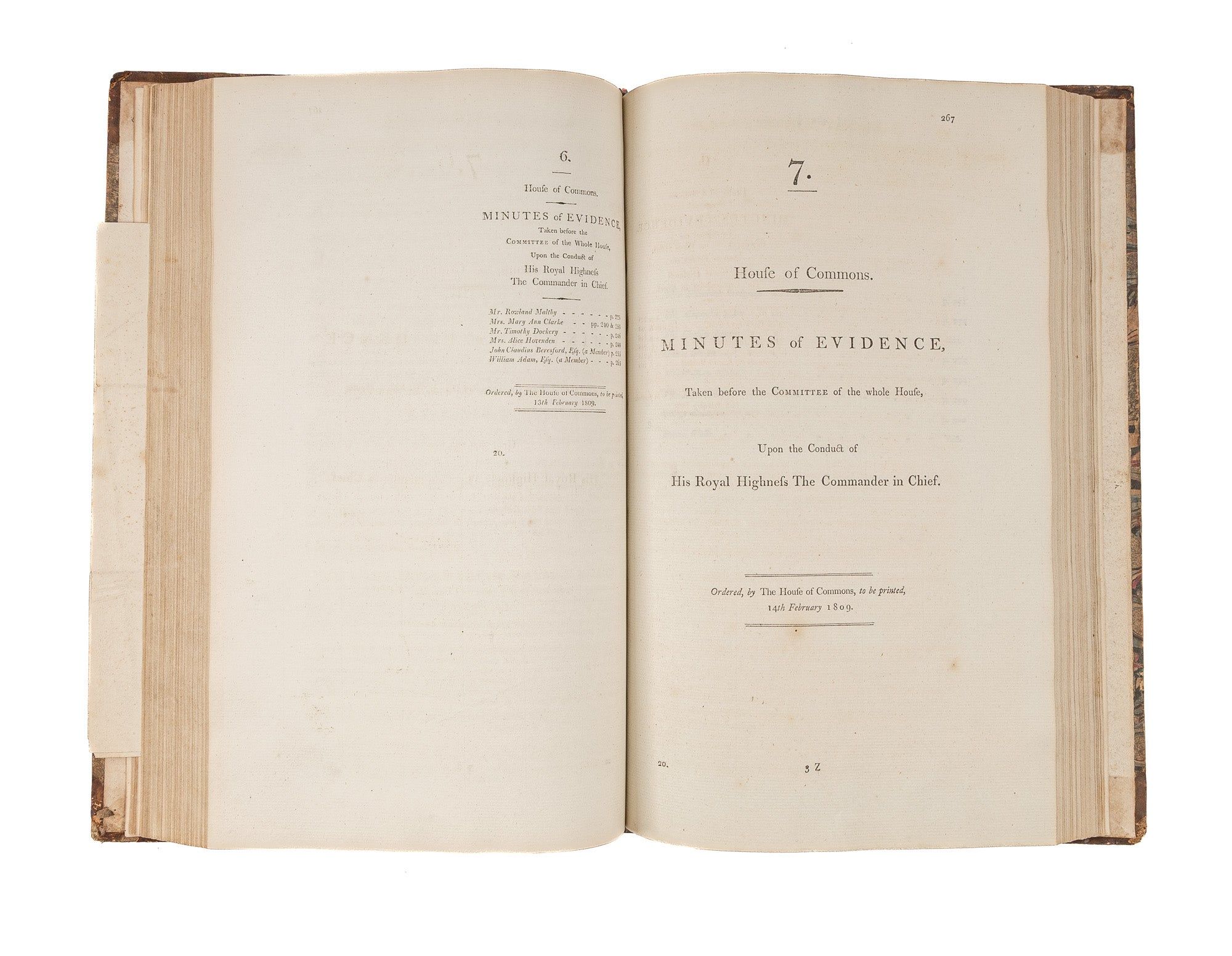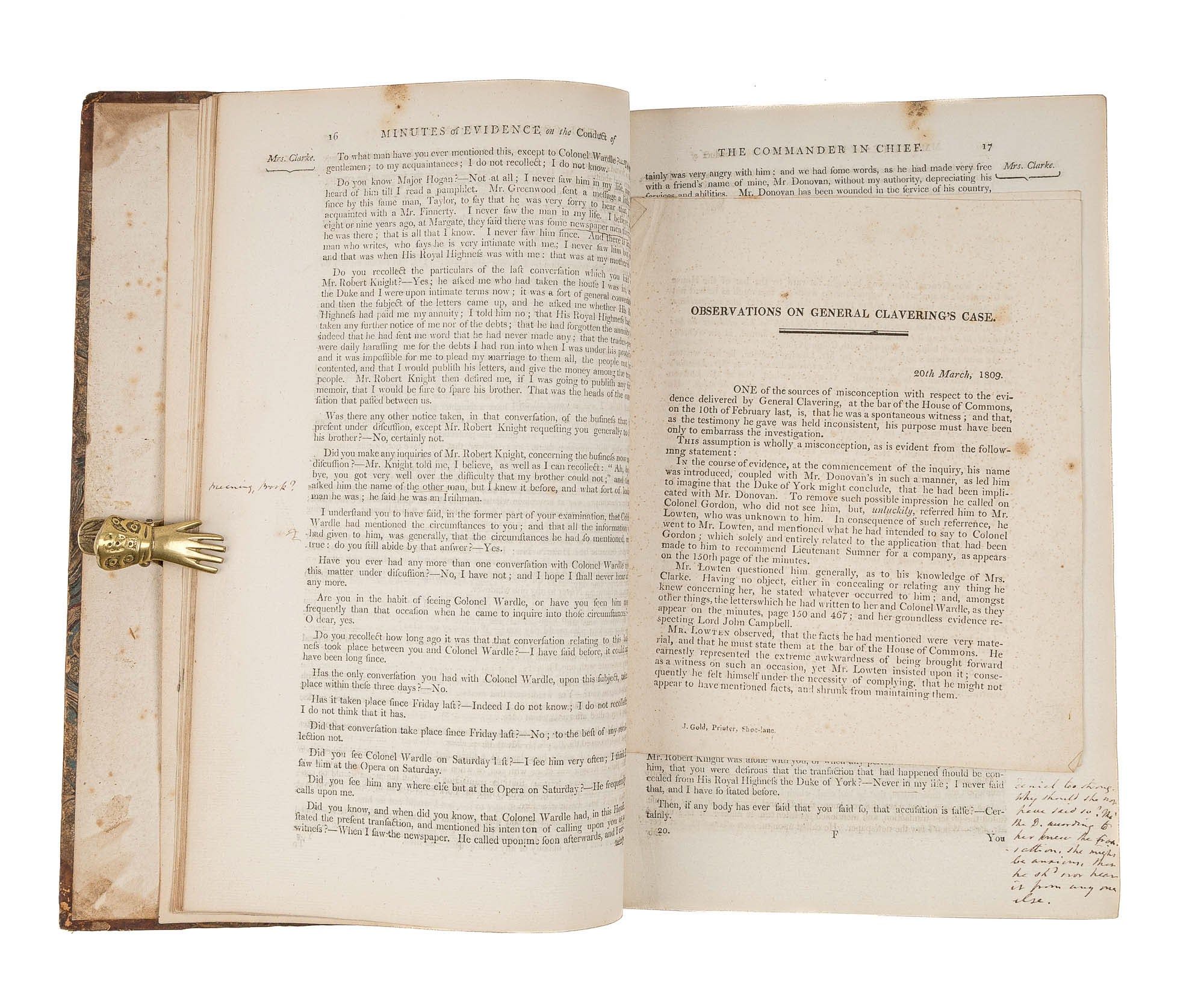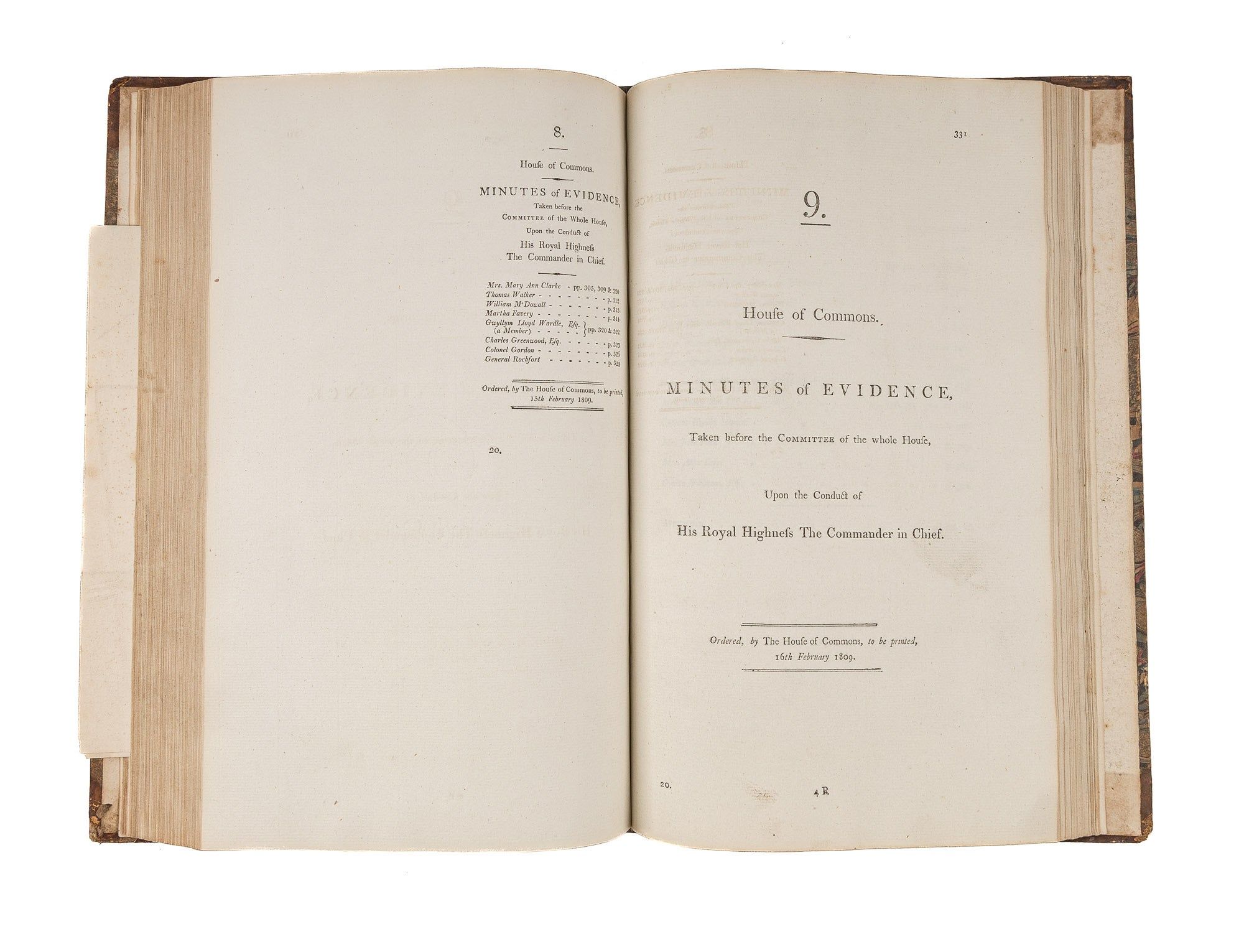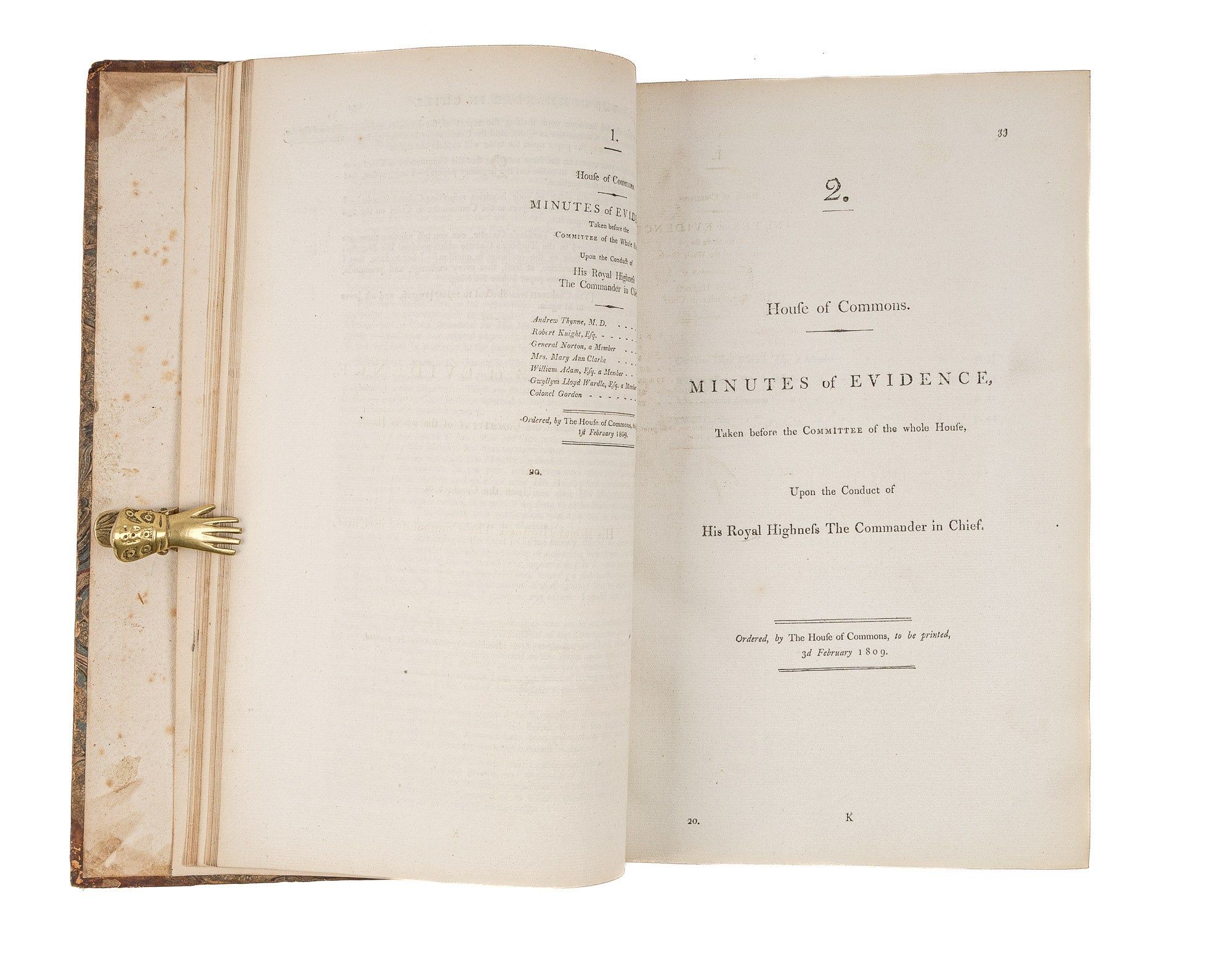 1809. An Inside Look at One of Georgian England's Great Scandals [House of Commons]. [Frederick Augustus, Prince, Duke of York and Albany (1763-1827)]. Minutes of Evidence, Taken Before the Committee of the Whole House, Upon the Conduct of His Royal Highness the Commander in Chief. [London]: Ordered, by The House of Commons, to be printed, 1809. [iv], 180, [2], 221-372, [2], 385-480 pp. Text in 12 parts, as issued, pagination irregular in places. Parts 5 and 9 lack appendices. Folio (12-3/4" x 8"; 32.3 x 20.4 cm). Contemporary three-quarter calf over marbled boards, rebacked retaining backstrip with gilt-edged raised bands and gilt titles, endpapers retained. Moderate rubbing, some wear to board edges and corners, which are bumped. Light toning to interior, negligible light foxing and soiling in a few places. Early owner signature of William Windham to head of front free endpaper, early underlining and annotations in the same hand to Parts 1-4 (last annotation on p. 118). An interesting and appealing volume. $1,250. * Only edition, issued by the House of Commons for internal use between February 1 and February 22, 1809. In 1806, it was discovered that Mary Anne Clarke, the mistress of Prince Frederick, Duke of York and Albany, commander-in-chief and the second son of King George III, was selling commissions for personal profit (presumably with Frederick's cooperation). Investigated by Parliament, Frederick was exonerated, but he resigned his post after a large minority voted against him. He was reinstated two years later. This set of Parliamentary papers contains the testimony provided by witnesses to the House of Commons investigating committee. Windham [1750-1810], a notable Whig politician, was a contemporary of Edmund Burke, Charles James Fox and Samuel Johnson, among other important statesmen and thinkers. He was renowned as an orator. Secretary at War from 1794-1801 and Secretary of State for War and the Colonies from 1806-1807, he clearly had an interest in military matters like the Duke of York scandal. Parliamentary papers like these were printed exclusively for the use of Members and are often scarce. OCLC locates 11 copies of this set, 1 in a North American law library (Georgetown). Hansard's Catalogue and Breviate of Parliamentary Papers, 1696-1834 189.
