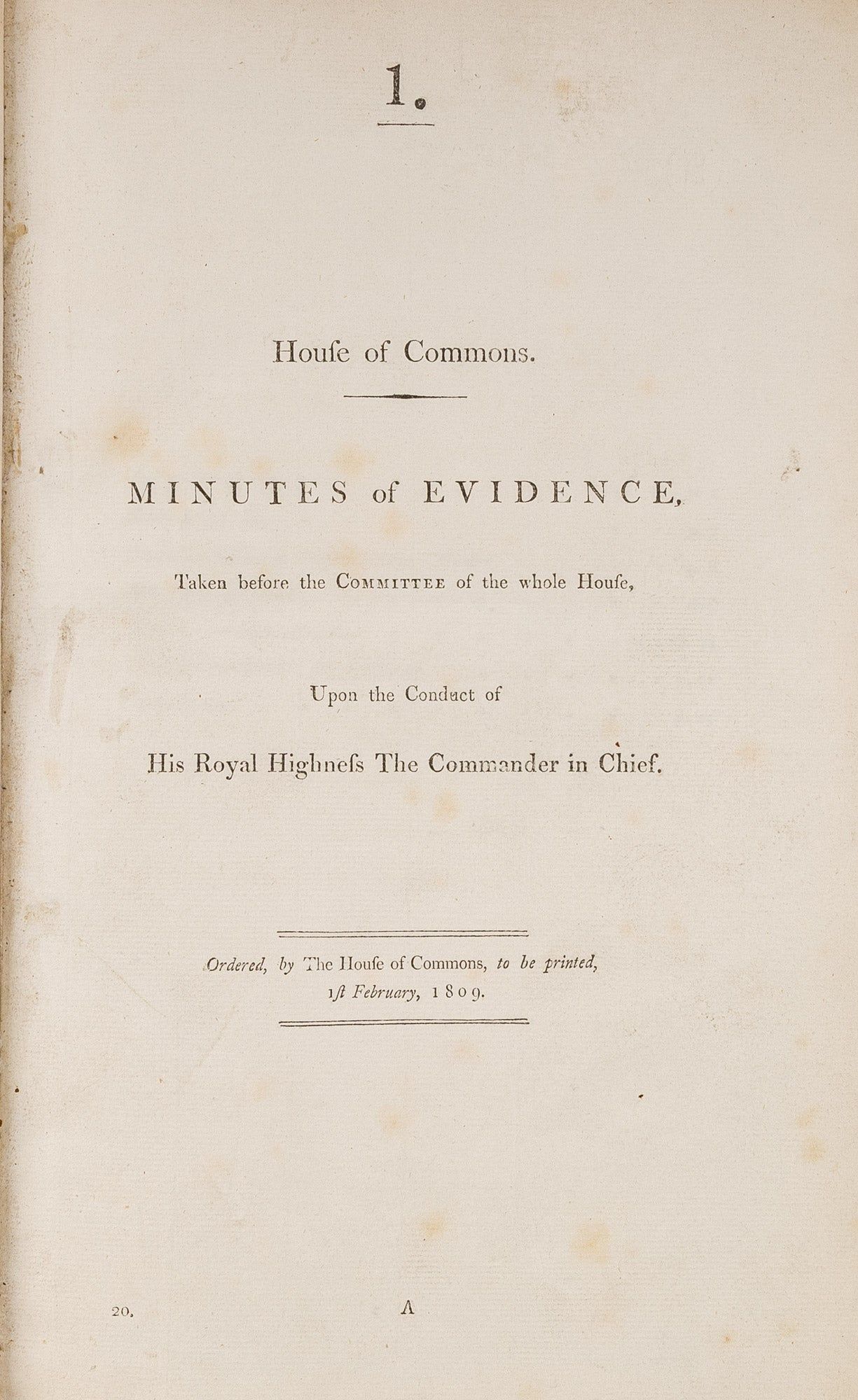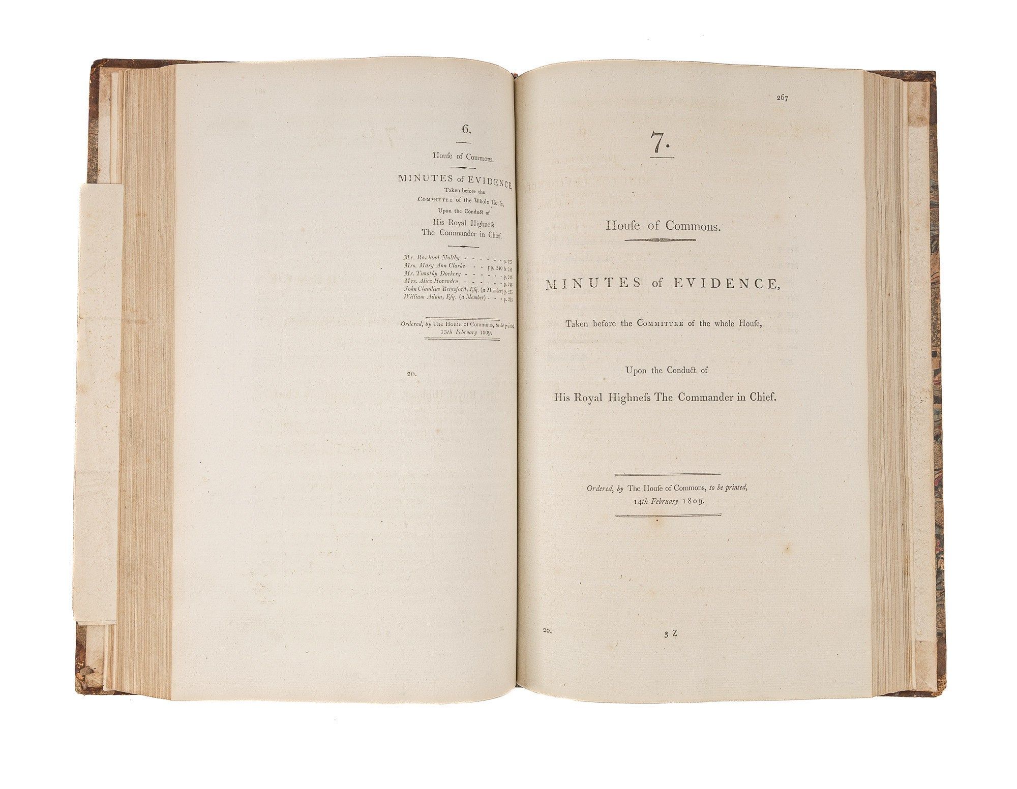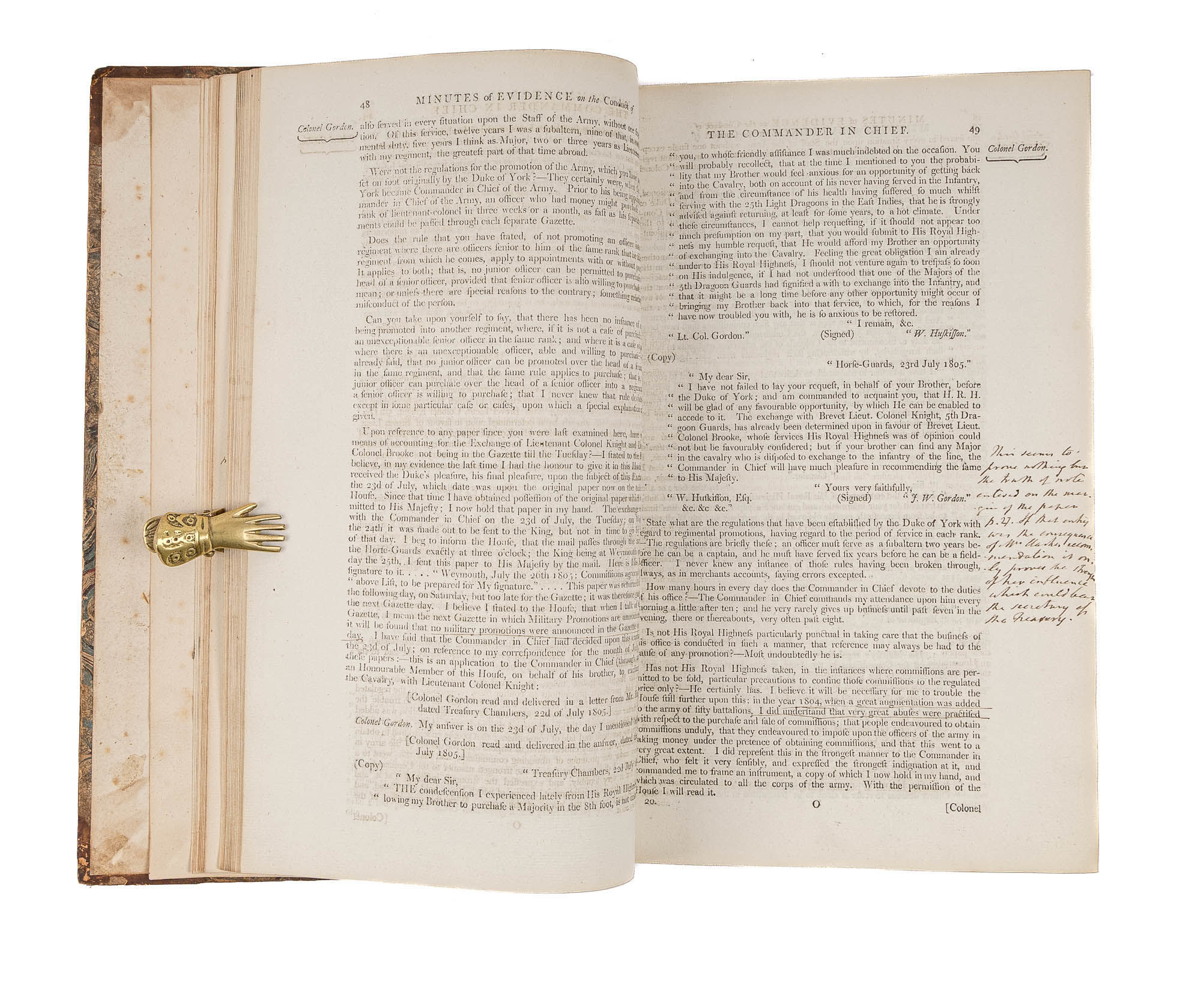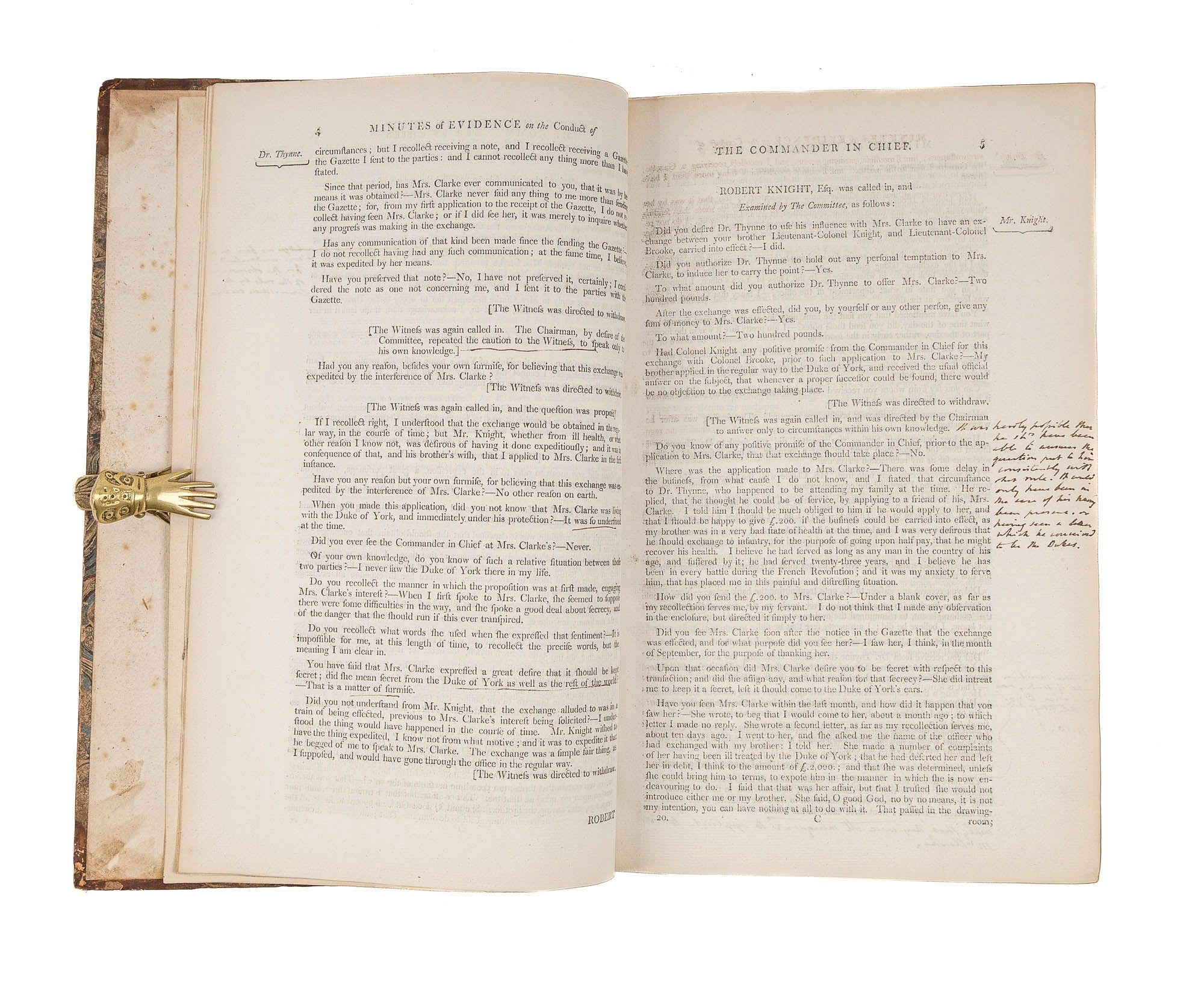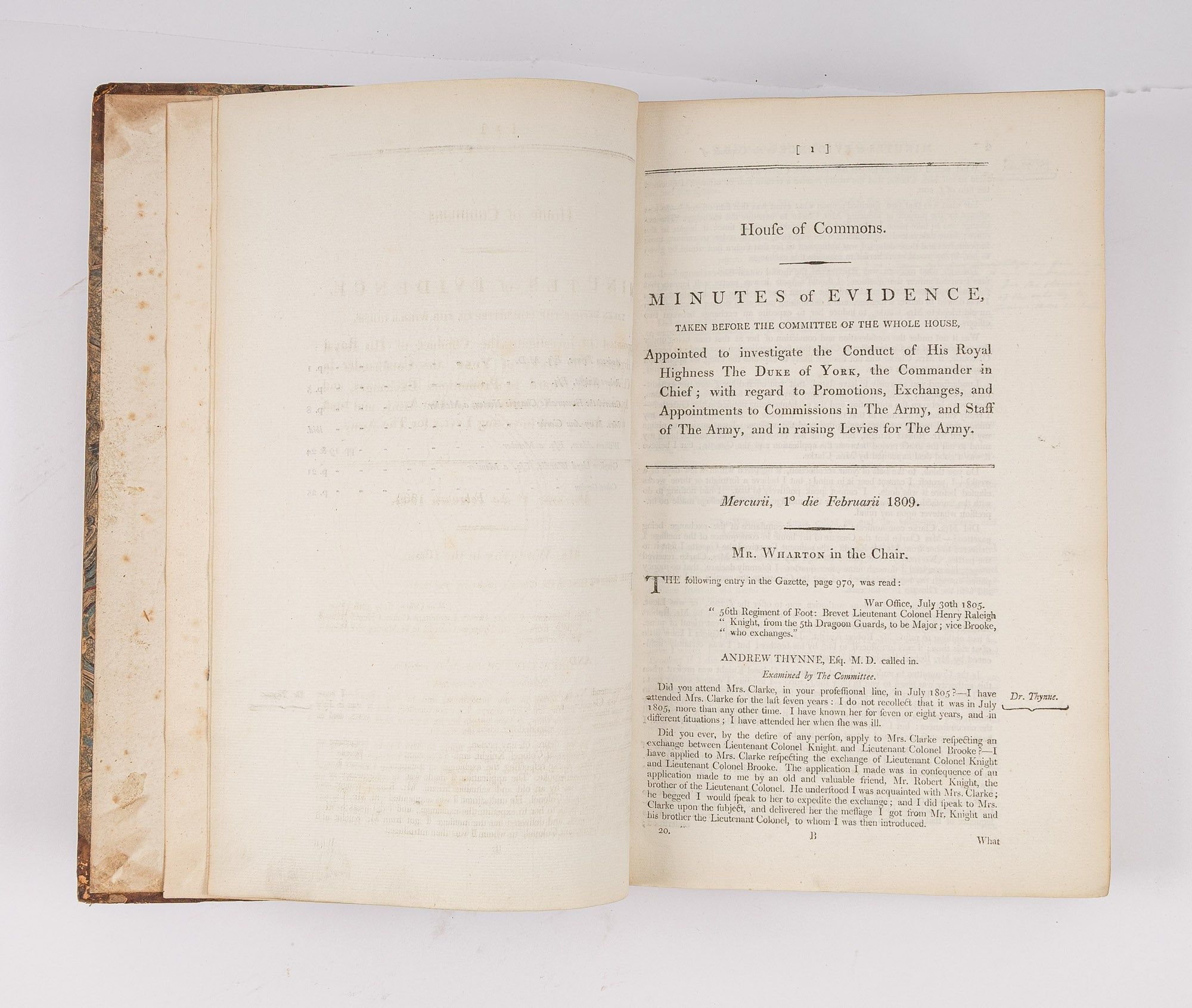 1809. An Inside Look at One of Georgian England's Great Scandals [House of Commons]. [Frederick Augustus, Prince, Duke of York and Albany (1763-1827)]. Minutes of Evidence, Taken Before the Committee of the Whole House, Upon the Conduct of His Royal Highness the Commander in Chief. [London]: Ordered, by The House of Commons, to be printed, 1809. [iv], 180, [2], 221-372, [2], 385-480 pp. Text in 12 parts, as issued, pagination irregular in places. Parts 5 and 9 lack appendices. Folio (12-3/4" x 8"; 32.3 x 20.4 cm). Contemporary three-quarter calf over marbled boards, rebacked retaining backstrip with gilt-edged raised bands and gilt titles, endpapers retained. Moderate rubbing, some wear to board edges and corners, which are bumped. Light toning to interior, negligible light foxing and soiling in a few places. Early owner signature of William Windham to head of front free endpaper, early underlining and annotations in the same hand to Parts 1-4 (last annotation on p. 118). An interesting and appealing volume. $1,250. * Only edition, issued by the House of Commons for internal use between February 1 and February 22, 1809. In 1806, it was discovered that Mary Anne Clarke, the mistress of Prince Frederick, Duke of York and Albany, commander-in-chief and the second son of King George III, was selling commissions for personal profit (presumably with Frederick's cooperation). Investigated by Parliament, Frederick was exonerated, but he resigned his post after a large minority voted against him. He was reinstated two years later. This set of Parliamentary papers contains the testimony provided by witnesses to the House of Commons investigating committee. Windham [1750-1810], a notable Whig politician, was a contemporary of Edmund Burke, Charles James Fox and Samuel Johnson, among other important statesmen and thinkers. He was renowned as an orator. Secretary at War from 1794-1801 and Secretary of State for War and the Colonies from 1806-1807, he clearly had an interest in military matters like the Duke of York scandal. Parliamentary papers like these were printed exclusively for the use of Members and are often scarce. OCLC locates 11 copies of this set, 1 in a North American law library (Georgetown). Hansard's Catalogue and Breviate of Parliamentary Papers, 1696-1834 189.