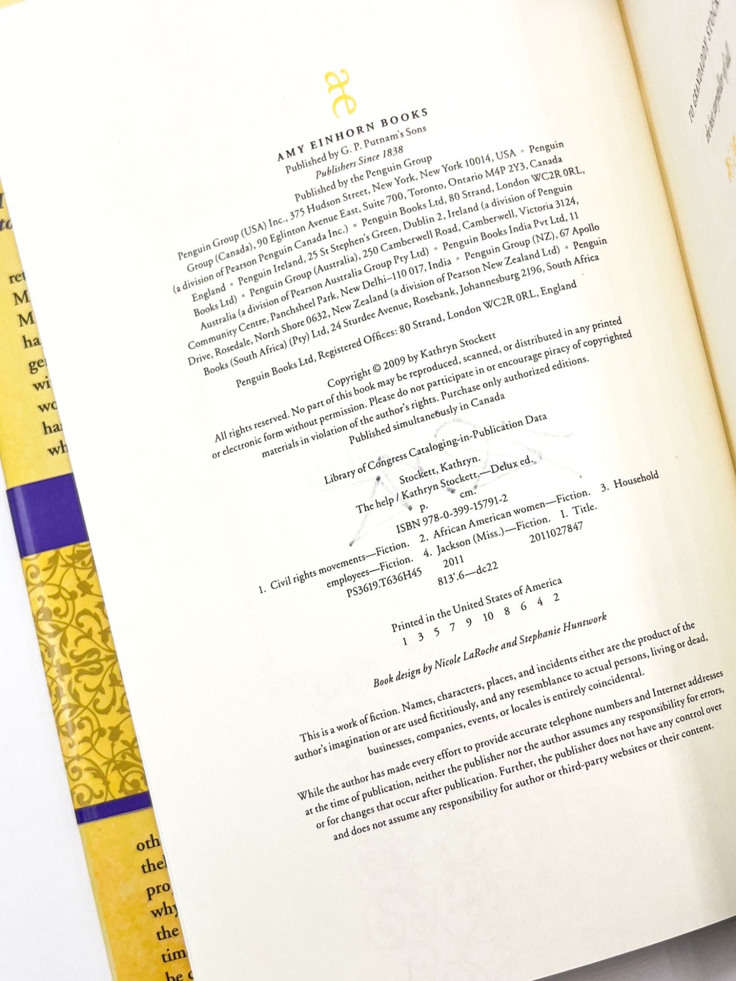 New York: Amy Einhorn Books / G. P. Putnam's Sons, 2009. First printing. Fine in fine jacket.. Signed deluxe edition of this story of three women in mid-century Mississippi struggling against their roles, adapted into an Oscar-winning film. Octavia Spencer earned an Academy Award for Best Supporting Actress for her role in the movie adaptation of THE HELP. This handsome edition was issued in 2011 to capitalize on the success of the film. 9'' x 5.75''. Original quarter purple cloth over purple boards with gilt titles and decoration. Original unclipped ($30.00) color pictorial dust jacket, with matching promotional wraparound band. Decorative endpapers. 456 pages. Signed by Stockett on the title page. Tiny smudge to front free endpaper. Pages faintly toned. Touches of shelfwear. Else sound and bright.