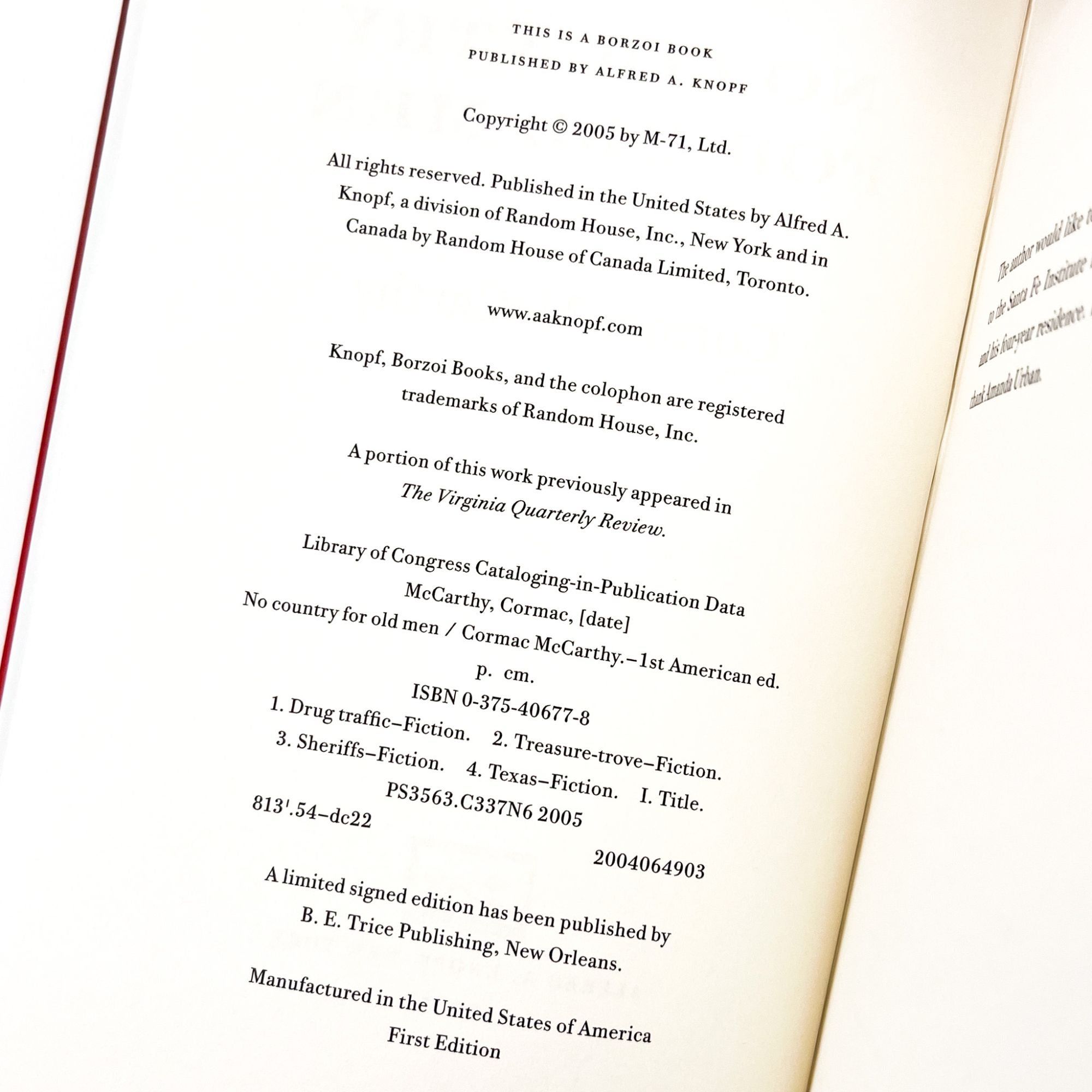 New York: Alfred A. Knopf, 2005. First edition. Fine in very good jacket.. First printing of McCarthy's brutal modern classic, a beautiful copy. McCarthy's stunning Western started life as a screenplay, was rewritten as a novel, and was ultimately adapted into one of the more stunning Coen Brothers films of the last twenty years. Harold Bloom, unable to discern a satisfying moral argument in its wanton coin-flipping, didn't like it, which can only be taken as a glowing recommendation. A pristine copy of this fully realized masterwork of bleakness and pitiless doom. 8.25'' x 5.5''. Original black paper boards, gilt-lettered spine. In original unclipped ($24.95) red pictorial dust jacket designed by Chip Kidd. Fore-edge machine deckle. [8], 309, [3] pages. Jacket front panel with a couple areas of small indentations, only just visible under mylar. Else bright, clean, sharp, and tight.