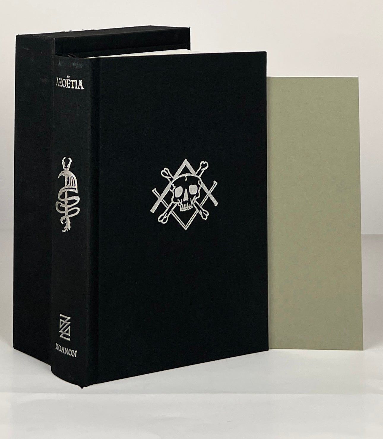 Xoanon Publishing, 2002. First Edition. Leather-bound. Fine. Standard slipcased edition limited to 484 copies with a laid-in pamphlet "The Rite of Amethystine Light." Fine in a Near Fine slipcase, some minor fraying and thumb soiling. Black cloth, a bit of soiling near the head of the spine, with silver gilt lettering and designs on the spine and front board. Square and firmly bound with a sewn-in bookmark, clean internally. A limited ten-year anniversary edition of Chumbley's grimoire, "the definitive edition of Andrew Chumbley’s groundbreaking foundational work on the Sabbatic Tradition.