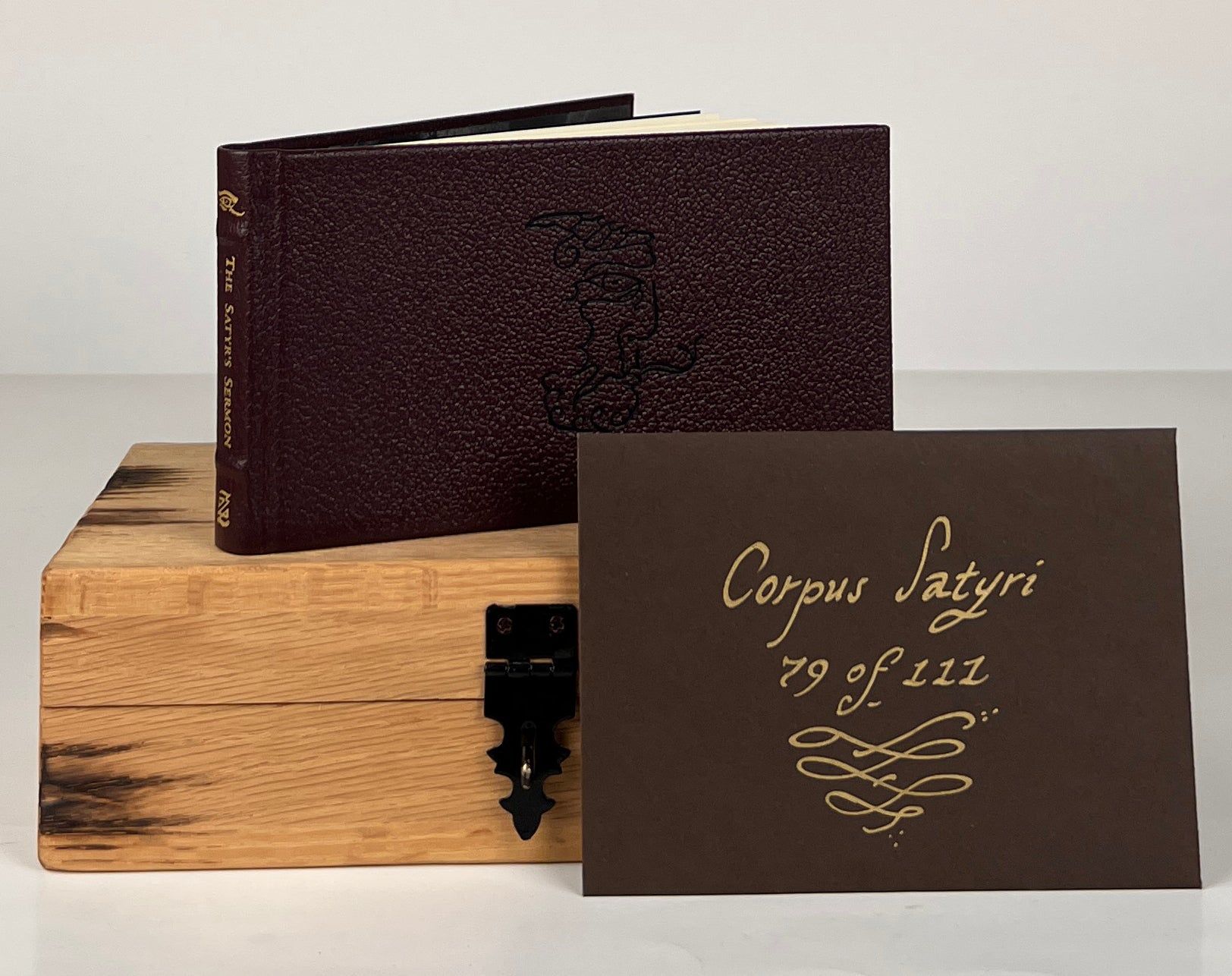 Xoanon Publishing, 2009. First Edition. Leather-bound. Fine. Deluxe Edition, limited to 111 copies in full leather with the Corpus Satyri and housed in the oaken box. Fine. Brown morocco leather, with two raised bands and gilt lettering on the spine, black ink illustration on the front cover. Square and firmly bound, clean internally. A collection of Chumbley's writings originally handwritten in 2004 for the Monadic Transmission series of grimoria.