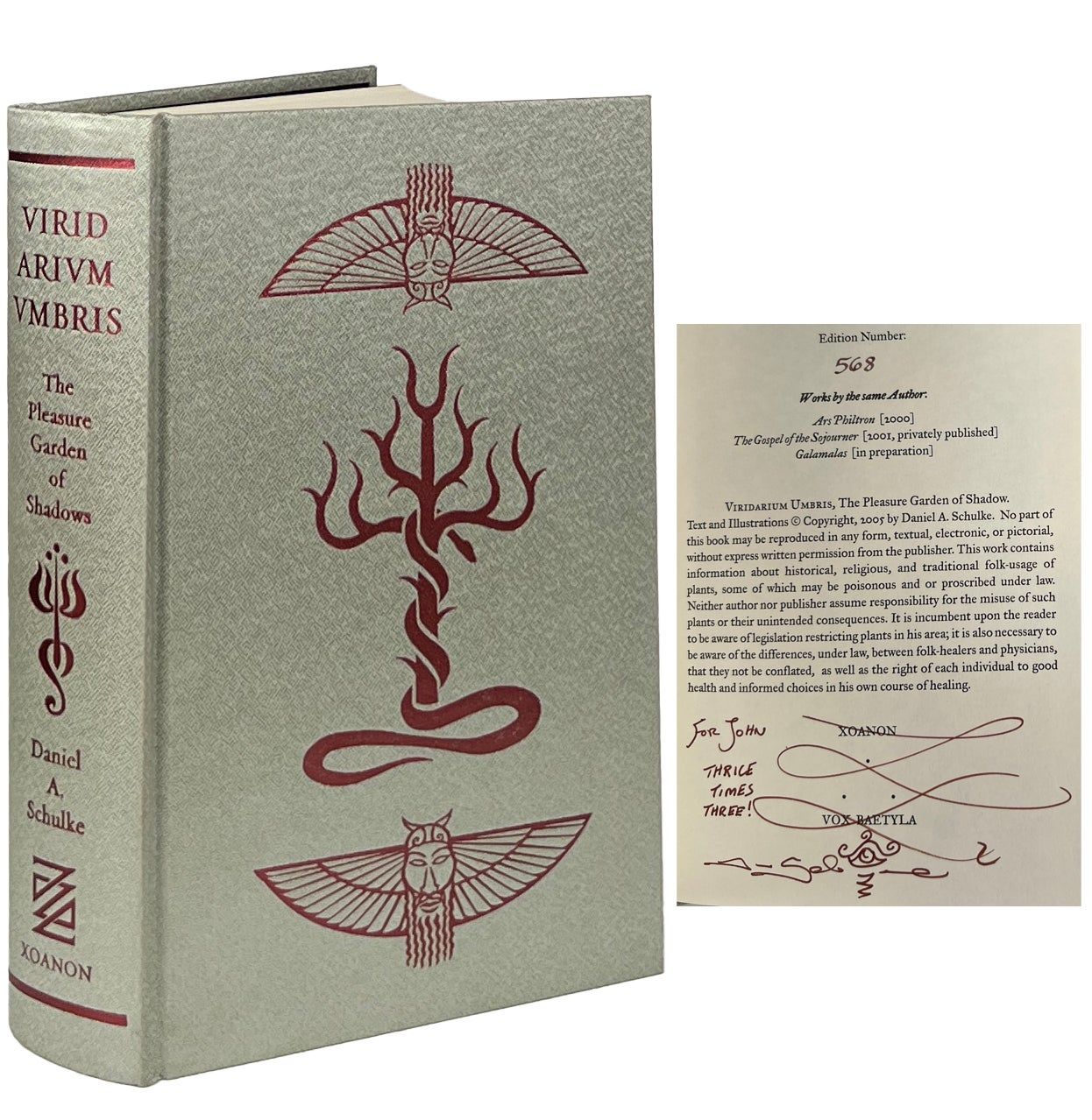 Xoanon Publishing, 2005. First Edition. Hardcover. Fine. Limited to 576 copies bound in sage green cloth. Inscribed on the limitation page by Schulke. Fine. Clean cloth with bronze gilt lettering and designs on the spine and front board. Square and firmly bound, clean internally. From Schulke's Exordium, "More than a simple book of magical plant virtues, this work is become the Flesh of the Eternal Garden itself, a portal unto a means of daily living; a pilgrimage of empowered interaction with the spirit world [...] It is for those working daily to preserve teachings of traditional herb magic in the face of great ordeal, the herbalists, folk-healers, and practitioners of spirit-medicine, that the Leaves of this book come forth upon the Spirit Tree and speak.