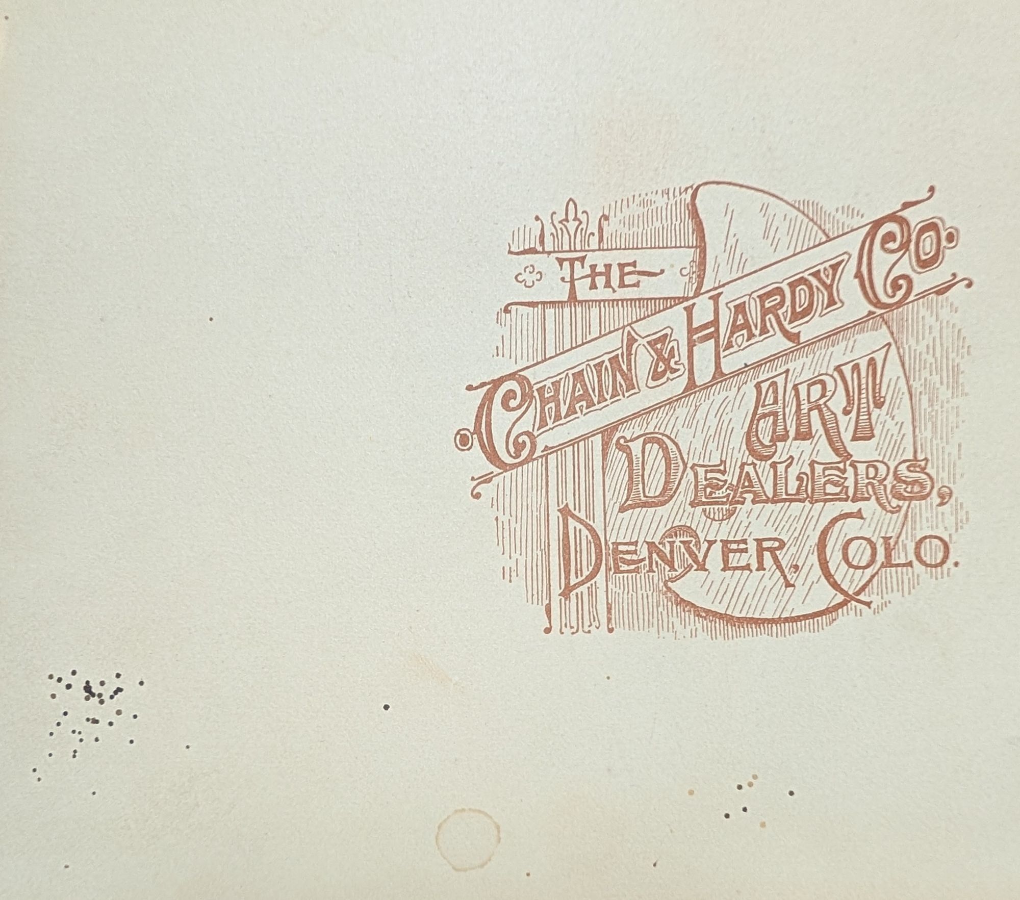 Denver: The Chain & Hardy Co. Art Dealers, 1890. Photograph. Near Fine. Boudoir cabinet card. Albumen photograph [7 5/8" by 4 2/8"] on tan mount with rounded corners [8" by 5"]. Chain & Hardy Co. backstamp. Image is in fine condition. One very small moisture stain, along with two areas of very tiny dot-sized stains, on the reverse.