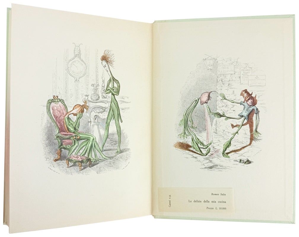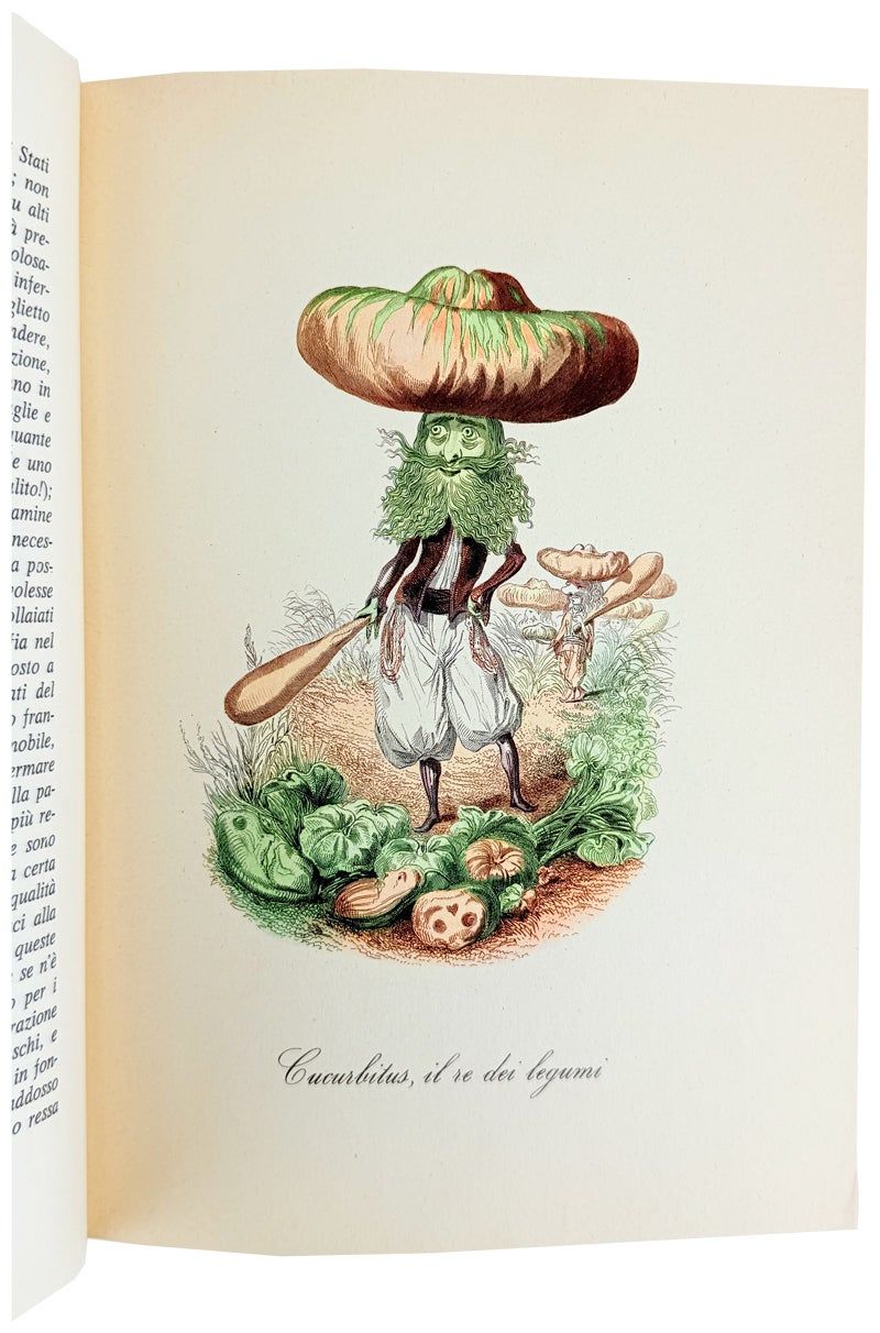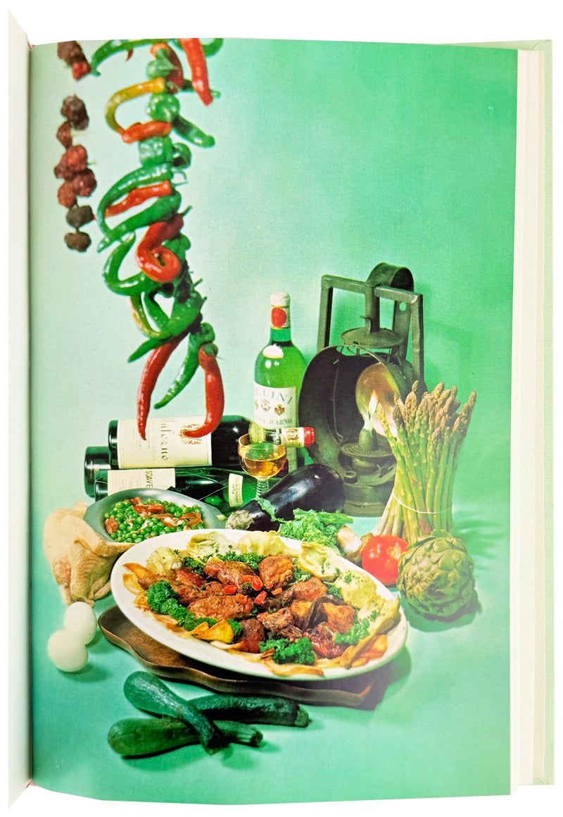 Roma [Rome], Italy: Canesi AG, 1962. Very Good. [Roma]: Canesi AG, copyright 1962 but 1964. First Italian Edition. Large octavo (24cm); publisher's pale mint green cloth, spine stamped in red and gilt, pictorial endpapers, in original cloth slipcase with pictorial paste-ons to both panels; 311pp.; forty (40) leaves of plates, including reproductions of the 19th century lithographs of Gabriel de Gonet depicting anthropomorphic vegetables; full color photographs; and eighteen original mounted Italian food labels (liquor, olive oil, etc.). Cloth a bit dusty and spine panel quite toned, slipcase particularly dust-soiled and a bit frayed at margins; overall a Very Good and sound copy.