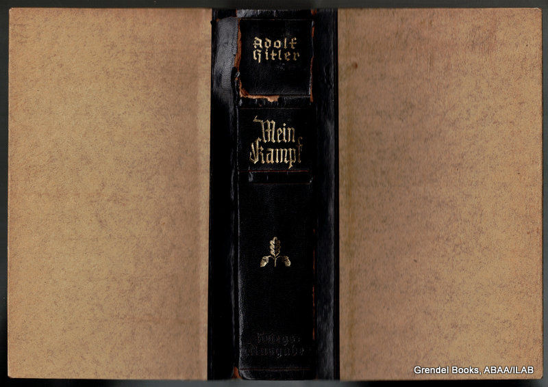 Munich:: Zentralverlag Der NSDAP,. Good. 1940s. Hardcover. Text is in German. Single volume, "wedding" edition. Octavo, bound in tan paper covered boards, black leather with gilt lettering and design along the spine, duotone photograph of Hitler frontispiece with a facsimile of his siganture below the photo. Edge worn with cracks to the leather at the crown of the spine, damp stain throughout the text block at the upper spine corner, previous owner's name and notation on front free endpaper, else good. No dust jacket. ; 781 pages .