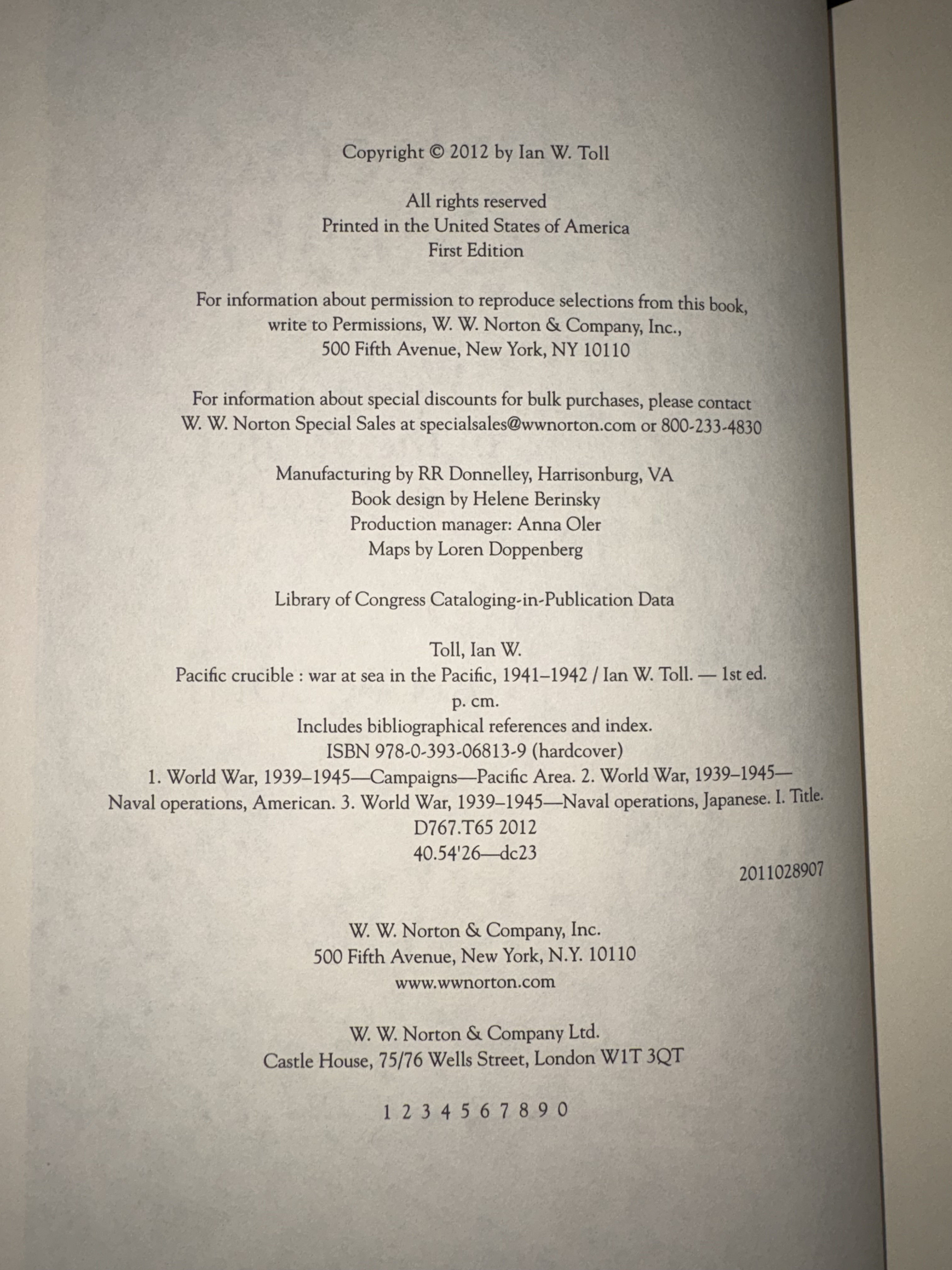 First Edition/First Printing with the complete number line; A Near Fine book in a Near Fine dust jacket, with a mild push to both spine ends, light rubbing to the jacket edges, and one tiny chip to the front top corner. SIGNED, inscribed, and dated by the author to the half title page. An outstanding copy of this first volume of Toll's Pacific War Trilogy; this title uncommon in the first printing, rare indeed signed. Not remaindered, not price-clipped, not ex-library; in a protective Mylar cover and will ship securely wrapped in a sturdy box.