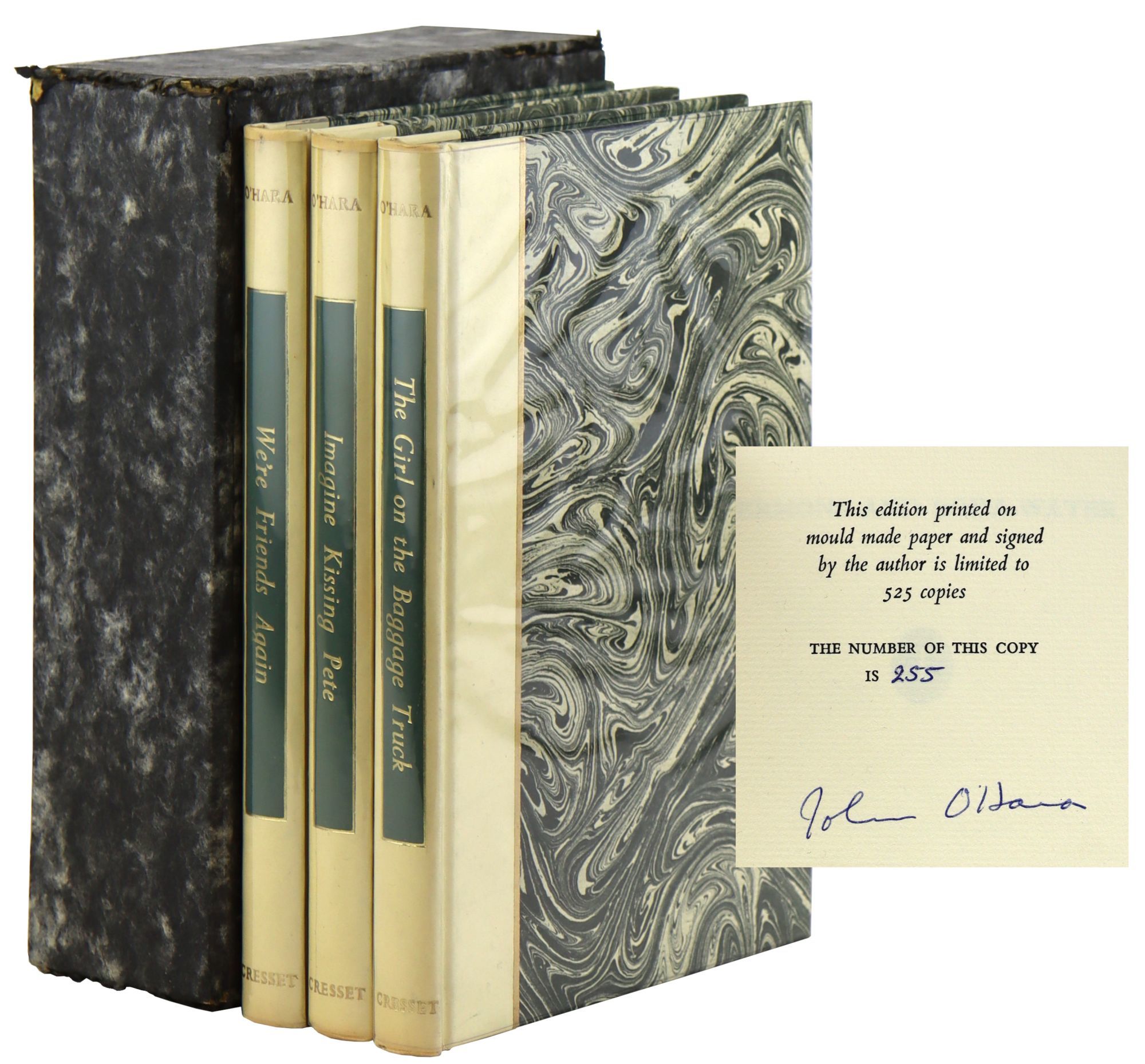 Slipcase sturdy but with some shelf wear, back seams starting to split but secure. Books are in very good condition. Topstains faded. Some toning to spines. Binding sound. Pages clean and unmarked. First volume signed and numbered by author John O'Hara. Overall, the set is in very good condition.