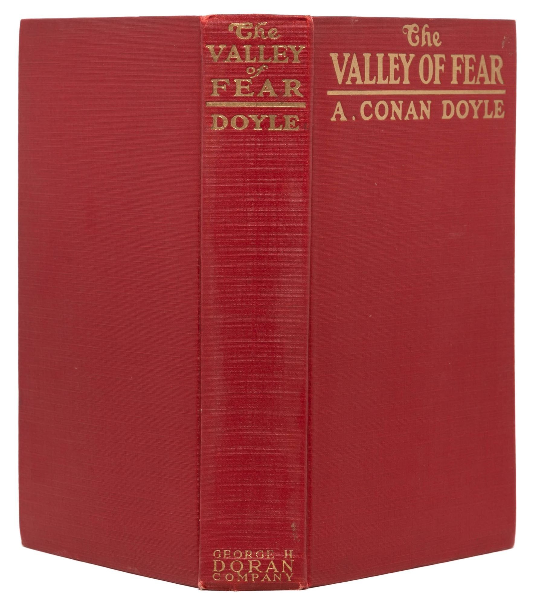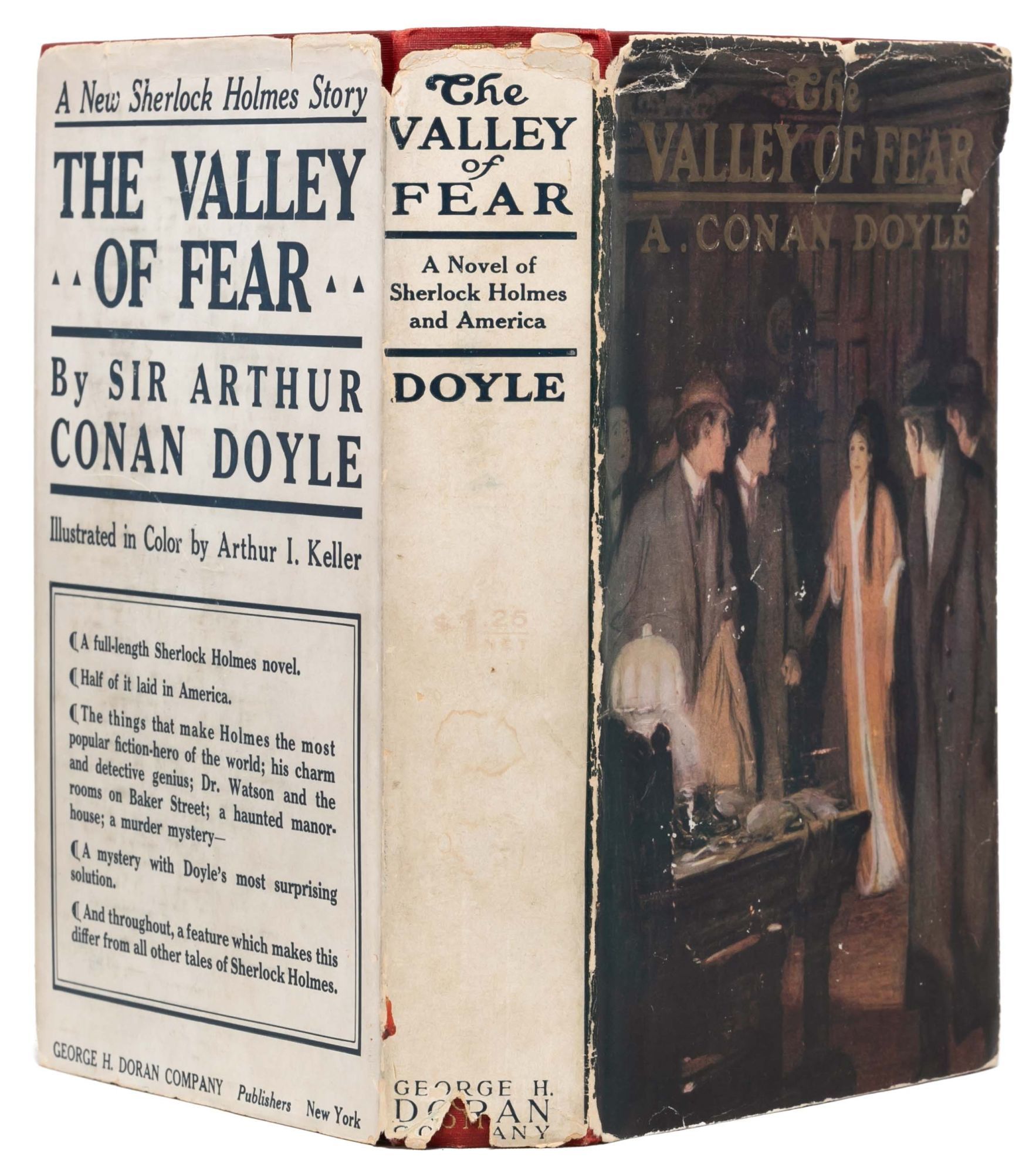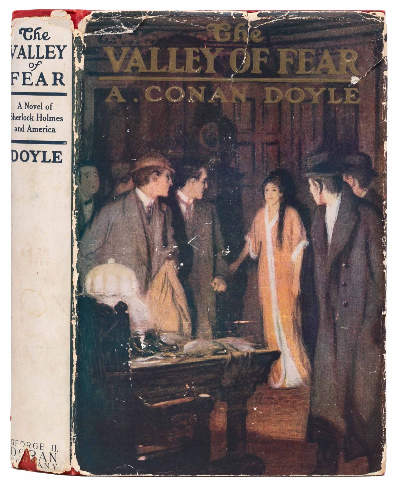 New York: George H. Doran, 1914. First edition. Near Fine/Very Good. First printing, of the fourth and final novel in the Sherlock Holmes series (there were also a number of short story collections). It preceded the UK edition by three months. Original red cloth, spine and front cover lettered in gilt. With dust jacket. Frontispiece and 6 plates by Arthur I. Keller. A bright Near Fine copy, with the spine just a bit cocked and an early gift inscription (in pencil) on the front free end paper. Very Good dust jacket unrestored. A few short tears at the top of the front panel, small chips from the spine ends (larger at the heel), rubbing to the folds, but a handsome example overall. Original price of $1.25 in red has faded on the spine, but is still legible.