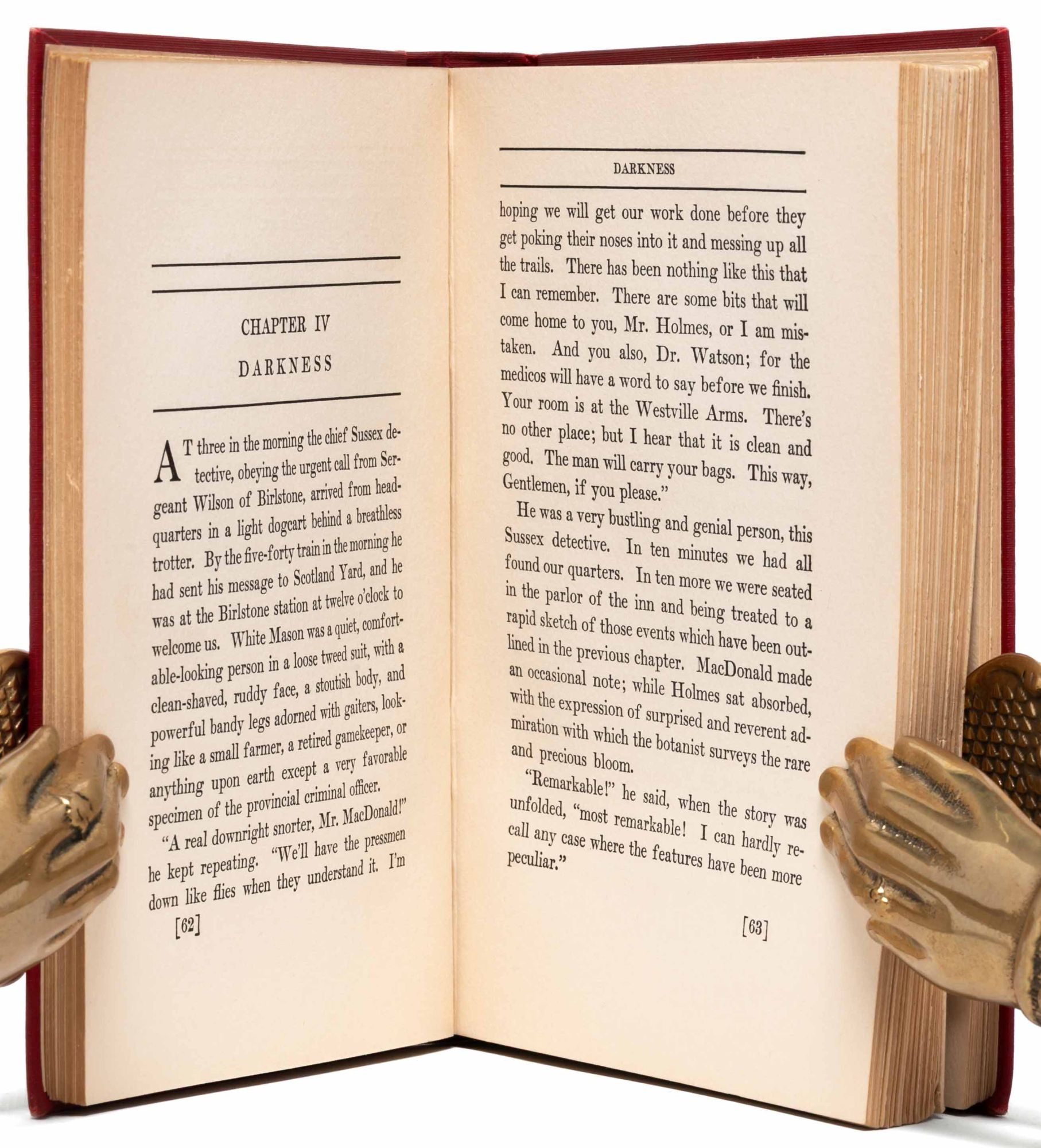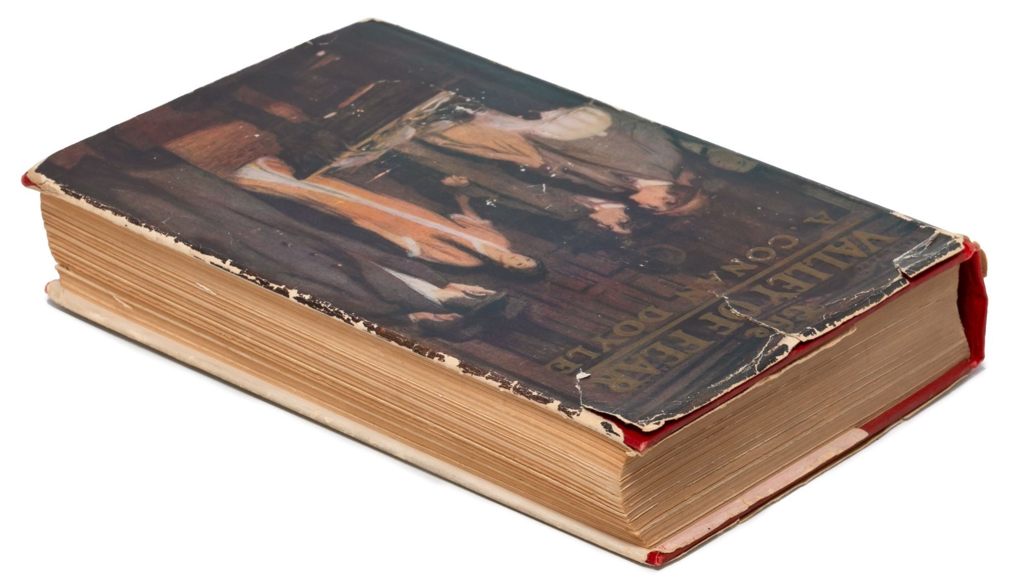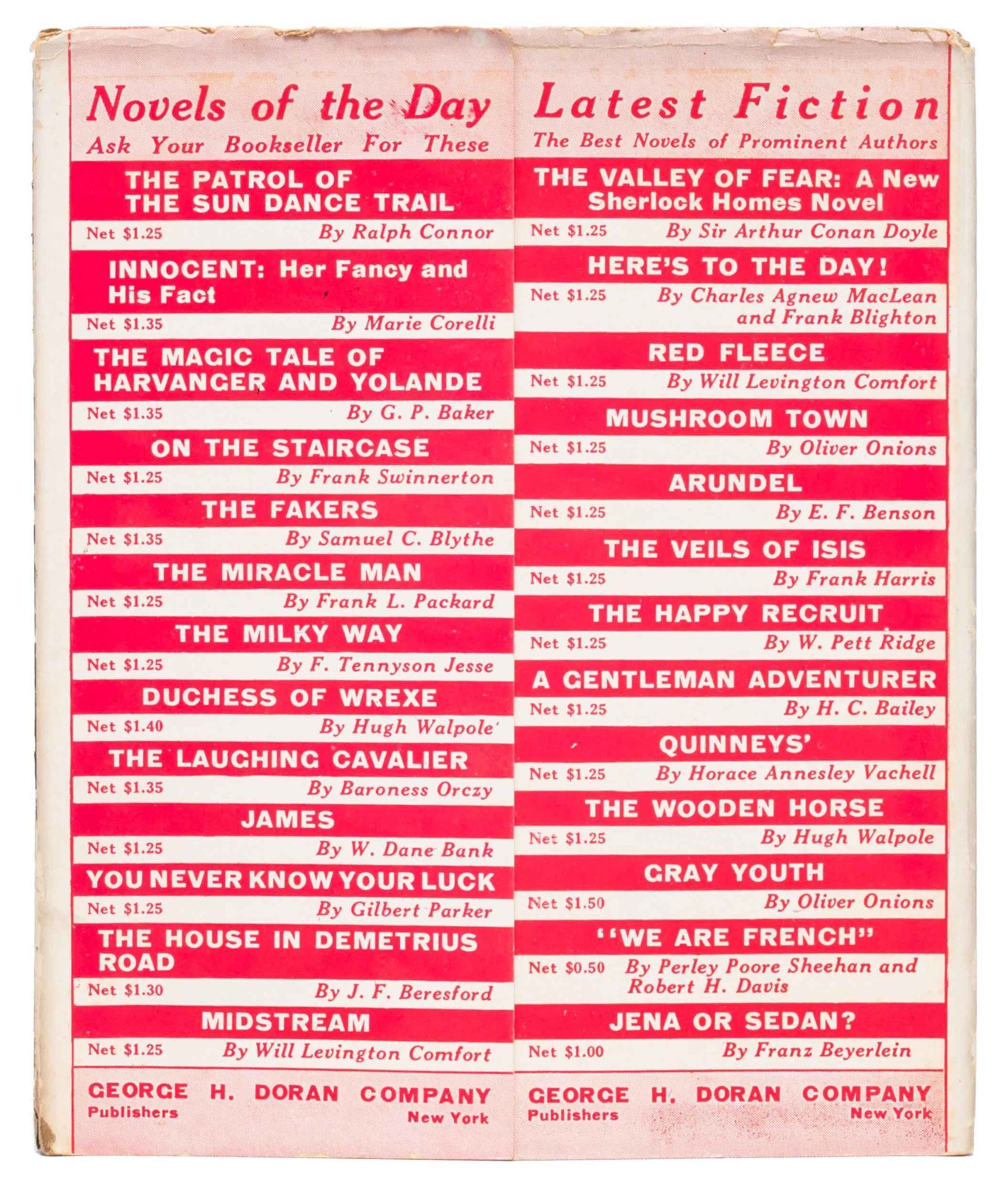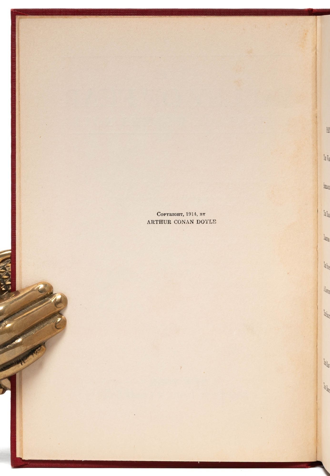New York: George H. Doran, 1914. First edition. Near Fine/Very Good. First printing, of the fourth and final novel in the Sherlock Holmes series (there were also a number of short story collections). It preceded the UK edition by three months. Original red cloth, spine and front cover lettered in gilt. With dust jacket. Frontispiece and 6 plates by Arthur I. Keller. A bright Near Fine copy, with the spine just a bit cocked and an early gift inscription (in pencil) on the front free end paper. Very Good dust jacket unrestored. A few short tears at the top of the front panel, small chips from the spine ends (larger at the heel), rubbing to the folds, but a handsome example overall. Original price of $1.25 in red has faded on the spine, but is still legible.