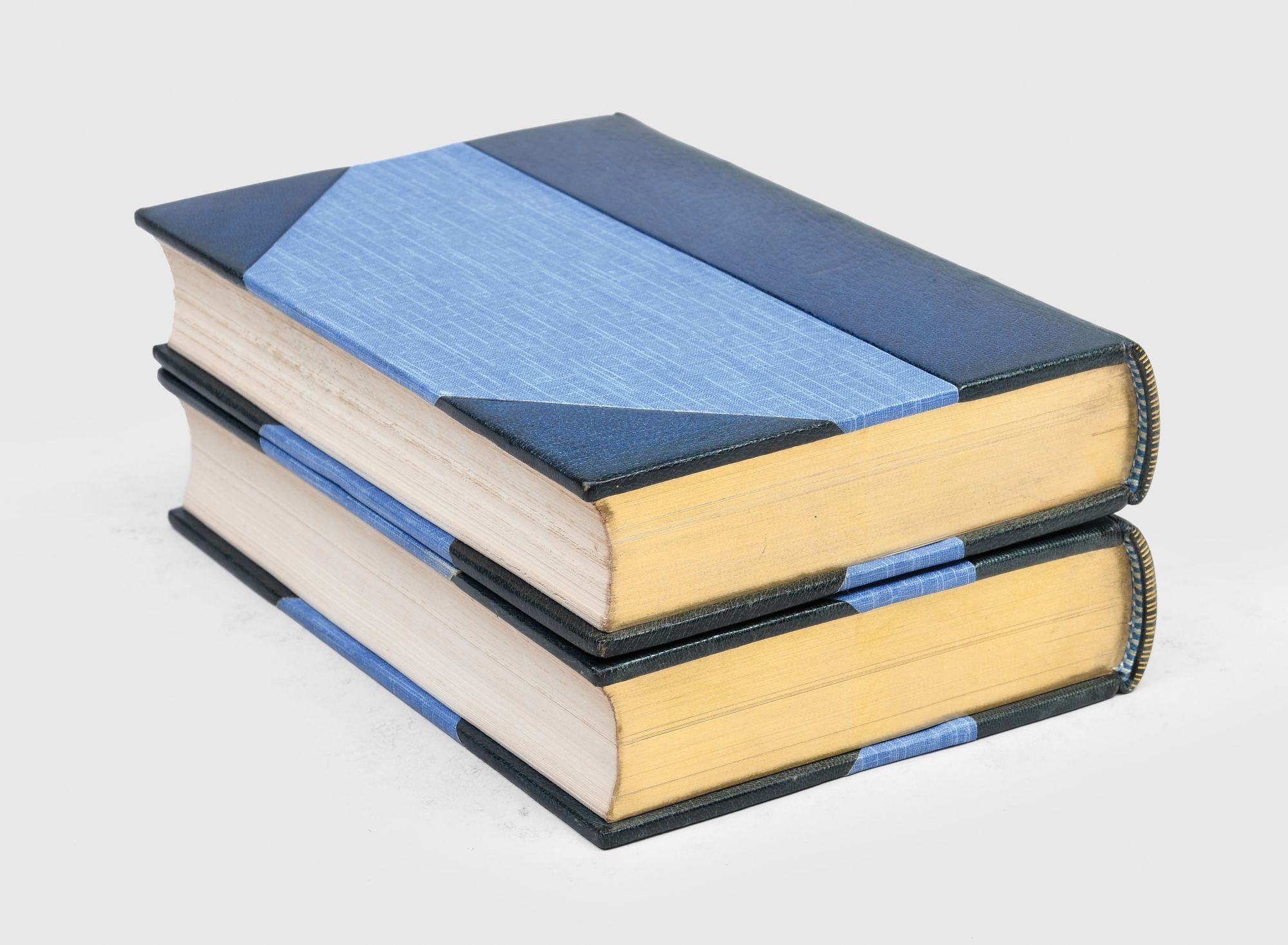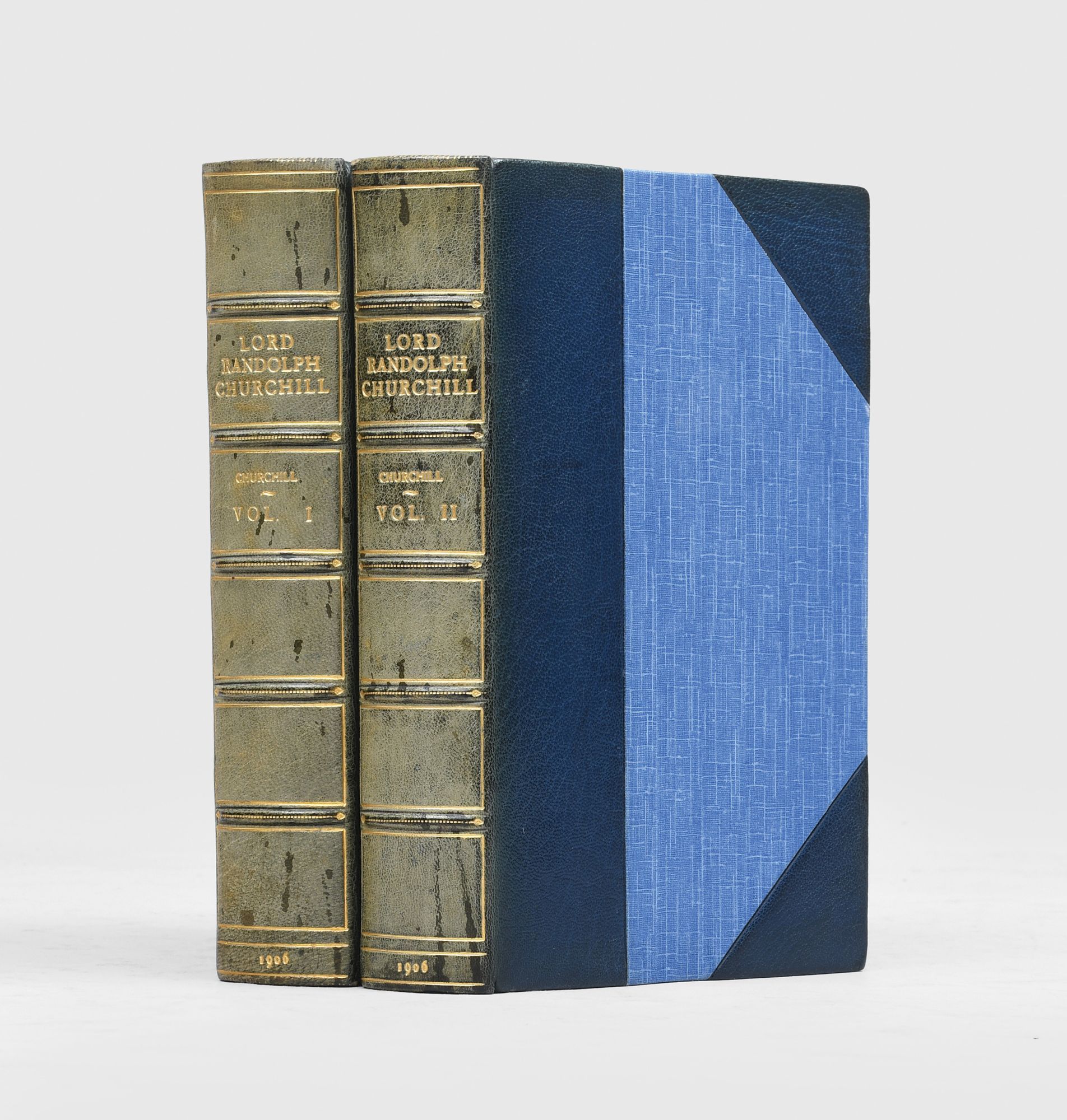 London: Macmillan and Co. Limited, 1906. First edition. Very Good. First edition of Churchill's biography of his father, the Conservative Party statesman Lord Randolph Churchill, handsomely bound. 2 vols, octavo (216 x 140 mm). Photogravure portrait frontispieces, 13 plates and 3 facsimiles, 1 folding, 1 double-page. Mid-20th-century blue half morocco by Bayntun, spines lettered in gilt, blue cloth sides, marbled endpapers, top edge gilt. Bookplate of John Thoburn Williamson (1907-1958), Canadian diamond magnate who built a significant book collection. Spines sunned with some soiling, very minor rubbing, some light foxing. A very good copy.