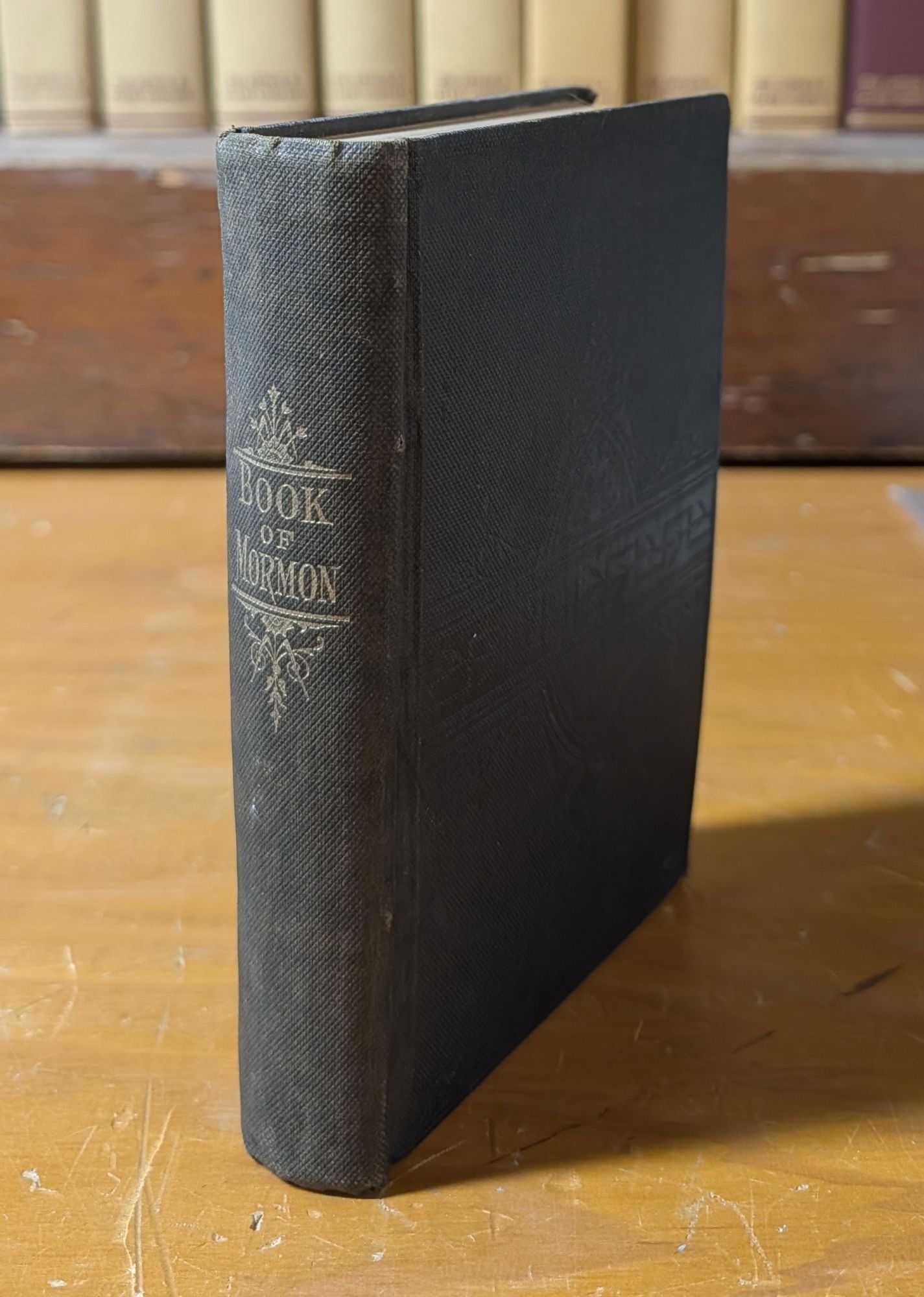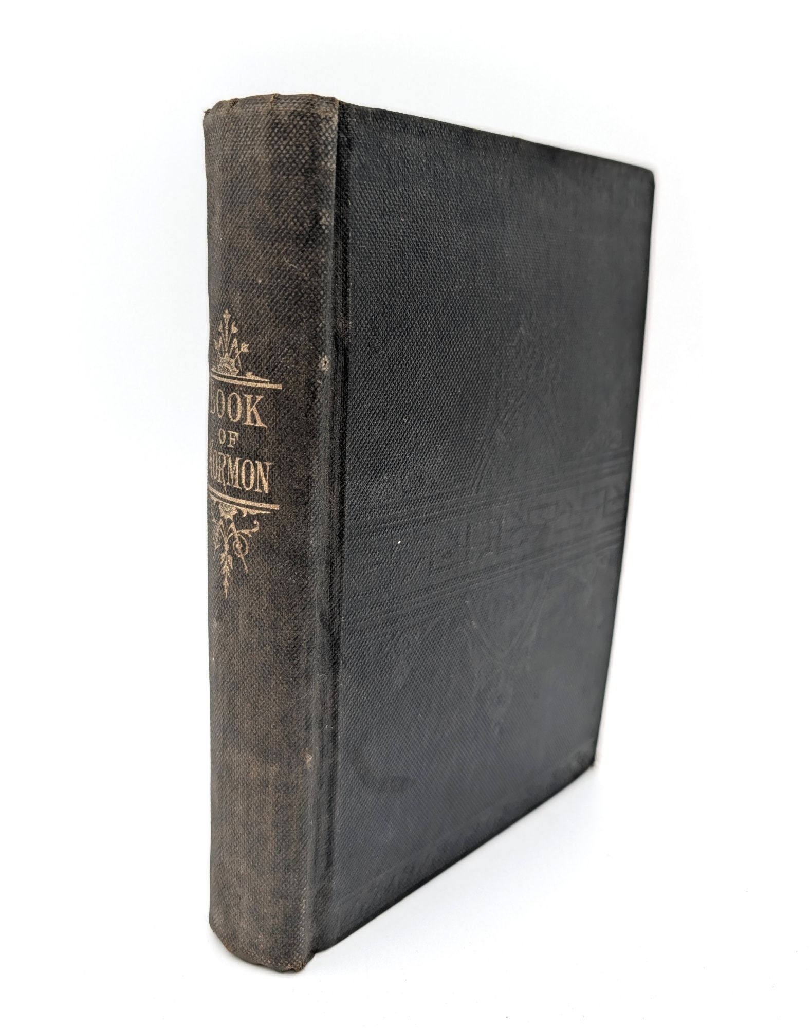 Salt Lake City, UT: Deseret News Company, Printers and Publishers, 1888. Salt Lake City edition. Hardcover. Near Fine. xii; 623pp. Sextodecimo [16.5 cm] Black cloth over boards with a gilt stamped title and ornamental embellishments on the spine and decorative embossed designs on the boards. Red speckled text block edges. Very subtle sunning to the spine. Bookseller's label on the front pastedown. Thin 1" barely perceptible moisture stain on the front board. Several pages with insignificant stains. Occasional minor imperfections in the printing of the page numbers. Internally sound, collated, and complete. Division into Chapters and Verses, With References, by Orson Pratt, Sen. Flake/Draper 624. Same as the 1885 Salt Lake City edition.