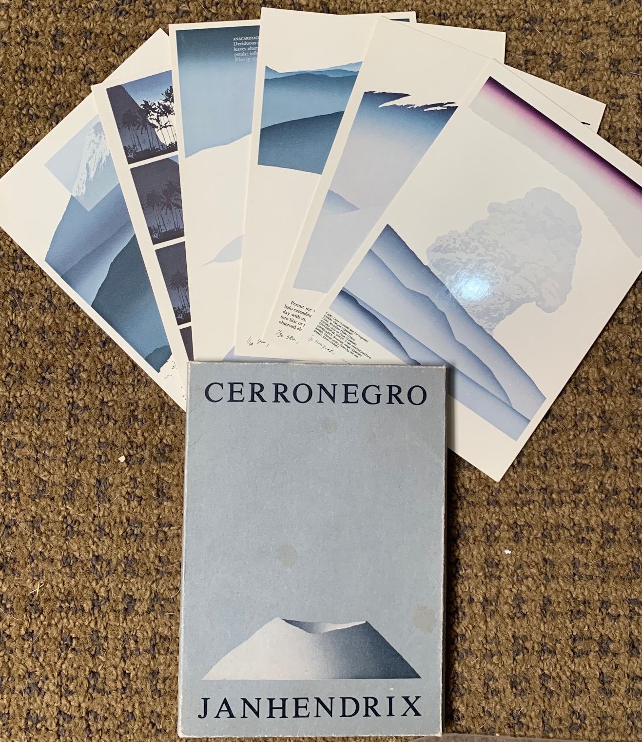 México, D.F.: Galeria O.M., 1983. duotone plates, loose as issued, inside illus. portfolio. Title from cover. "6 tarjetas postales de portafolio "Cerro Negro I" que contiene 6 serigrafias de Jan Hendrix, editado en Amsterdam, 1983, por Printshop Piet Clement." Postcards with photographic reproductions of the screen prints made by Jan Hendrix (Dutchland 1949, lives and works in Mexico) for the folder on volcanoes entitled Cerro Negro I (1983), images that evoke a modern version of the naturalist's notebook, overlaped with photographic images, annotations, book quotations and scientific descriptions of phenomena and geological formations. OCLC 5 copies (2 in the USA).