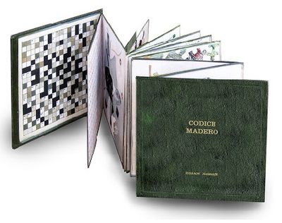 México: Galería Pecanins, 1983. one folio folded accordion style, chiefly color plates, dark green boards. plus one [4] page booklet. Cover title. Cover title. Imprint from inside back cover; Imprenta Madero from briannissen.com. Artist's book with images involving rituals of games and play; based on the format of the Pre-Colombian screen-fold codices. Accordion-fold binding. Issued in printed envelope. Edition of artist by Brian Nissen (London, 1939, has lived and works in New York and Mexico since 1978) who creates a modern codex dedicated to childhood and adult games, remembering the Pre-Columbian god of games Macuiloxochitl and the British author Lewis Carroll. Collector's edition, printed outside of commerce. Brian Nissen says that the codices he makes are a permanent source from which he draws his art. Undoubtedly there we find the traces or textures that are the origin of many of his works. His codices are a concentration of imagery and styles, a great catalog of colors and shapes, find and found objects. Only two records in OCLC.