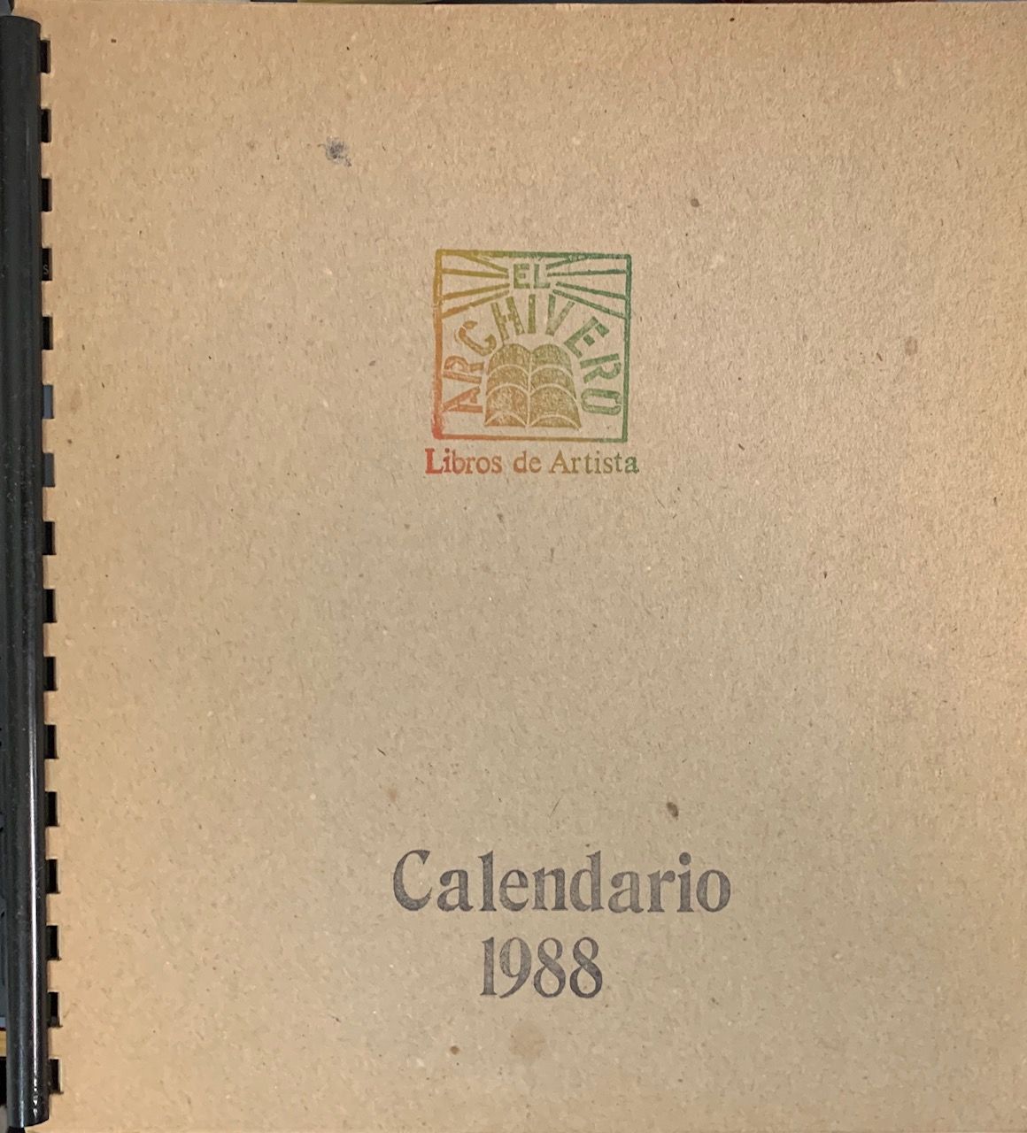 México, D.F.: El Archivero Libros de Artista; Cocina Ediciones; La Amenaza Elegante, 1987. b/w plates, facs., ink stamps, calendar pages, last page with 2 ink stamps and one embossed stamp "La Amenaza Elegante", black plastic spiral bound wrps. NUMBERED AND LIMITED EDITION OF 100. Handmade calendar for 1988. "Este calendario se terminó de imprimir en diciembre de 1987. Fue impreso en fotocopia y sellos de goma por El Archivero, Cocina Ediciones y la Amenaza Elegante," --Colophon.