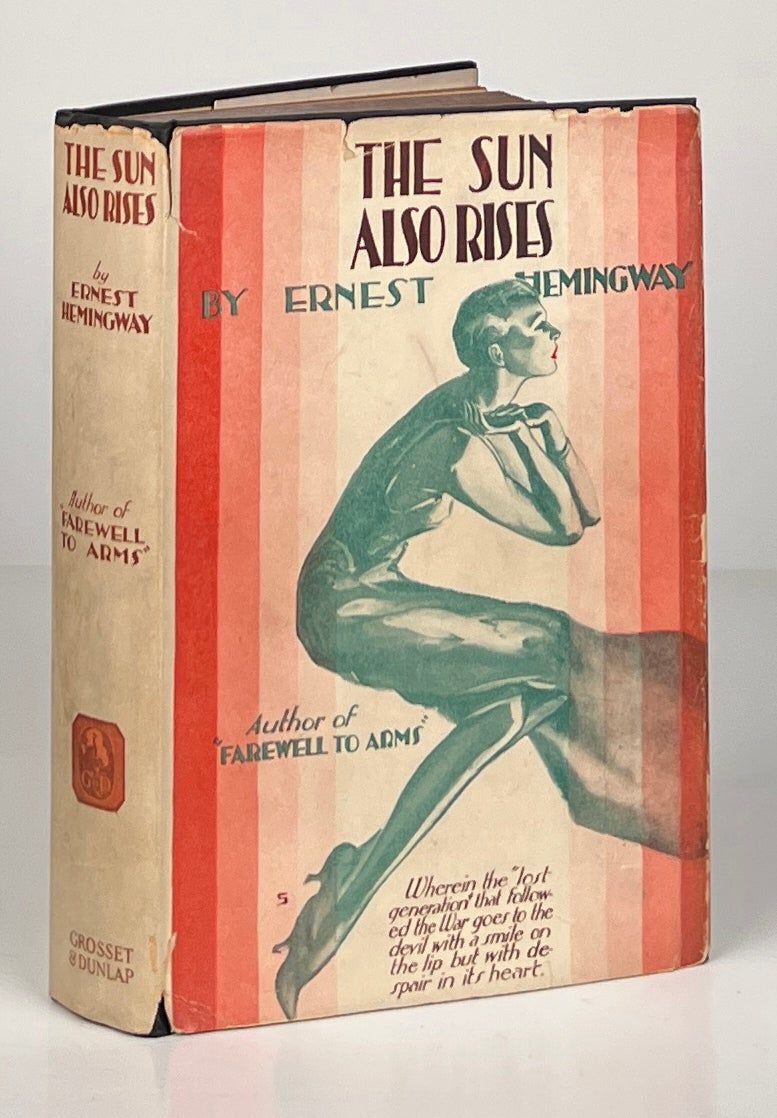 New York: Grosset and Dunlap, 1926. First Edition Thus. Hardcover. Near Fine/Very Good. Near Fine in a Very Good jacket, unclipped (no price), generally toned and soiled, rubbed at the folds, some tears and chips at the edges. Black cloth with red labels on the spine and front board. Firmly bound with a forward lean, red topstain, clean internally. Hemingway's classic novel of expats traveling to Spain to take in bull fights and the running of the bulls.
