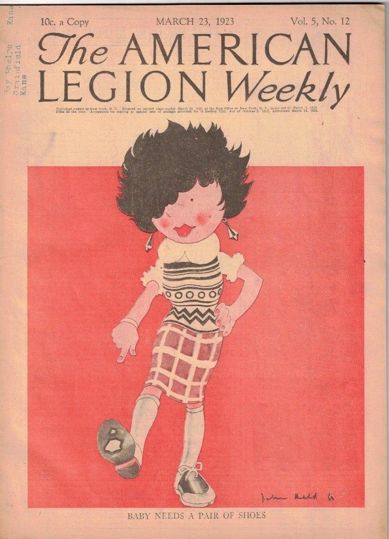 New York: Legion Publishing Corp, 1923. Original printing. Magazine. Very Good. 30pp. Thin quarto [28.5 cm] Illustrated wraps. Age-toned. Original owner's mailing stamp on front wrap. Official publication of The American Legion and The American Legion Auxiliary. Cover art by Utah-born cartoonist and illustrator John Held, Jr. Held (1889-1958), famous for his colorful drawings of flappers, was one of the best known magazine illustrators of the 1920s.