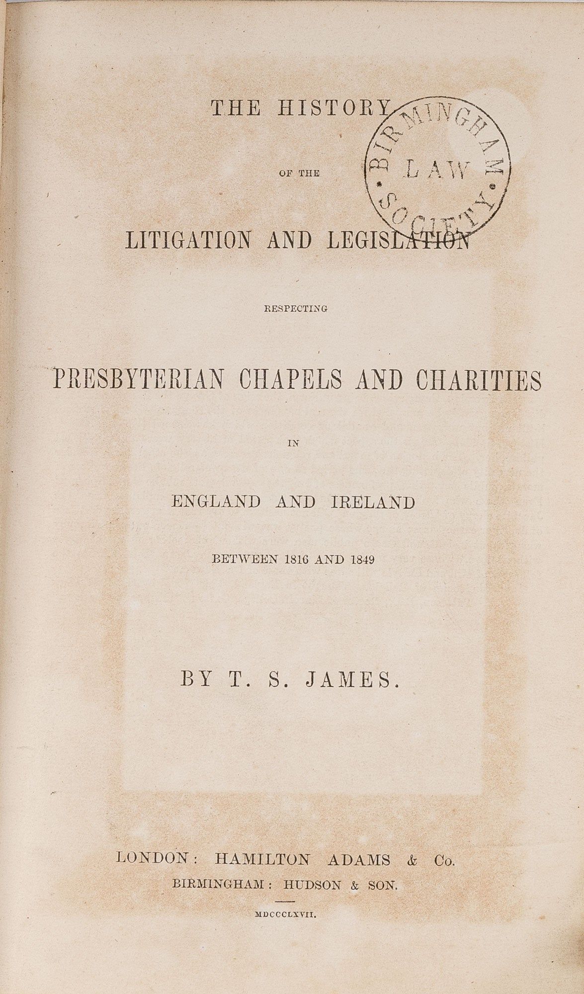 1867. James, T.S. The History of the Litigation and Legislation Respecting Presbyterian Chapels and Charities in England and Ireland Between 1816 and 1849. London H. Adams & Co., 1867. xl, 9-872, 11 pp. Brown library cloth with gilt stamped title to spine, institutional gilt stamp to front cover. Moderate shelfwear, small tear to head of spine, spine faded. Bookplate to front free endpaper. Property stamps to title page and several other pages. Good. $45.