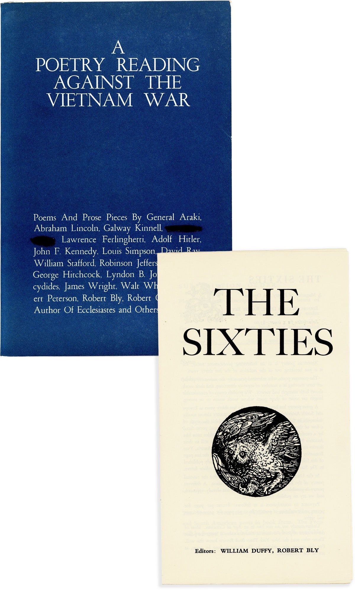 Madison, Minnesota: The American Writers Against the Vietnam War / the Sixties Press, 1966. First Edition. Softcover, with publisher's prospectus for The Sixties laid in. Octavo (21cm); blue paper wrappers; [4],5-63,[1]pp. This edition includes a black-out effect to front wrapper and throughout text, as the "The blackout spaces are in mourning for the poems of E.E. Cummings, for which permission was refused by Harcout Brace" (see copyright page). Lightly tanned, with modest shelf-wear and -soil; Very Good. Collection of verse includes Lawrence Ferlinghetti's "Where Is Vietnam?", William Strafford's "Watching the Jet Planes Dive", and Robert Creeley's "For No Clear Reason". [87998].