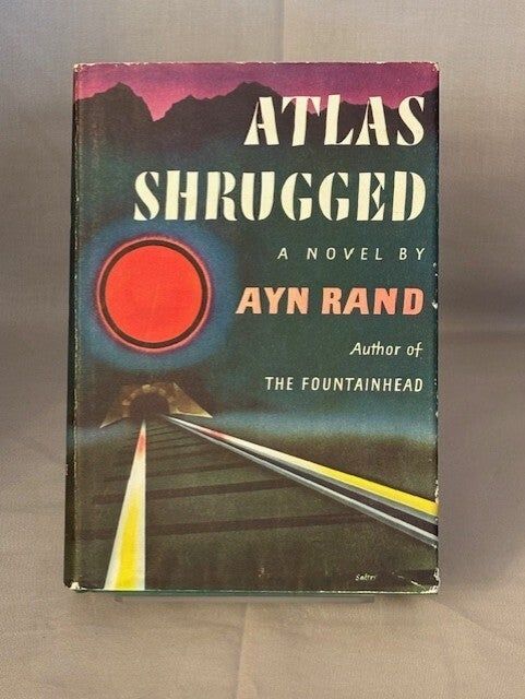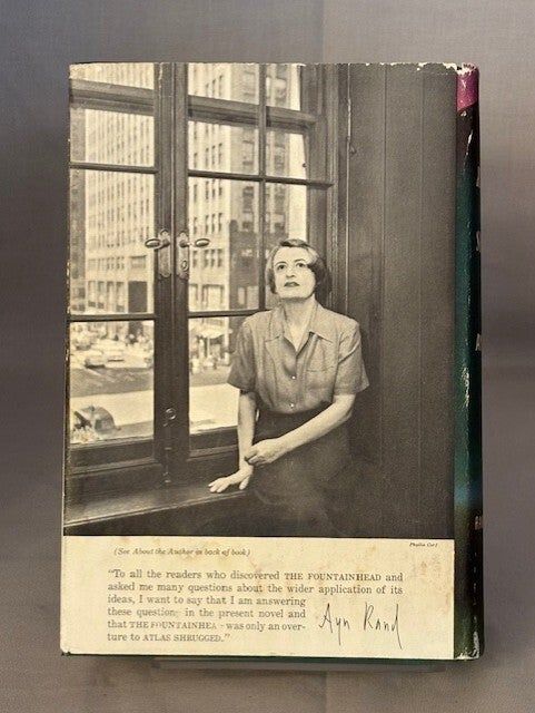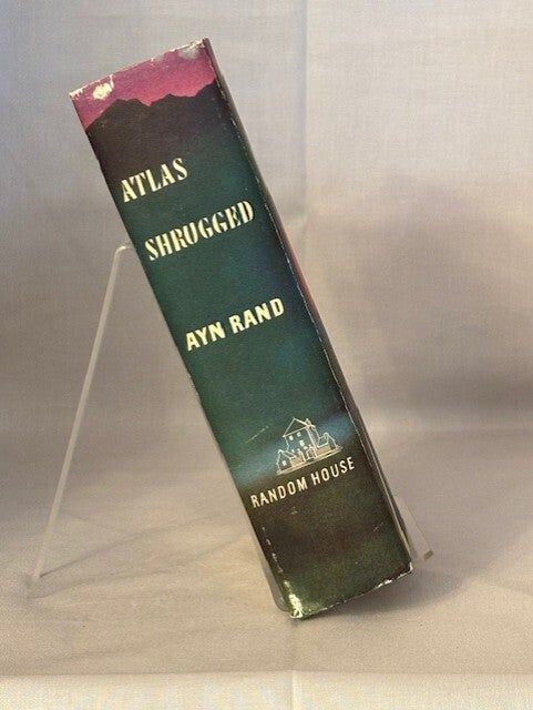 New York: Random House, 1957. First Edition. Near Fine/Very Good. First Printing (stated) in a very good, first issue dust jacket, with $6.95 on front flap and "10/57" printed on the lower front flap and the Random House name and address on the lower rear flap. Small, light stain at head and foot of dust jacket spine and nearly invisible stain along lower edge of front panel of dust jacket; light wear at extremities; Internally clean and bright, with no markings of any kind. Atlas Shrugged is Ms. Rand's most important work and embodies her philosophy of Objectivism. In a 1991 Library of Congress survey, a majority of Americans polled, named Atlas Shrugged as the book that had influenced their lives the most, next to the Bible. A handsome copy indeed.
