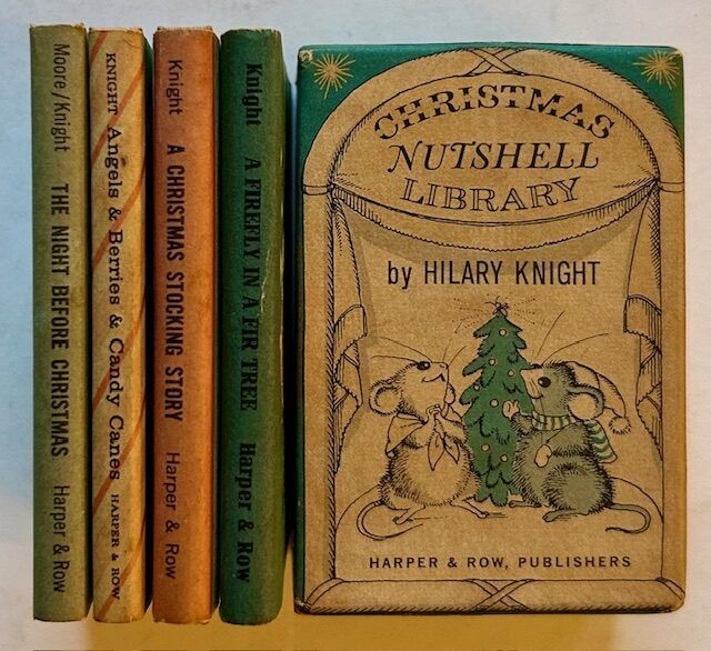 New York: Harper & Row, 1963. Pictorial cloth. Near Fine/Very Good +. Hilary Knight. The 1963 1st edition of this charming boxed 4-book collection in the Christmas Nutshell Library series. Each book, a miniature, is tight and Near Fine in its pink cloth (which denotes 1st edition). And each is in its crisp, Near Fine dustjacket ("A Christmas Stocking Story" alone shows a bit of light soiling to the panels). The 4 titles are as follows: Angels & Berries & Candy Canes; A Firefly in a Fir Tree; A Christmas Stocking Story; and The Night Before Christmas. The first 3 titles written by Hilary Knight, the 4th title of course written by Clement Moore. And all 4 titles wonderfuly illustrated in rich color by Hilark Knight (of "Eloise" fame). And finally, the 4 titles housed in the publisher's lovely pictorial card slipcase.