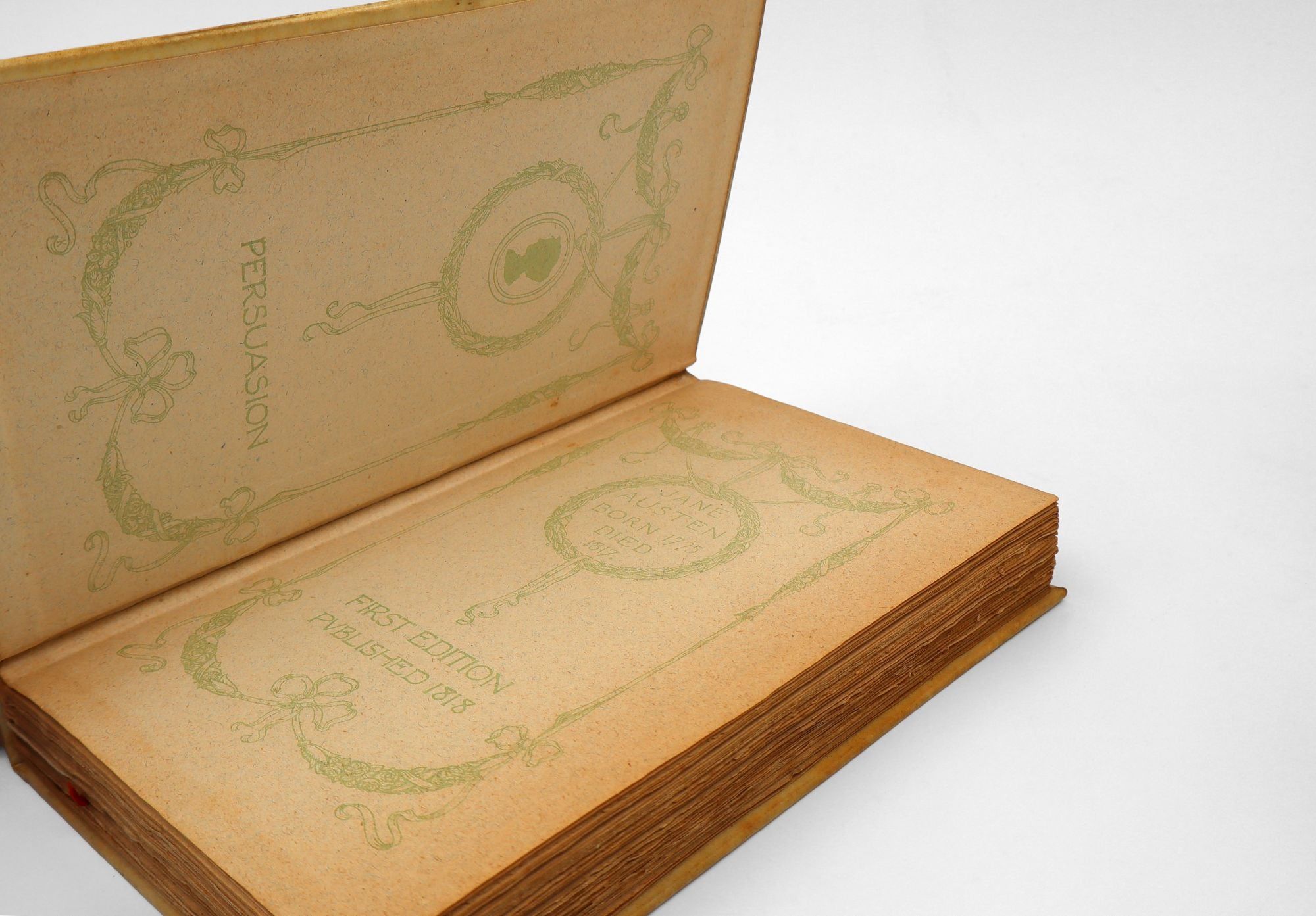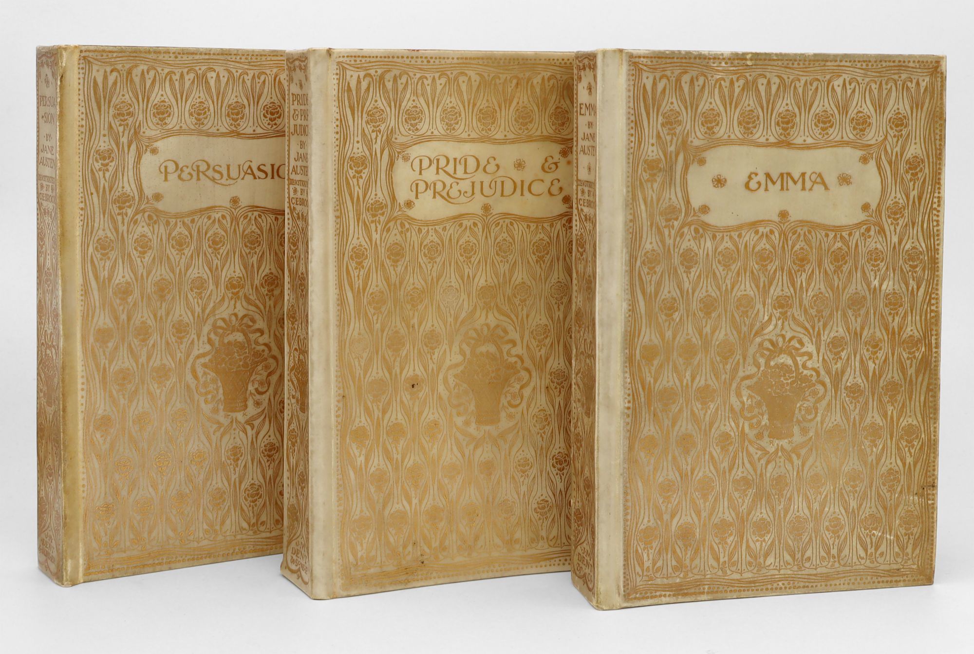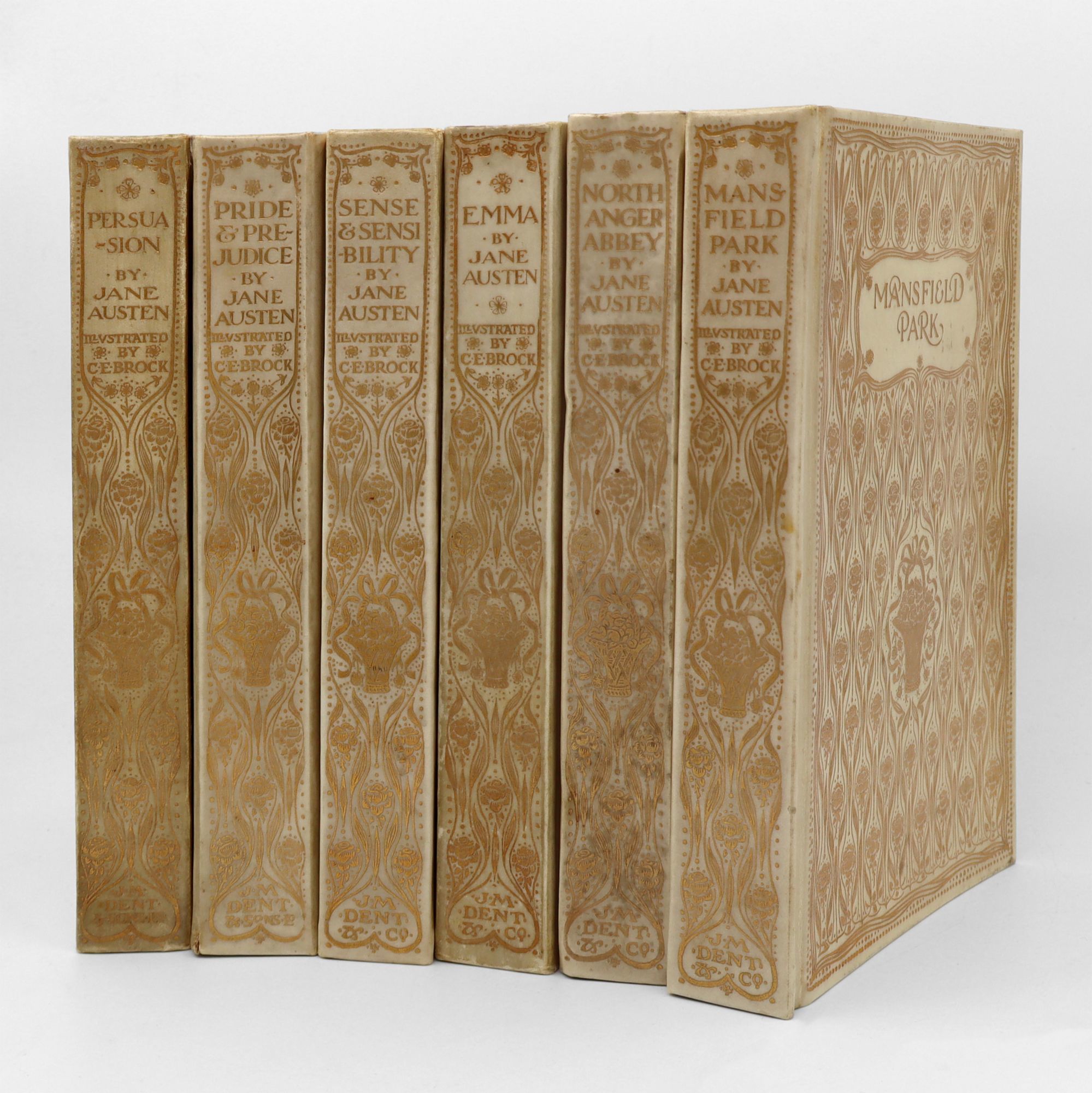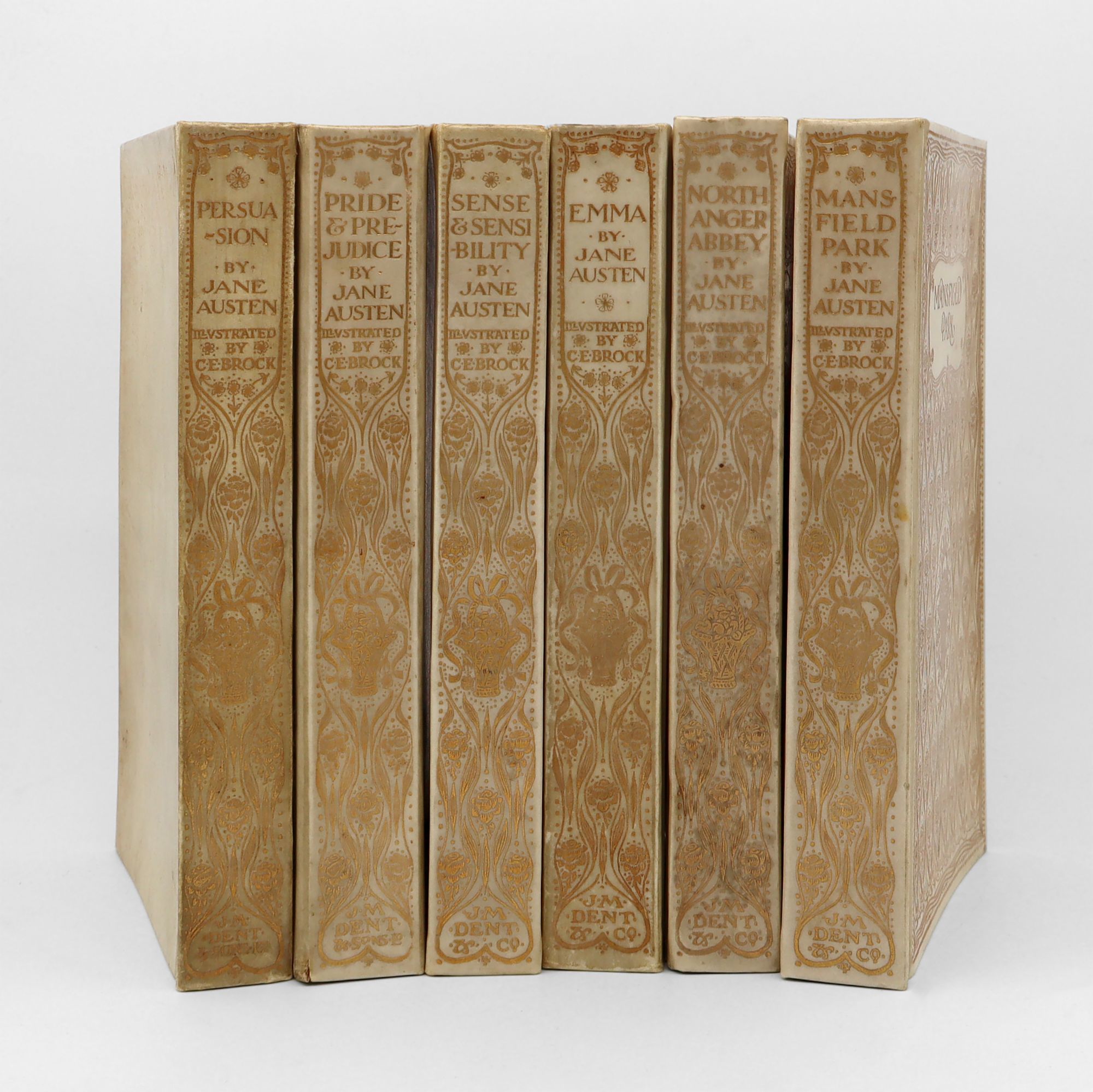 London; New York: J. M. Dent & Co.; E. P. Dutton & Co, 1907. First Brock editions of the complete novels of Jane Austen. Each volume with 24 colour plates by C. E. Brock. 8vo. Original gilt decorative vellum, top edges gilt, others untrimmed, pictorial endpapers. Near Fine, in custom cloth slipcases. Brock, C. E. First Brock editions of the complete novels of Jane Austen. Each volume with 24 colour plates by C. E. Brock. 8vo. C. E. Brock (1870-1938) first appeared as an illustrator of Jane Austen within Macmillan’s 1895-7 Illustrated Standard Novels series (with introductions by Austin Dobson), Brock illustrating only Pride and Prejudice, and Hugh Thomson illustrating the other 5 titles. This series was only illustrated in black and white, which better suited Thomson’s skilful use of line. A decade later, J.M. Dent, realising Brock’s potential as a colourist, commissioned him to redo the Pride and Prejudice suite, this time in colour, and to create colour illustrations for the other five Austen titles. Dent’s “Series of English Idylls” thus presents the first Brock illustrations for the complete Austen set and the first in colour. Brock was elected as a member of the Royal Institute of Painters in Watercolour in 1908, and certainly his vision of Austen’s world, its gentle graces and sharp ironies, is best expressed, as here, in colour. Furthermore, the colourful costumes and interior decor depicted in these illustrations are reputedly accurate to the Regency period, for Charles Brock and his brother Henry collected antique furniture and clothing so that their friends and relations could model for the artists in their Cambridge studio.