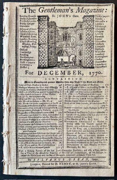 St. John's Gate, London: D. Henry, 1770. Original wraps. Very Good. An historic, full-page trial report in this Dec. 1770 issue of the Gentleman's Magazine (of London), in which it's reported British Captain Thomas Preston was defended by none other than John Adams -- and ultimately acquitted in the October 1770 trial of all charges leveled against him for presiding over the March 5th 1770 "Boston Massacre". Beyond this there's a notable fold-out, nicely-engraved map of Constantinople ("A Plan of Constantinople, Places adjacent and Canal of the Black Sea") appearing in this issue. Wear along the spine, covers lacking, still though bright and very presentable.