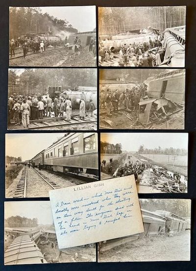 Charleston, SC, 1920. Photograph. Near Fine. A collection of 9 original, detailed photographs --each stamped "Lillian Gish" at the rear-- of a serious 1920 train wreck outside of Charleston, SC involving Lillian's sister actress Dorothy Gish and their mother. To quote the handwritten description on the back of one of the photographs: "A train wreck in which Mrs. Gish and Dorothy were involved when they were on their way South for the shooting of a film ("Little Miss Rebellion"). The engineer died with his head in Mrs. Gish's lap as she was trying to comfort him." Ironically, Dorothy had taken part in a major staged train crash in her last film (1919's "Broken Blossoms") but this, sadly, was an actual event. The 9 photographs, each measuring 6" wide x 4 1/4" tall, are all crsp, bright and well-preserved. A macabre piece of Hollywood history, one-of-a-kind nonetheless (the images. taken by an unlnown photographer, probably never reproduced).