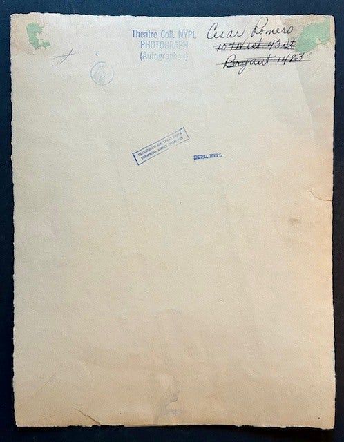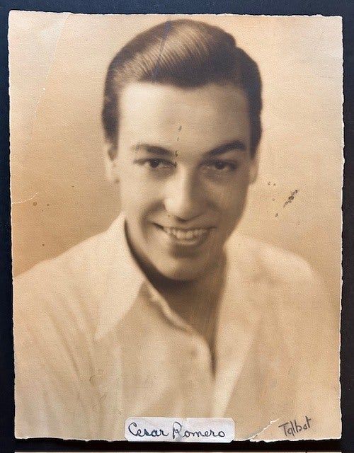 Photograph. Very Good. Wonderful early gravure portrait photograph of the great Cesar Romero (immortalized for his original portayal of "The Joker"), probably taken by German-Australian photographer Henry Talbot (1920-1999) in the early to mid 1940s (signed "Talbot" in the photo). ALSO INCLUDES A PASTED-ON INK SIGNATURE OF CESAR ROMERO along the photograph's bottom-edge. At the rear, the stamp of "Theatre Coll. NYPL PHOTOGRAPH (Autographed)" along the top-edge and, below it, a "DUPL. NYPL" stamp appears. And finally, Cesar Romero's name and address (partly crossed out, probably secretarial) also appear at the rear. The photograph is bright and crisp, with several spots of light soiling and creasing, and two tiny closed tears along the edges. It measures 13" tall x 10" wide in its original card stock and casts the immensely talented young actor in an earnest, appealing light.
