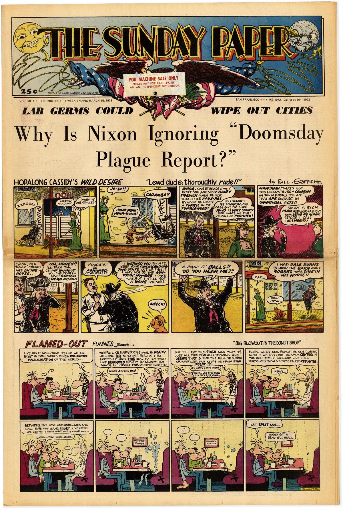 San Francisco: The Sunday Paper, Inc, 1972. First Edition. Tabloid (58cm); original color-pictorial newsprint wrappers; 8pp; illus., together with the 16pp supplement section (printed in black & white) laid in. Horizontal fold at center (as issued), very faint vertical bend, with a small "For Machine Sale Only" sticker mounted to upper front wrapper; a bright, Near Fine issue, with a Near Fine supplement.