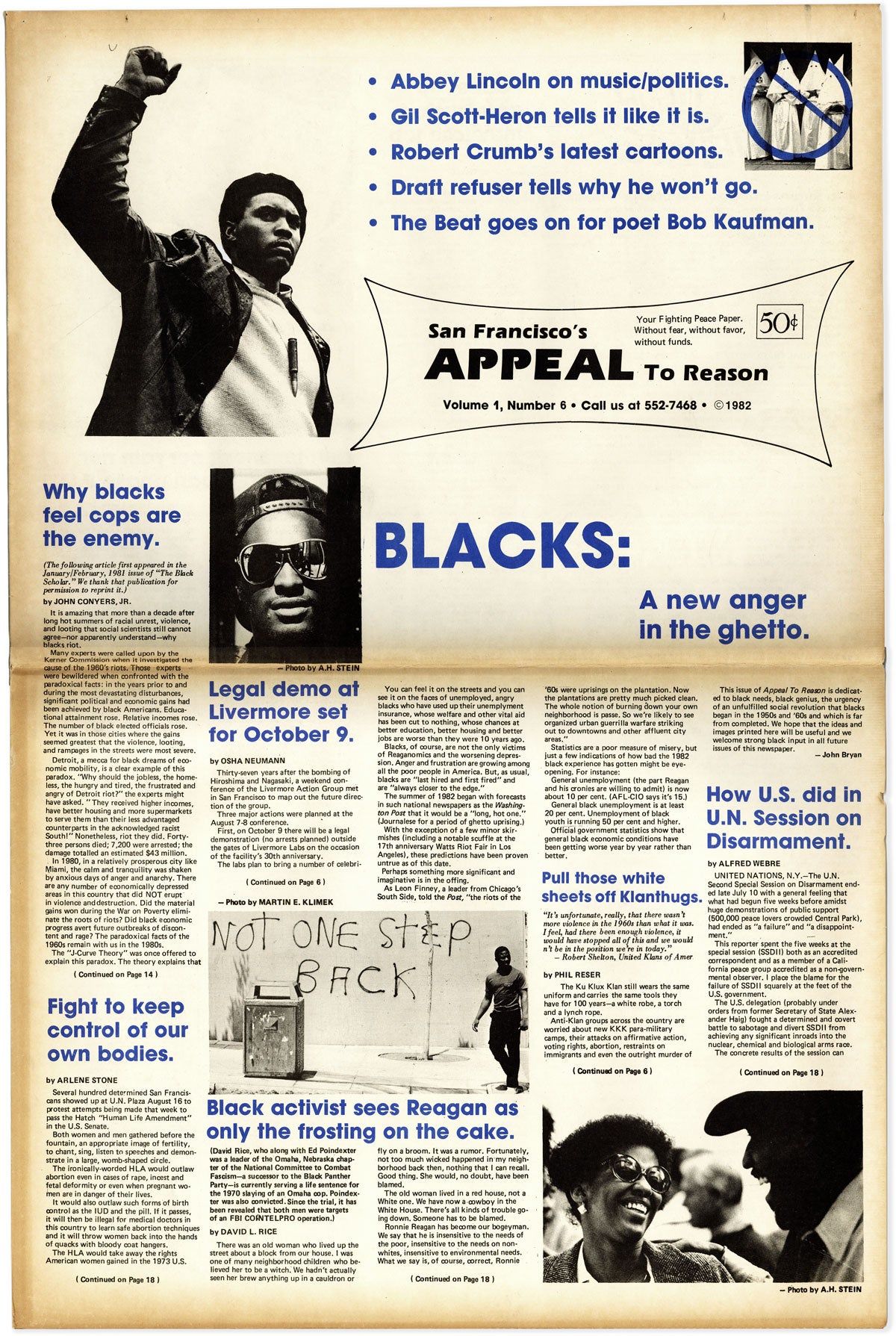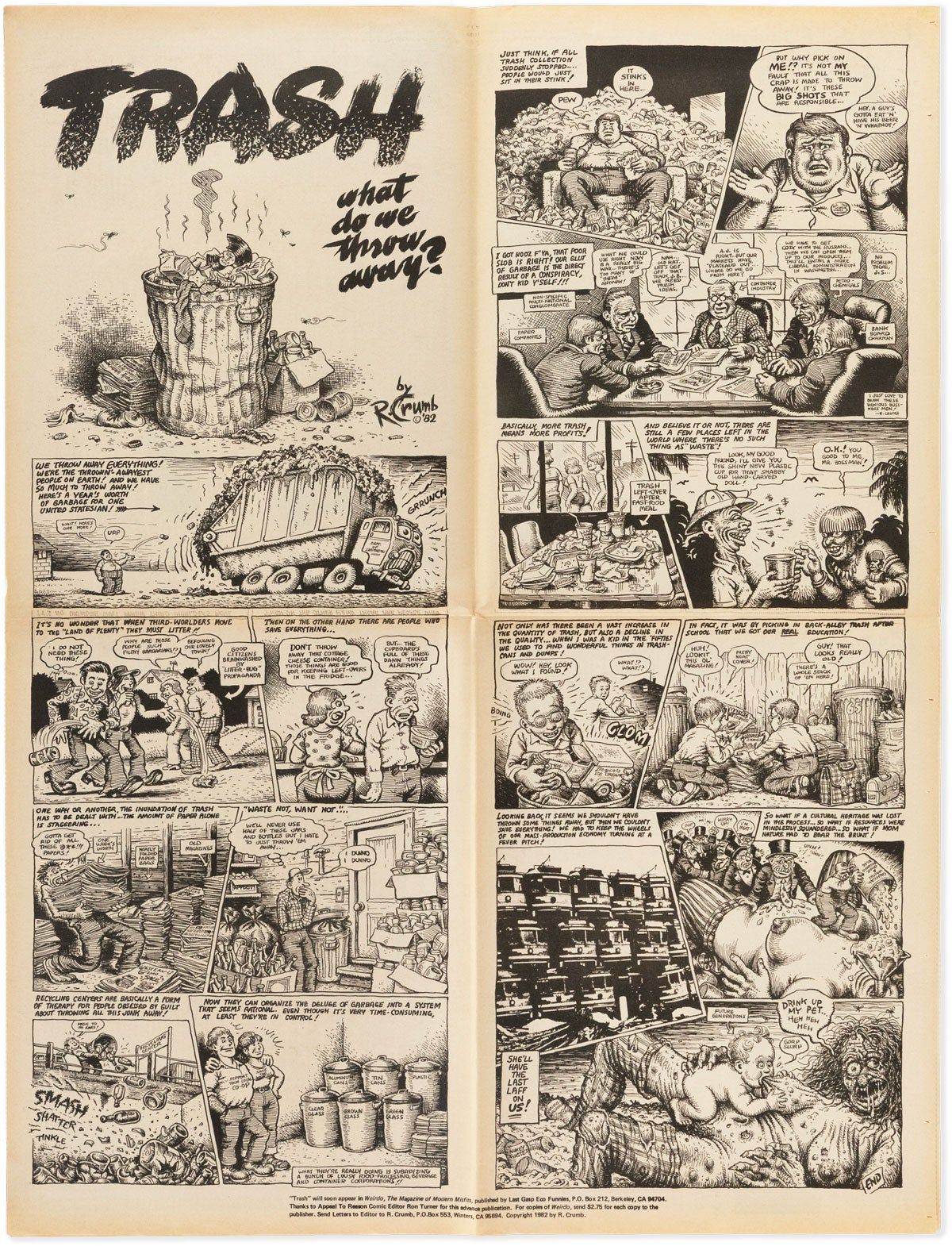 Between 1982-1984, John Bryan irregularly published 16 issues of a newspaper called San Francisco's Appeal To Reason, containing a mix of anti-establishment writing, local reportage, and a clear focus on peace and draft resistance. Contents of this issue are heavily oriented towards issues facing the Bay Area's Black residents. It includes contributions by Ishmael Reed, Bob Kaufman (his poems, and a big spread about his life and work), Jack Micheline, Margo St. James, an interview with Gil Scott-Heron, and a mammoth (23" x 30") centerfold spread by R. Crumb called "Trash: what do we throw away?" (soon to appear in Weirdo: The Magazine of Modern Misfits).