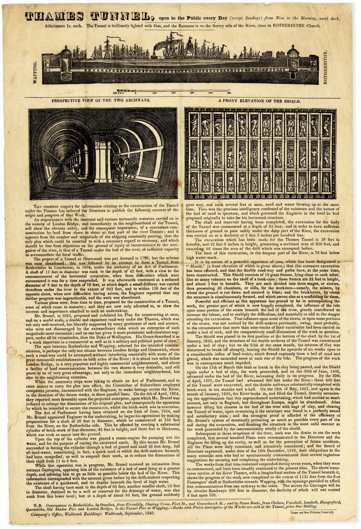 Produced by Teape and Sons, using their original woodcuts; depicting a transverse view of the tunnel running under the Thames, a perspective view of the tunnels running side by side (notably showing horse traffic, something that was not permitted once the tunnel had opened), and view of Marc Brunel's "Shield"; the compartmentalised mobile excavation gallery that allowed the digging of the tunnel to progress with an unprecedented degree of safety. Teape re-used these woodcuts on a number of pieces regarding the tunnel, and they were additionally used by later printers in their publications. The Brunel tunnel was built between 1825 and 1843, being at various points a foot tunnel, a shopping street and novelty venue, before eventually becoming part of the London Underground network after its sale into the rail industry after 1860. An interesting piece of British industrial history.