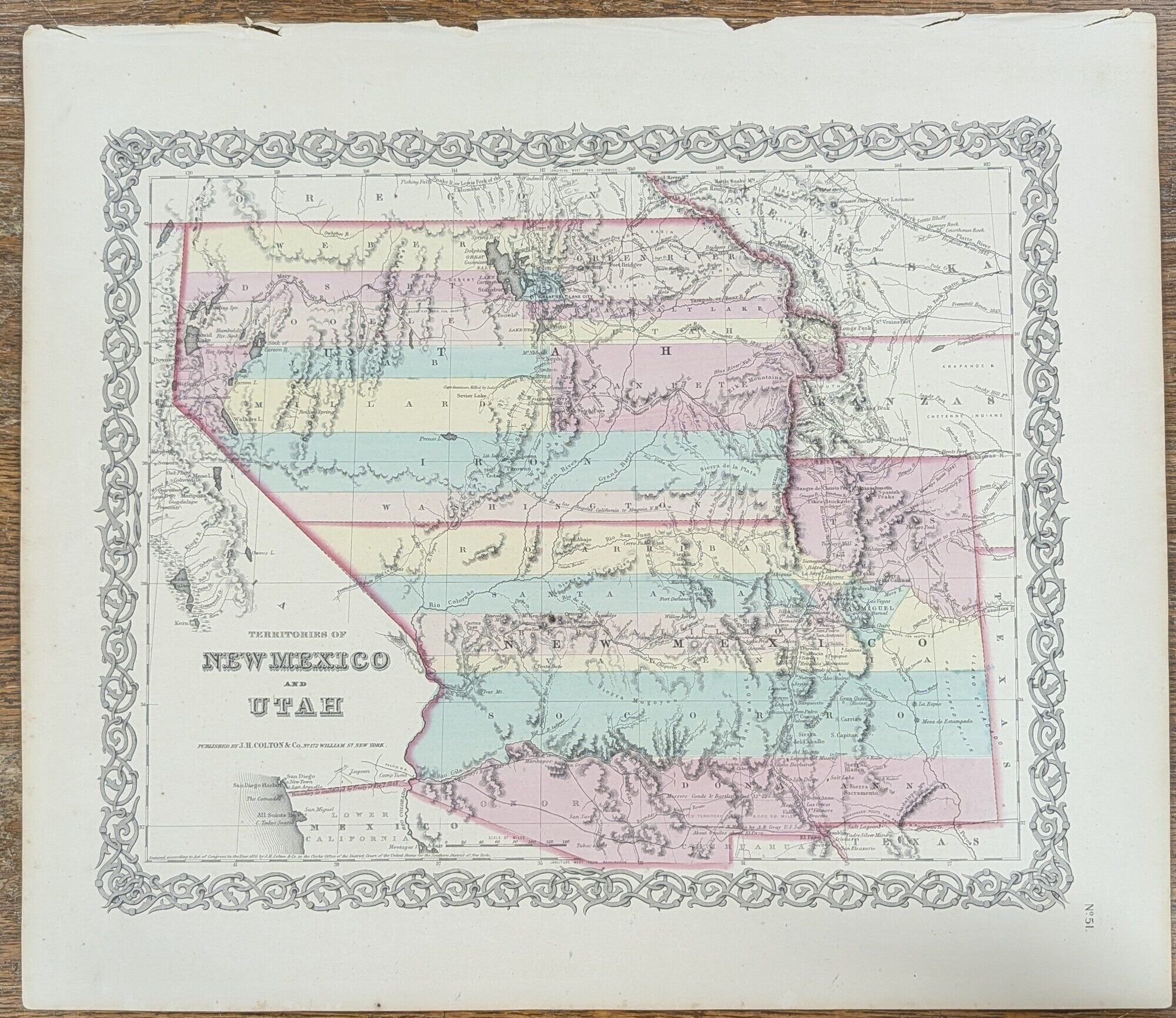 New York: J. H. Colton & Co (172 William St.), 1855. Map. Very Good. Map [18" by 16"] with decorative borders. With one page of informational text. Margins of map and text with intermittent closed and open edges. No. 51 from "Colton's Atlas of the World." Moffat 39. Wheat 832. Counties colored as they existed in 1855. Illustrates natural features, populated places, proposed railroad routes, and explorers' routes. Moffat points out, "Fillmore City is the capital. Shows Fremont's routes, the Spanish Trail, and 'route explored for Pacific RR.' Sevier Lake is called Nicolette Lake and is shown to be dry. 'Preuss Lake' is out on the Escalante Desert.
