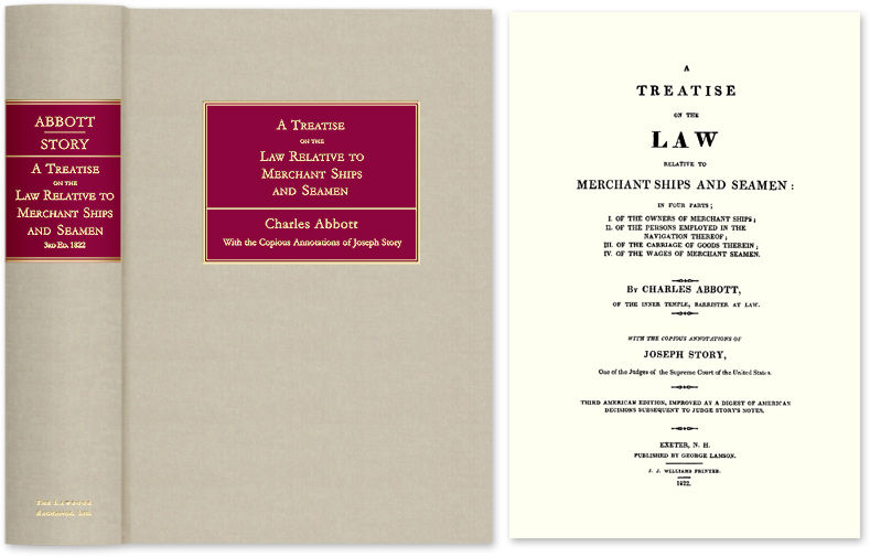 2008. ISBN-13: 9781584778233; ISBN-10: 1584778237. "A Legal Classic of High Character" Abbott, Charles. A Treatise on the Law Relative to Merchant Ships and Seamen: In Four Parts; I. Of The Owners of Merchant Ships; II. Of the Persons Employed in the Navigation Thereof; III. Of the Carriage of Goods Therein; IV. Of the Wages of Merchant Seamen. With the Copious Annotations of Joseph Story. Originally published: Exeter, N.H.: Published by George Lamson, 1822. xxvii, [1], 668, xxviii pp. Reprinted 2008 by The Lawbook Exchange, Ltd. ISBN-13: 9781584778233. ISBN-10: 1584778237. Attractive tan cloth smyth sewn hardcover with gilt stamped red panels to spine and front cover. New. $135. * Reprint of the third American edition. Abbott's treatise is "a legal classic of high character." This edition enriched by Joseph Story's scrupulous and impressive scholarship evident in his own notes, often mini-essays in their own right, kept separate from Abbott's. Marvin 47. First published in 1802, it was the first English treatise devoted exclusively to the law of shipping.