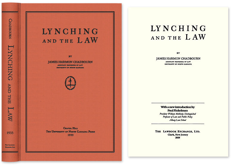 2008. ISBN-13: 9781584778295; ISBN-10: 1584778296. An Influential Treatise on Lynching Chadbourn, James Harmon. Lynching and the Law. Originally published: Chapel Hill: University of North Carolina Press, 1933. xiv (iii-xiv new Introduction), iii-xi, 221 pp. Reprinted 2008 by The Lawbook Exchange, Ltd. With a new introduction by Paul Finkelman, President William McKinley Distinguished Professor of Law and Public Policy, Albany Law School. ISBN-13: 9781584778295; ISBN-10: 1584778296. Hardcover. New. $65. * This title was issued under the auspices of the Southern Commission on the Study of Lynching. A work of great authority because it was produced by Southern jurists, it was cited frequently in the 1932 Senate hearings on lynching. Its conclusions are based in part on a comprehensive survey of over 3,700 lynchings, mostly of African-Americans, between 1889 and 1932. Chadbourn also asked 1,000 prominent Southern lawyers and legislators how they would prevent the practice. Using this data he proposes a model lynching law. "This excellent monograph and the proposed statute have unusual significance in view of the present possibility of further state and national legislation dealing with this urgent problem.": H.C. Brearley, Social Forces 12 (1933-34) 610.