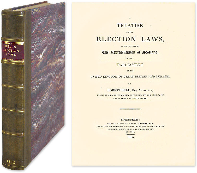 1812. Scarce Scottish Treatise on Election Law Bell, Robert [d. 1816]. A Treatise on the Election Laws, As They Relate to the Representation of Scotland, In the Parliament of the United Kingdom of Great Britain and Ireland. Edinburgh: Printed by George Ramsey and Company, 1812. xi, 523, cxi pp. Quarto (10-1/2" x 8-1/2"). Recent period-style quarter calf over marbled boards, raised bands and lettering piece to spine, endpapers renewed. Toning to text, internally clean. A handsome copy. $350. * Only edition. With side-notes. This treatise is notable because it reflects contemporary debates about the extension of suffrage. An important figure in the history of Scots law, Bell was an advocate and professor of conveyancing to the Society of Writers to the Signet. He is known today as the author of The Dictionary of the Law of Scotland (1807) and several other treatises on Scots law, especially leases and conveyancing. OCLC locates 4 copies, 3 in North America (at Thomas Fisher Rare Book Library, Ontario, Cornell University and Georgetown University Law Library), COPAC locates 3. Sweet & Maxwell, A Legal Bibliography of the British Commonwealth 5:11.