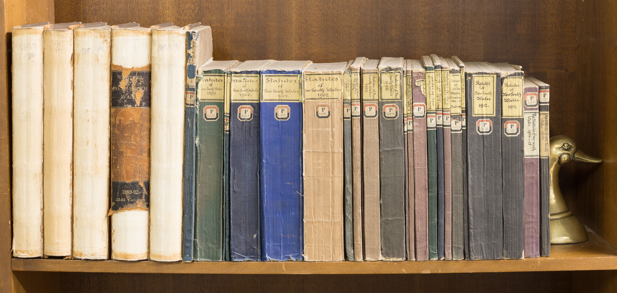 1915. [New South Wales]. The Statutes of New South Wales (Public and Private) [1879-96, 1899-1915]. Sydney: Reprinted by George Stephen Chapman, Acting Government Printer, 1891-1915. 29 volumes in all. Folio, Quarto and Octavo formats. Volumes from 1879-95 are quarter calf over cloth, others are quarter cloth over printed boards with early hand-lettered spine labels. Worn, backstrips lacking from 1879-95 volumes, moderate soiling, internally clean. Ex-library. Location labels to spines, small stamps to title pages. Solid. $350. * These volumes are from a series that began in 1851. All of these volumes are uncommon in the trade. Sweet & Maxwell, A Legal Bibliography of the British Commonwealth 6:74-75.