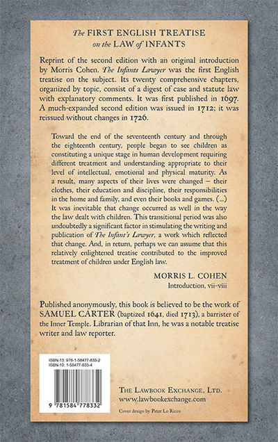 2008. ISBN-13: 9781584778332; ISBN-10: 1584778334. First English Treatise on the Law of Infants [Carter, Samuel]. The Infants Lawyer: Or the Law (Ancient and Modern) Relating to Infants. Setting Forth Their Priviledges; Their Several Ages for Divers Purposes; Guardians and Prochein Amy, As to Suits and Defences by Them; Actions Brought by and Against Them, With the Manner of Declarations and Pleadings; Fines and Recoveries, And other Matters of Record Suffered or Acknowledged by Them, How Reversable; Conveyances and Specialties, How Bound by Them or Not; Contracts, Promises, &c. Also Treating of Infant-Executors, Administrator Durante Minori Aetate; Actions and Suits Brought by Them and Against Them, With the Manner of Declaring and Pleading. Likewise, Of Devises by and to Infants, Apprentices, Custom of London, And Pleadings, Orphans, Tryals of Infancy, Portions and Legacies, And Resolutions and Decrees at Common Law and Chancery Concerning the Same. With an Appendix of the Forms of Declarations and Pleadings Concerning Infants. With many Additions of Late Adjudged Cases in Common Law and Chancery; and the Explication of All the Late Statutes Relating to Infants. Originally published: London: Printed by J. Nutt, 1712. viii (iii-viii new Introduction), [24], 380, [27] pp. Reprinted 2008 by The Lawbook Exchange, Ltd. With a New Introduction by Morris L. Cohen [1927-2010], Professor of Law, Yale Law School. ISBN-13: 9781584778332. ISBN-10: 1584778334. Hardcover. New. $44.95 * Reprint of the second edition. First published in 1697, this is the first English treatise on the subject. Its twenty comprehensive chapters consist of a digest of the case law relating to each topic with explanatory comments. Holdsworth notes that "[i]t was a useful book to practitioners since it covers all the topics connected with its subject" (History of English Law XII:399-400).