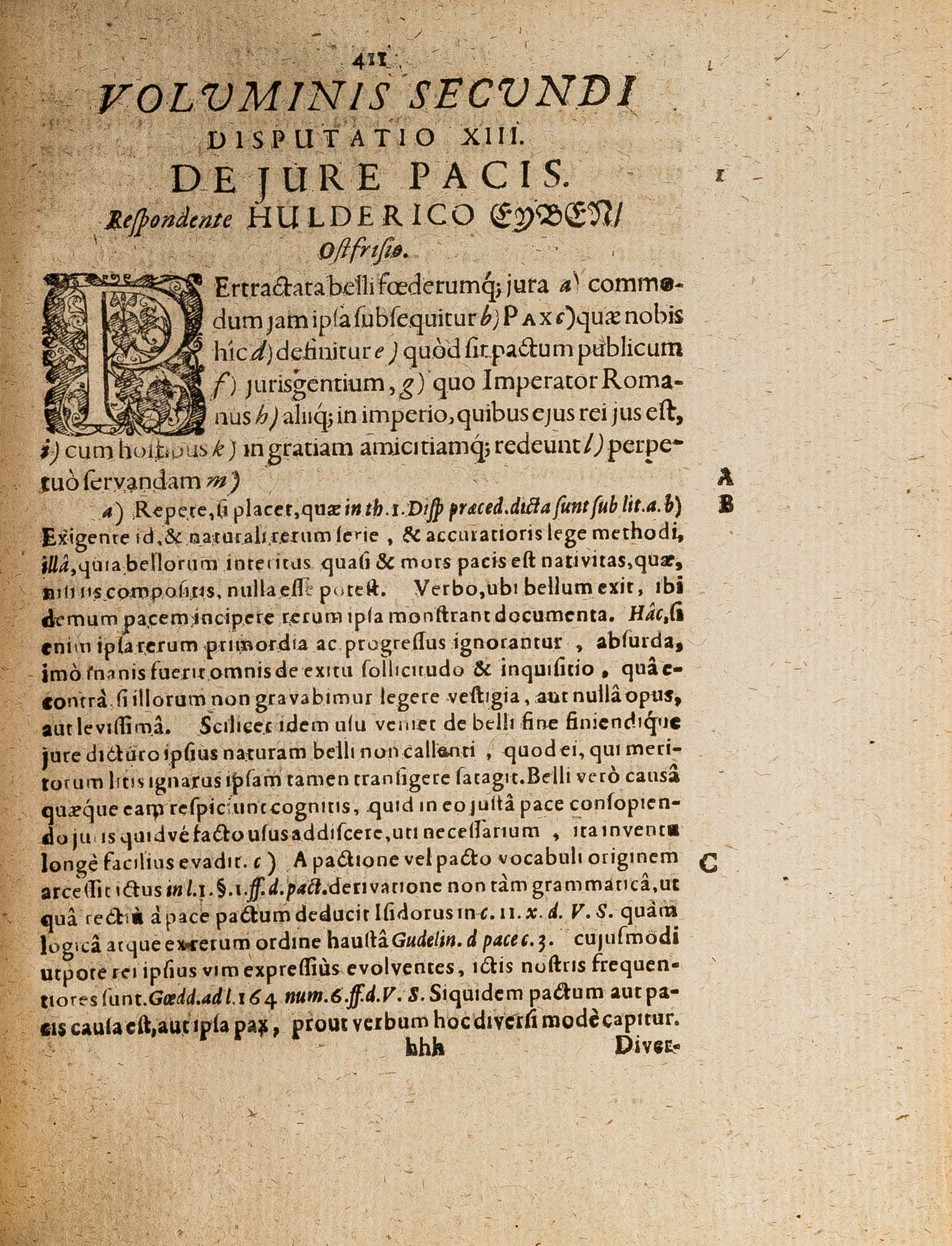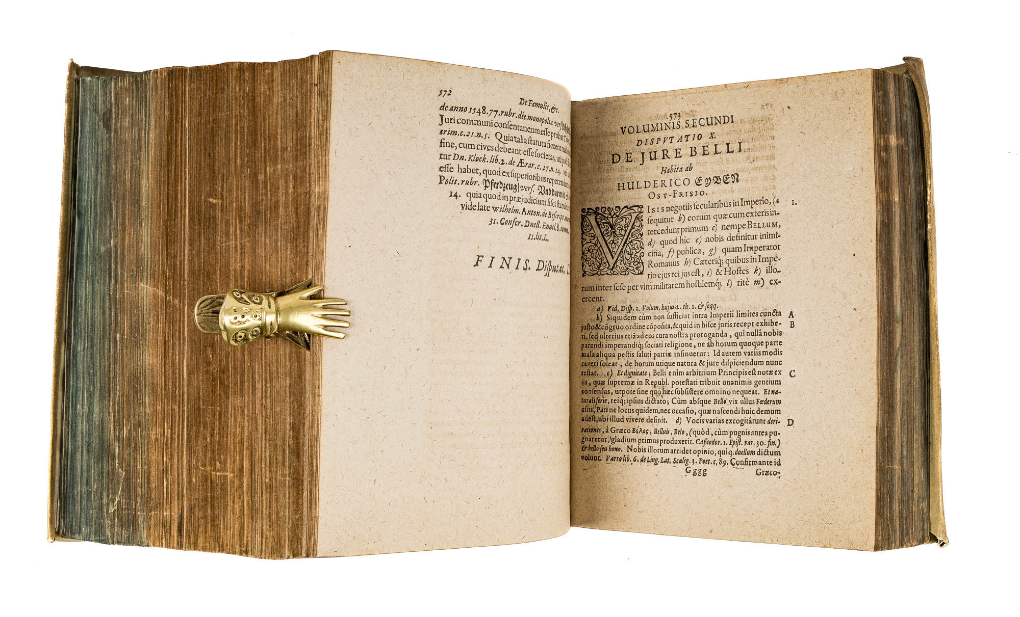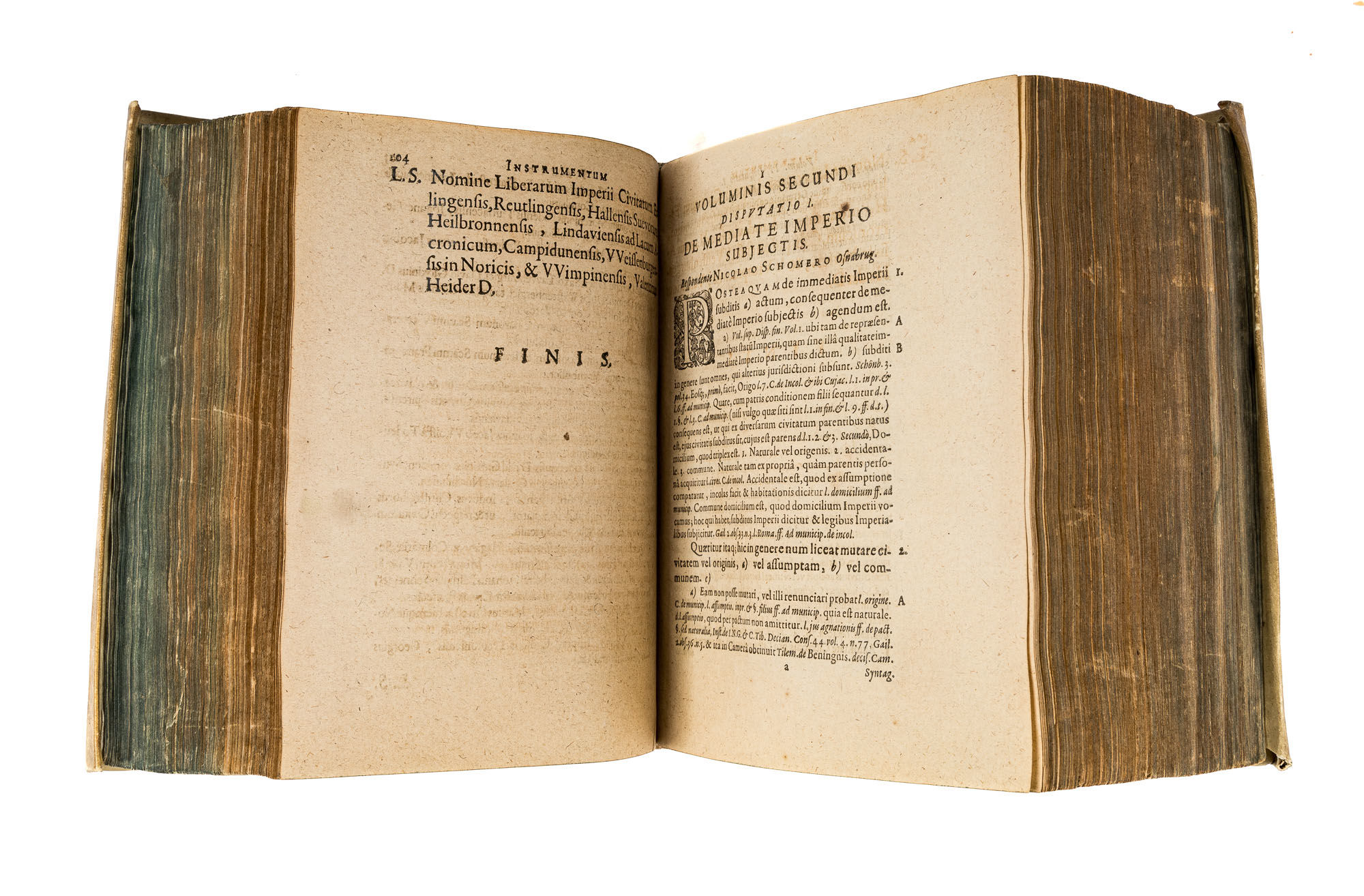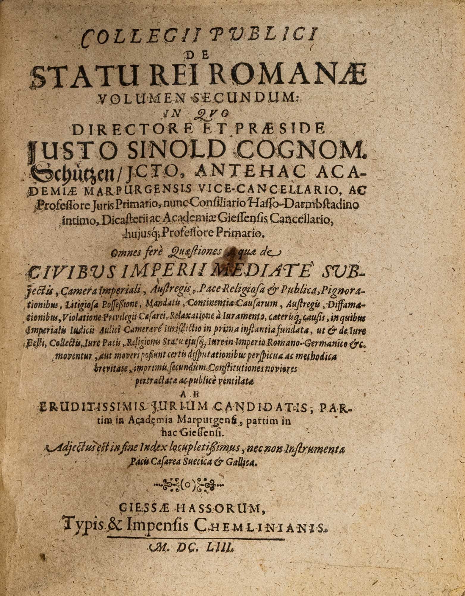 1654. A Sammelband Owned by a Notable Seventeenth-Century Lawyer and Legal Scholar Bouwens, Andreas [d. circa 1672]. Iuris Iustitiaeque Usus et Abusus: Exemplis et Documentis ex Omni Aevo Demonstrati. Opus non Tantum Synedris, Omnibusq Nomothetis, Sed & Concionatoribus Utilissimum. Liege: Ex Officina Typographica Henrici & Ioannis Mathiae Hoviorum, 1654. [xxxii], 465, [14] pp. [Bound with] [Sinold Schutz, Justus S. (1592-1657)]. Collegii Publici de Statu Rei Romanae Volumen Secundum. Giessen: Typis & Impensis Chemlinianis, 1653. [viii], 540 pp. Quarto (7-1/2" x 6"). Contemporary vellum with yapp edges, early hand-lettered title to spine. Moderate soiling, spine somewhat darkened, minor rubbing to extremities, rear hinge just starting at head. Title page of Bouwens printed in red and black. Toning, light browning in places. Tiny later owner signature of Johann Conrad Causenius to title page of Bouwens, interior otherwise clean. $350. * Only editions. Bouwens, a native of Louvain, was a lawyer and state official in Liege. He ended his career in the service of that city's Prince-Archbishop. Iuris Iustitiaeque, his only publication, is a comprehensive treatise on judicial administration, the practice of law and judges in Roman law. Collegii Publici is an anthology of dissertations presented to Sinold Schutz at the Universities of Marburg and Giessen. The subjects of these dissertations include Roman law, treaties, the Thirty Years' War and procedure. Complete in itself, this is the second and final volume of De Statu Rei Romanae, a work published in 1641. Causenius [1601-1676] was a notable German lawyer and legal scholar. He was probably the person who compiled this sammelband. Bouwens: OCLC locates 14 copies, 1 in North America (UC-Berkeley Law School). Dekkers, Bibliotheca Belgica Juridica 24; Sinold Schutz: OCLC locates 17 copies, 1 in North America (Duke University). Das Verzeichnis der im Deutschen Sprachraum Erschienenen Drucke des 17. Jahrhunderts 1:019326Z.